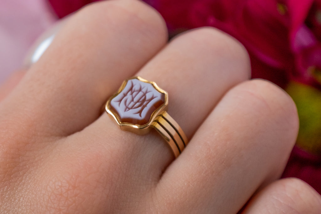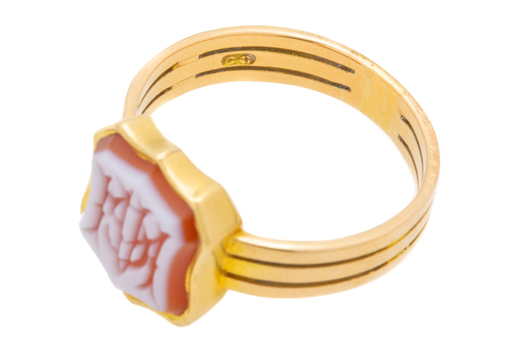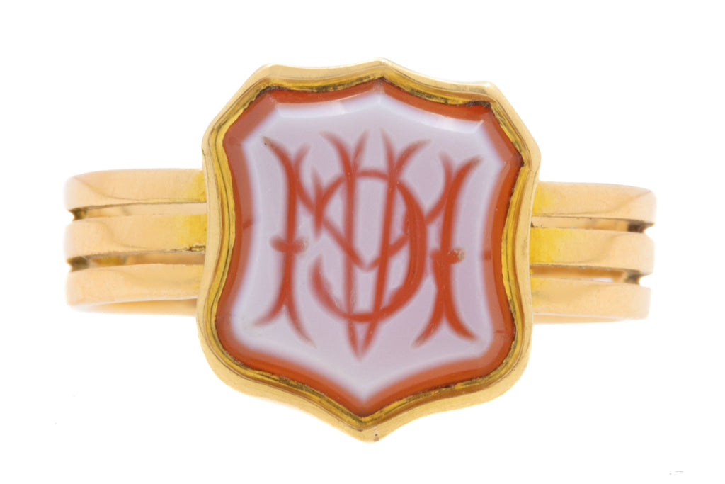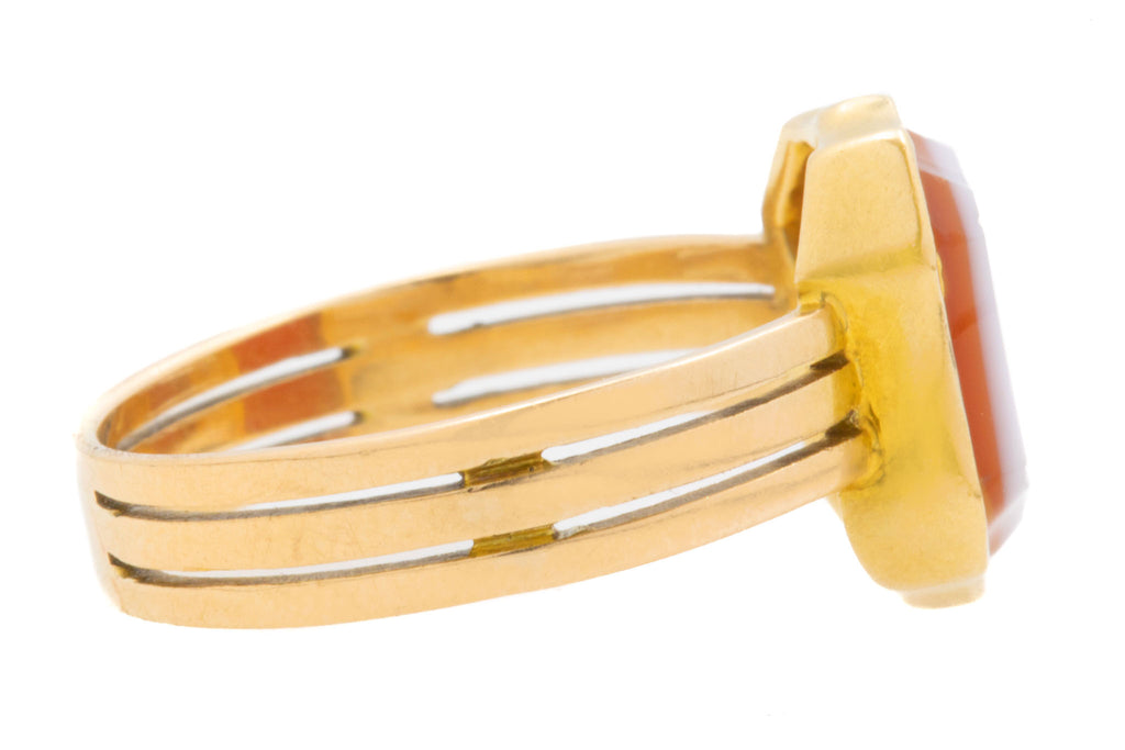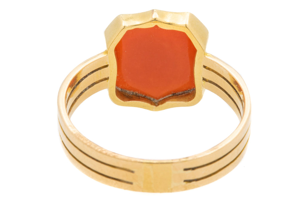 VERY GOOD. This beautiful antique 15ct Gold Sardonyx signet ring is in very good condition. The ring has a lovely triple band style and a securely set Sardonyx stone in a lovely shield design. The engraved stone is crisp and has gorgeous colouring. The hallmarks are obscured but the Gold has been tested and confirmed as 15ct.