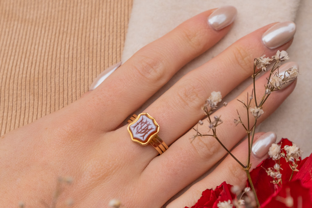 MATERIALS: Tests as 15ct Gold, Sardonyx.