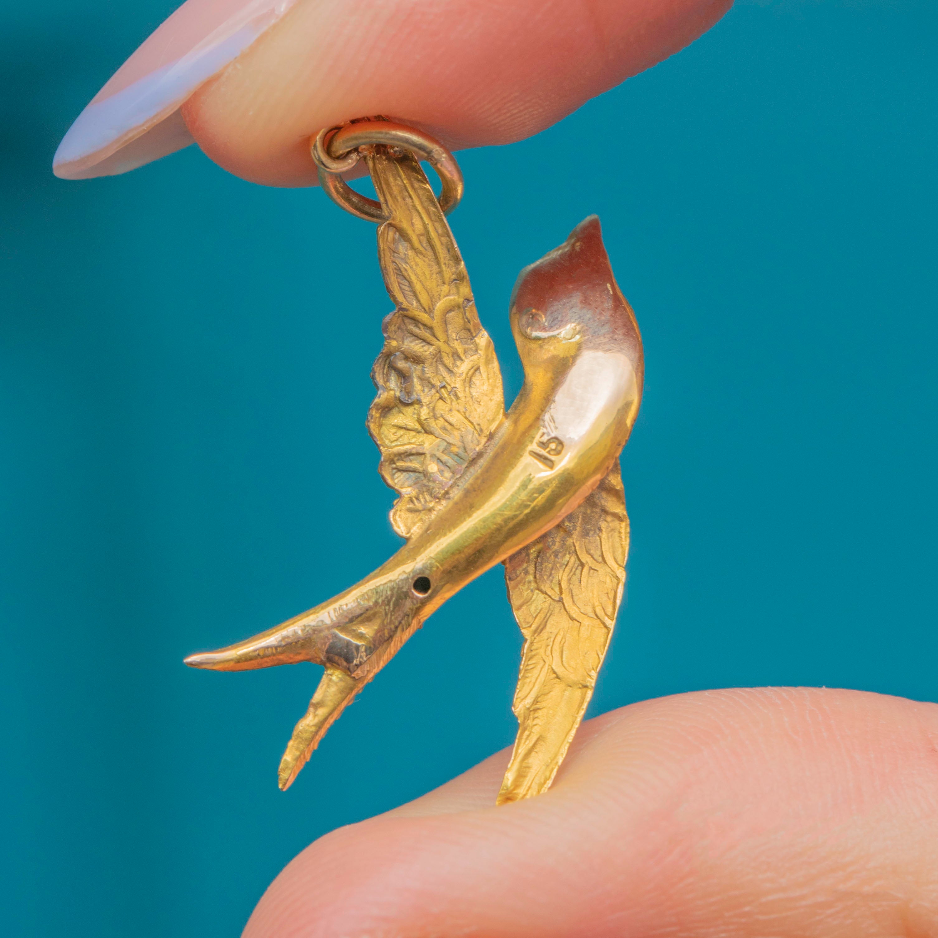 VERY GOOD-EXCELLENT: This antique 15ct Gold swallow pendant is in wonderful condition. The Gold is bright and buttery and though there is some minor discolouration commensurate with age, this is difficult to spot when wearing. With a securely soldered jump ring, you can wear this Victorian pendant with confidence!