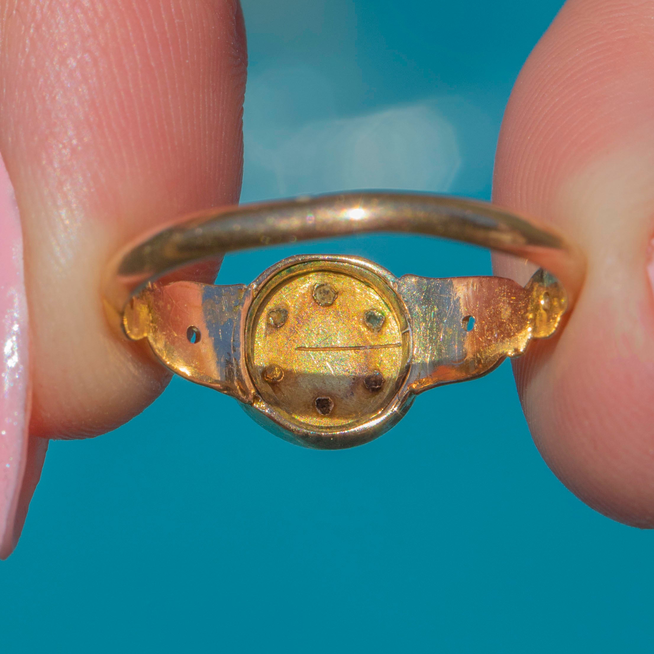 MATERIALS: Tests as 15ct Gold, Turquoise, Rose-cut Diamond.