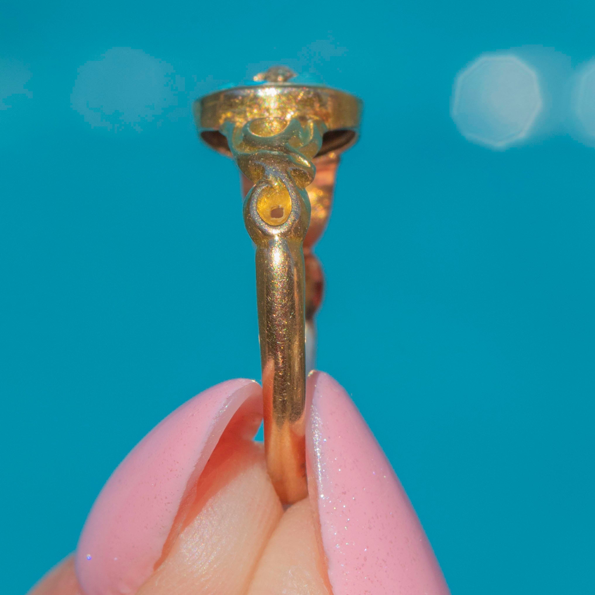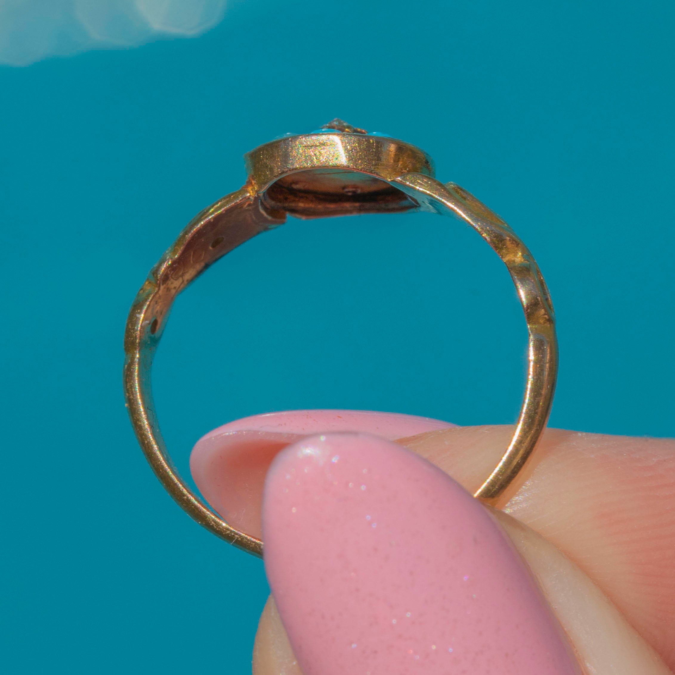 We adore her naturally differing Turquoise hues which emulate a sweet forget-me-not flower, encased within buttery antique 15ct Gold. Bring a pop of colour to your outfit with this striking Victorian ring adorning your finger!
