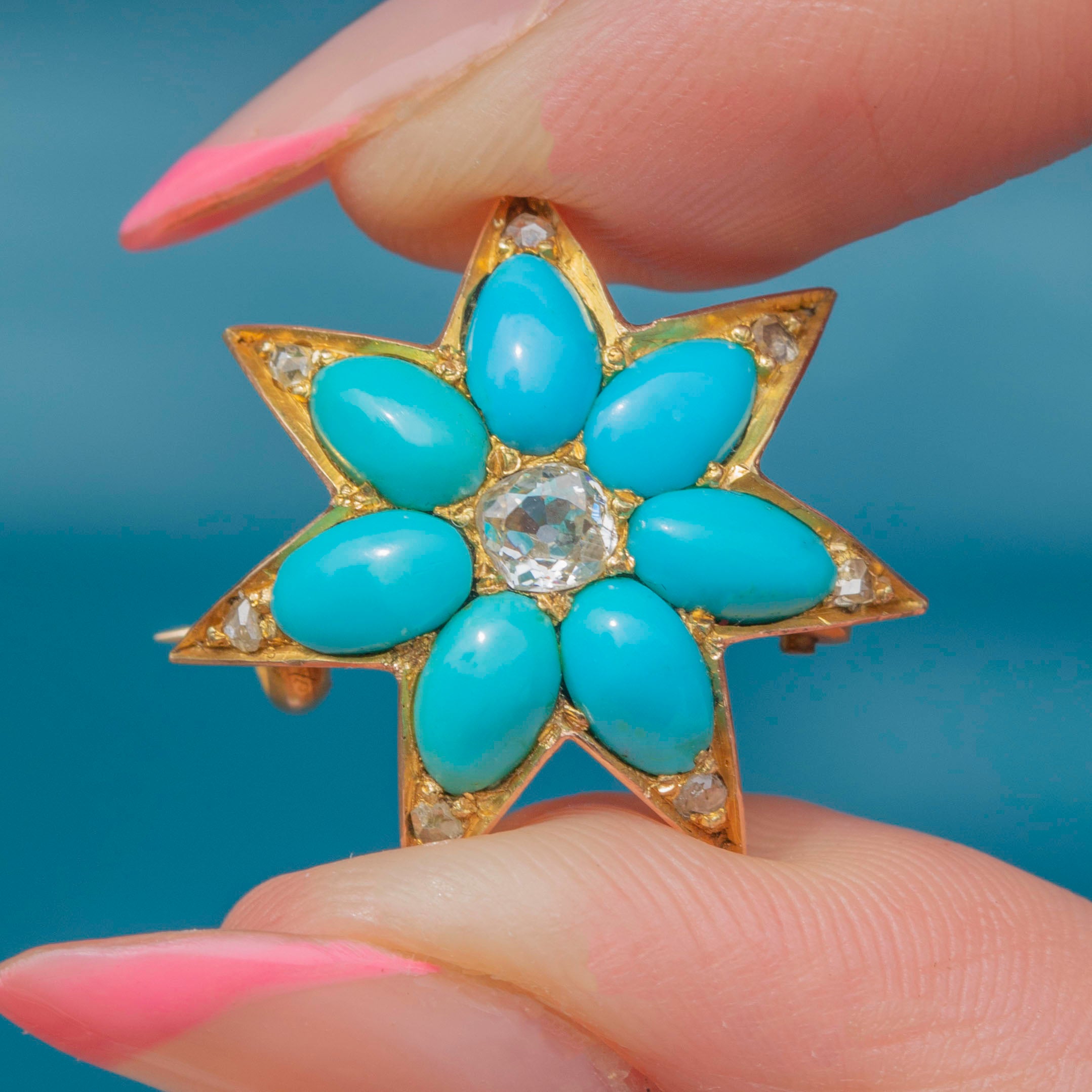 VERY GOOD-EXCELLENT: This antique 15ct Gold Turquoise Diamond star brooch is in wonderful condition. The gemstones are all present and securely set, with no visible chips or surface marks. The Gold has a gorgeous saturation, with only mild variation in hue on the back of the brooch. The brooch pin is robust, and although it requires a bit of a push, it slots into its c-clasp, allowing you to wear it confidently!