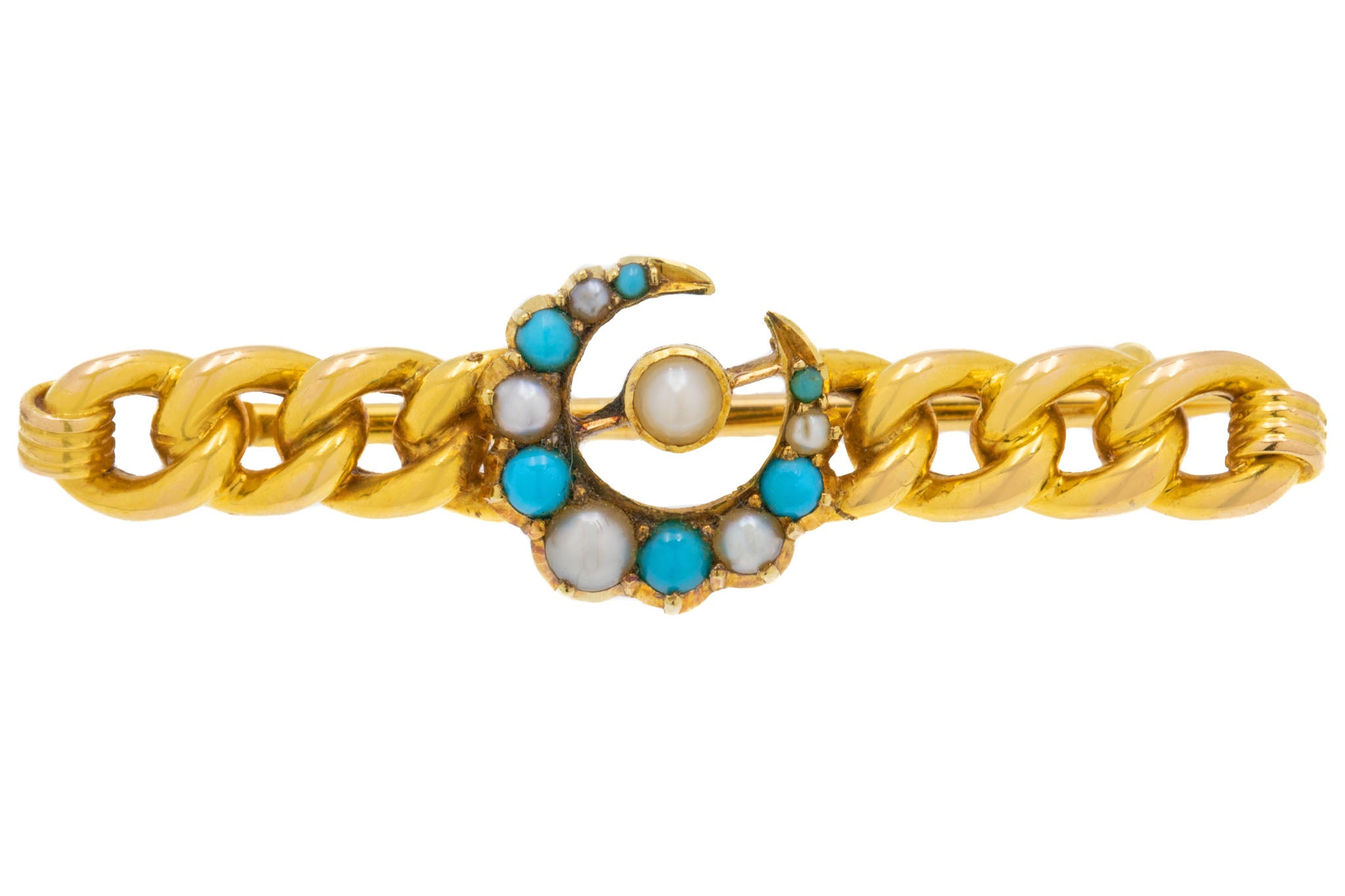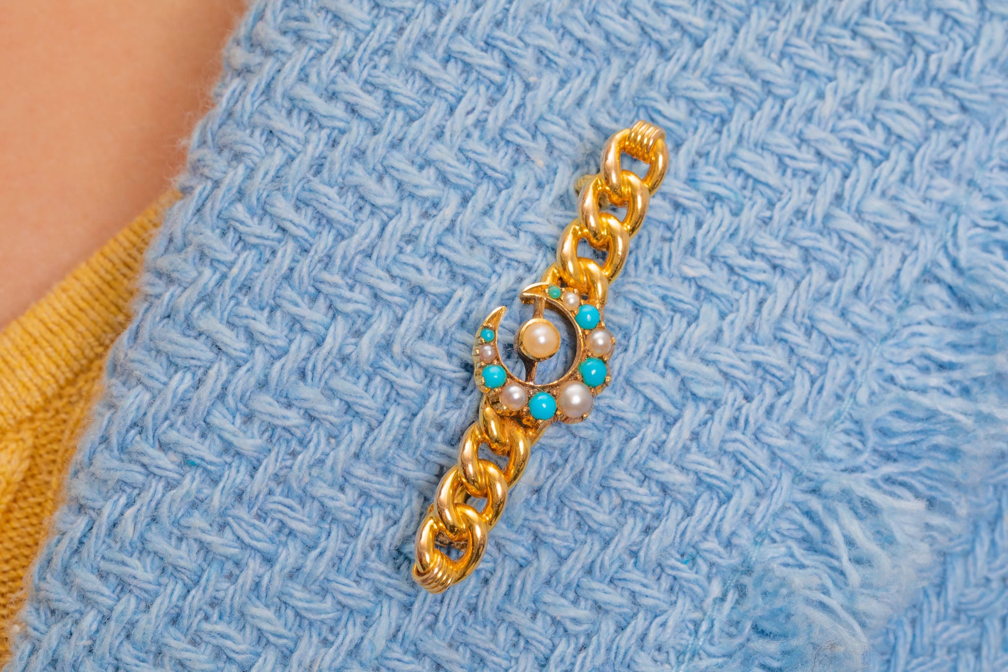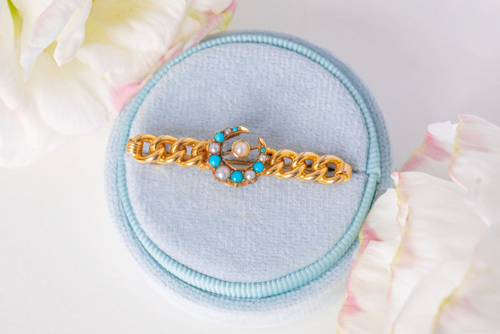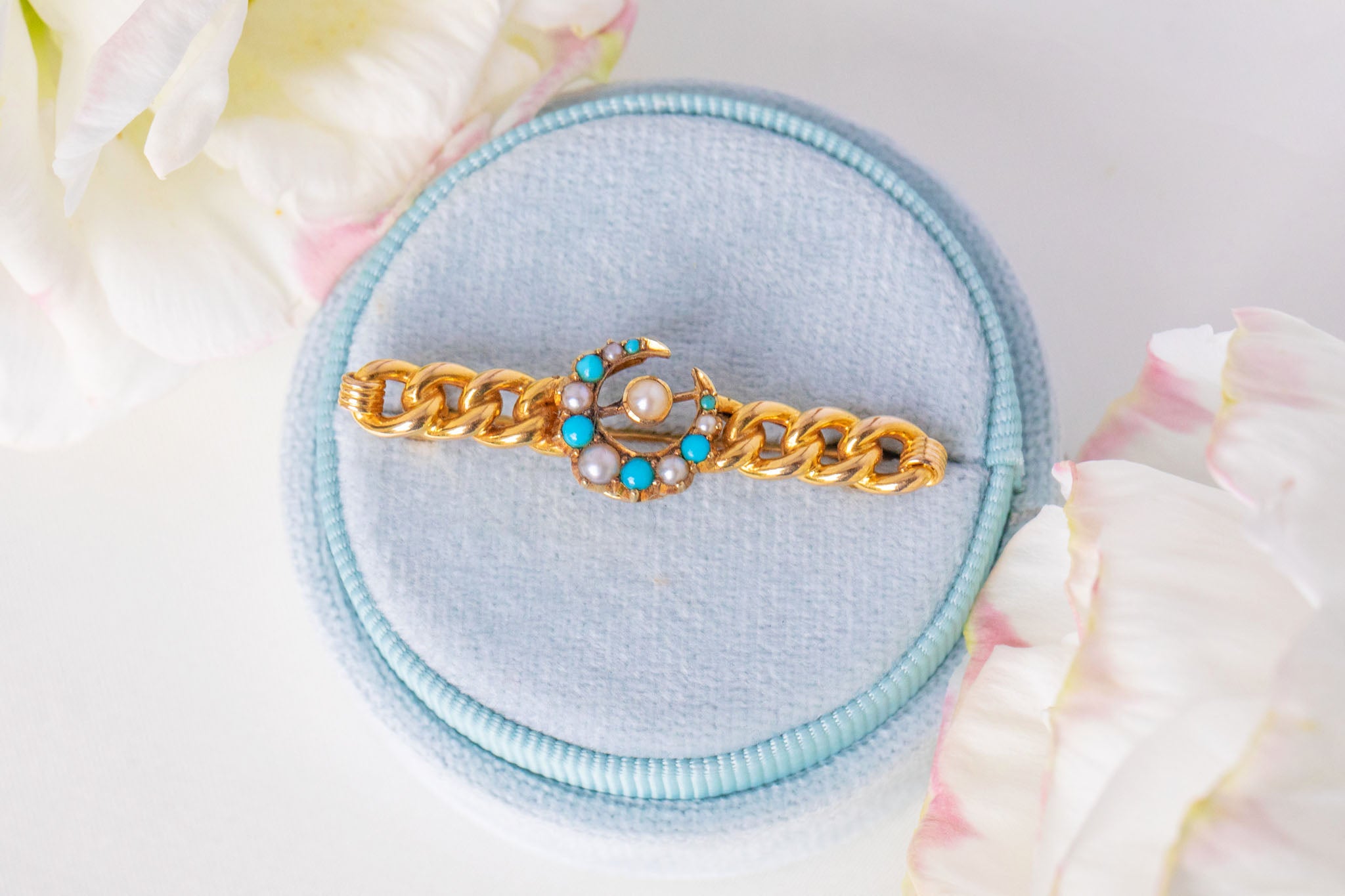 Every inch of this antique 15ct Gold Turquoise Pearl crescent moon bar brooch encapsulates the essence of Victorian jewellery. Nestled between her curvaceous, chunky curb links is a crescent moon, adorned with shimmering Pearls and sea blue Turquoise.