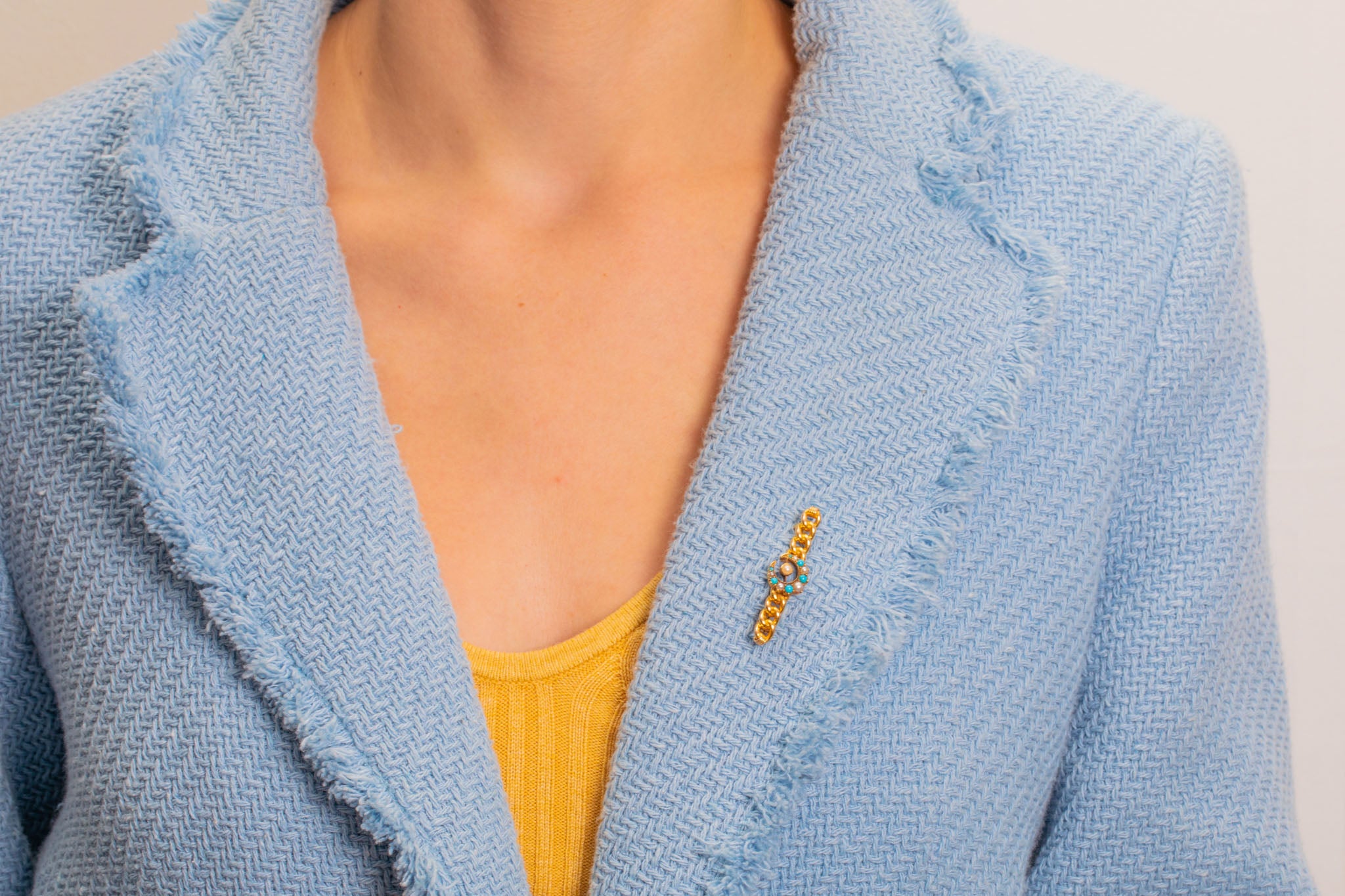 EXCELLENT. We offer you this antique 15ct Gold Turquoise Pearl crescent moon bar brooch in excellent condition! Each curb link is bright, buttery and securely soldered together, forming a solid frame for the bar brooch. The Pearls and Turquoise are securely nestled within their settings with no damage to note. The brooch fixture is in perfect working condition, allowing the brooch to sit safely against your clothing. She is truly a showstopper!