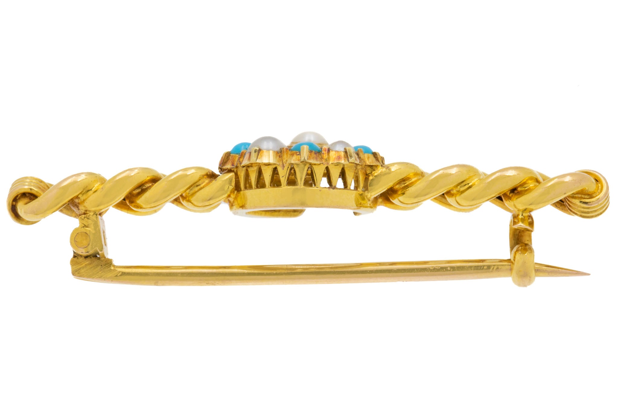 MATERIALS: Tests as 15ct Gold brooch, settings & C-clasp, 9ct Gold pin & hinge, Pearls, Turquoise.