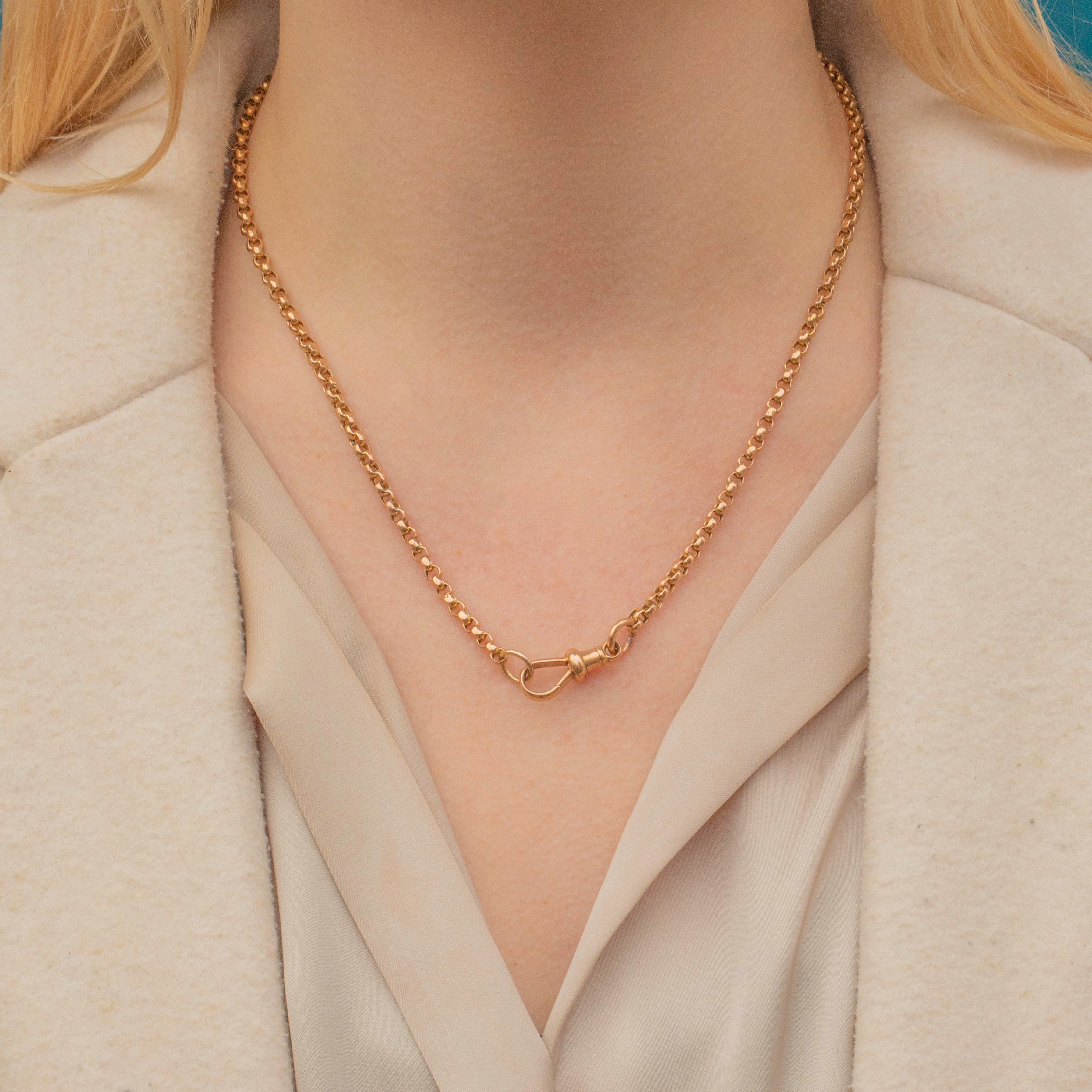 At a desirable 18" in length, this Victorian Gold chain will sit comfortably around your neckline, leaving plenty of room for styling it however you please. Crafted entirely from buttery 9ct Gold, she has gorgeous faceted belcher links, and a highly coveted antique dog-clip to finish.