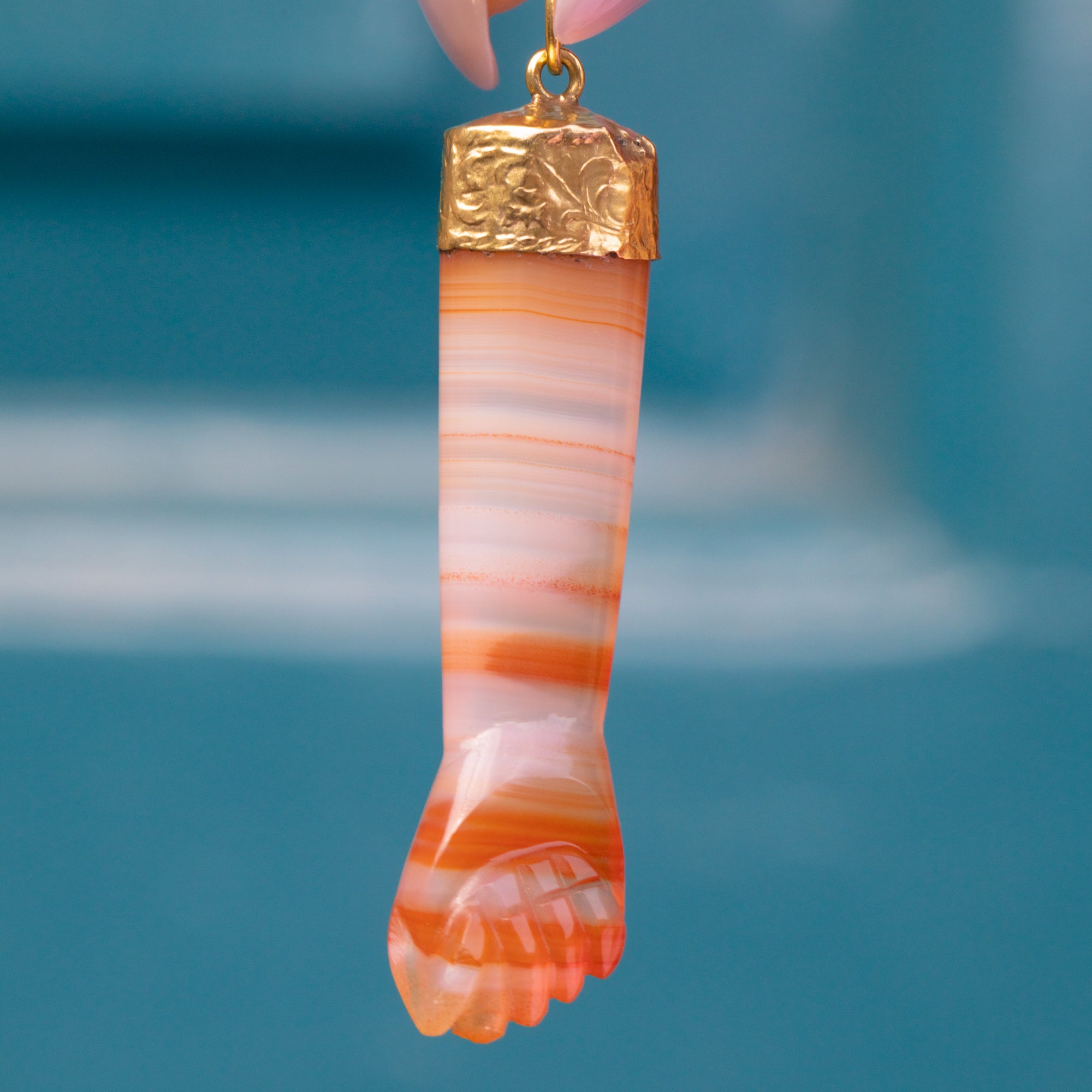VERY GOOD. This antique 18ct Gold Agate figa lucky pendant is in very good condition! The Agate is in good nick, smooth to the touch, and carved with precision. The Gold topper has a rich hue and the floral details are crisp. The Gold has slightly misshapen over time, and there are two pin-prick holes, but these are only noticeable under close inspection and it still holds the Agate securely in place. A unique and collectible piece, this Victorian Figa pendant is just divine!
