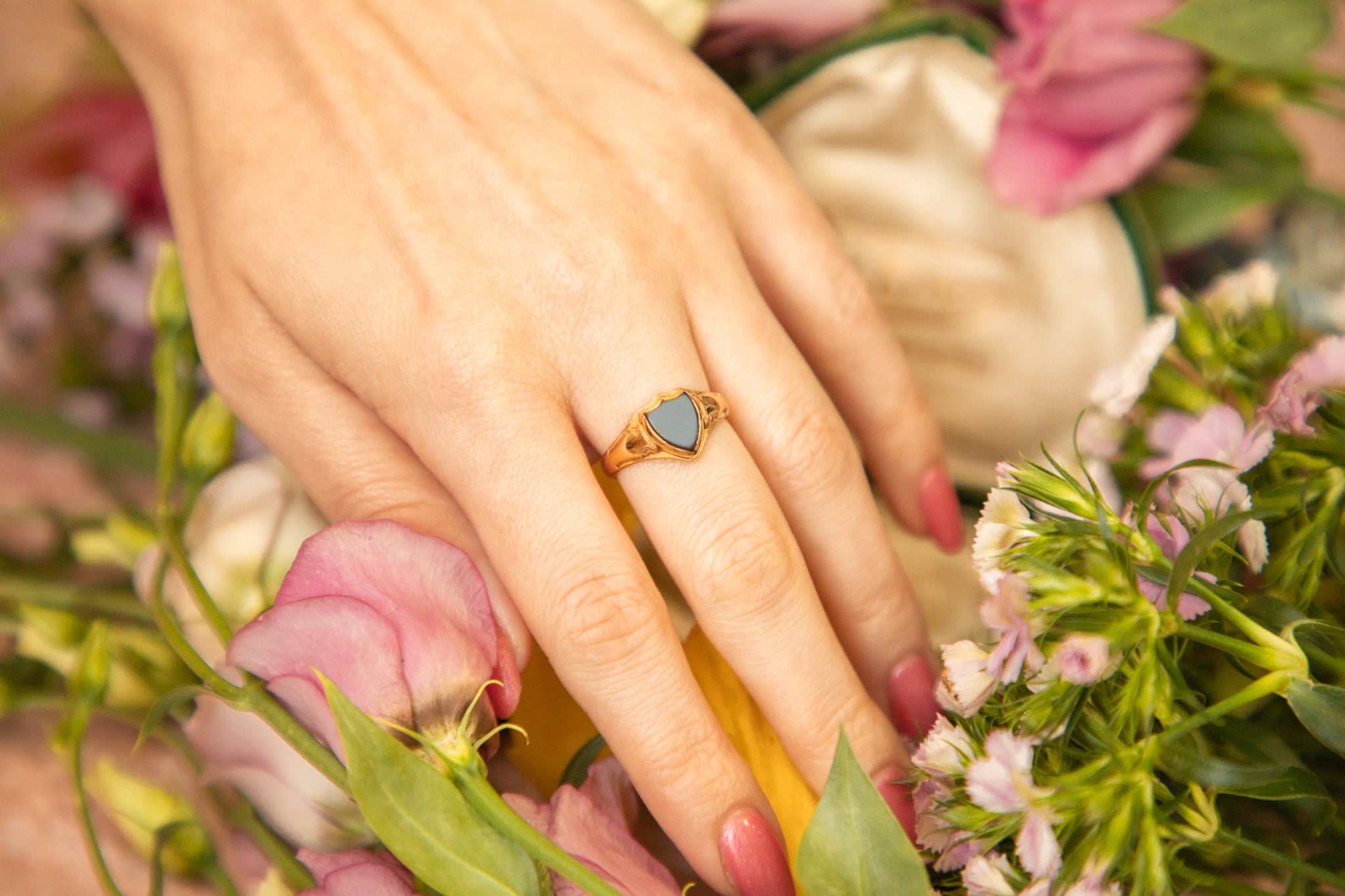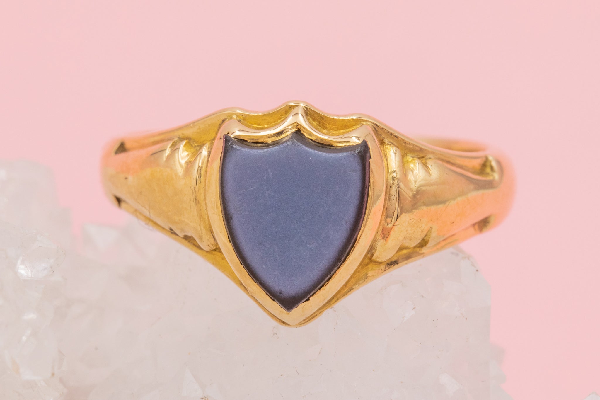 Set your jewellery collection apart from the rest with this gorgeous antique 18ct Gold Agate shield signet ring. Boasting a smooth, solid band, this Victorian ring is composed of richly saturated 18ct Gold with a flint grey Agate shield proudly poised in its centre.