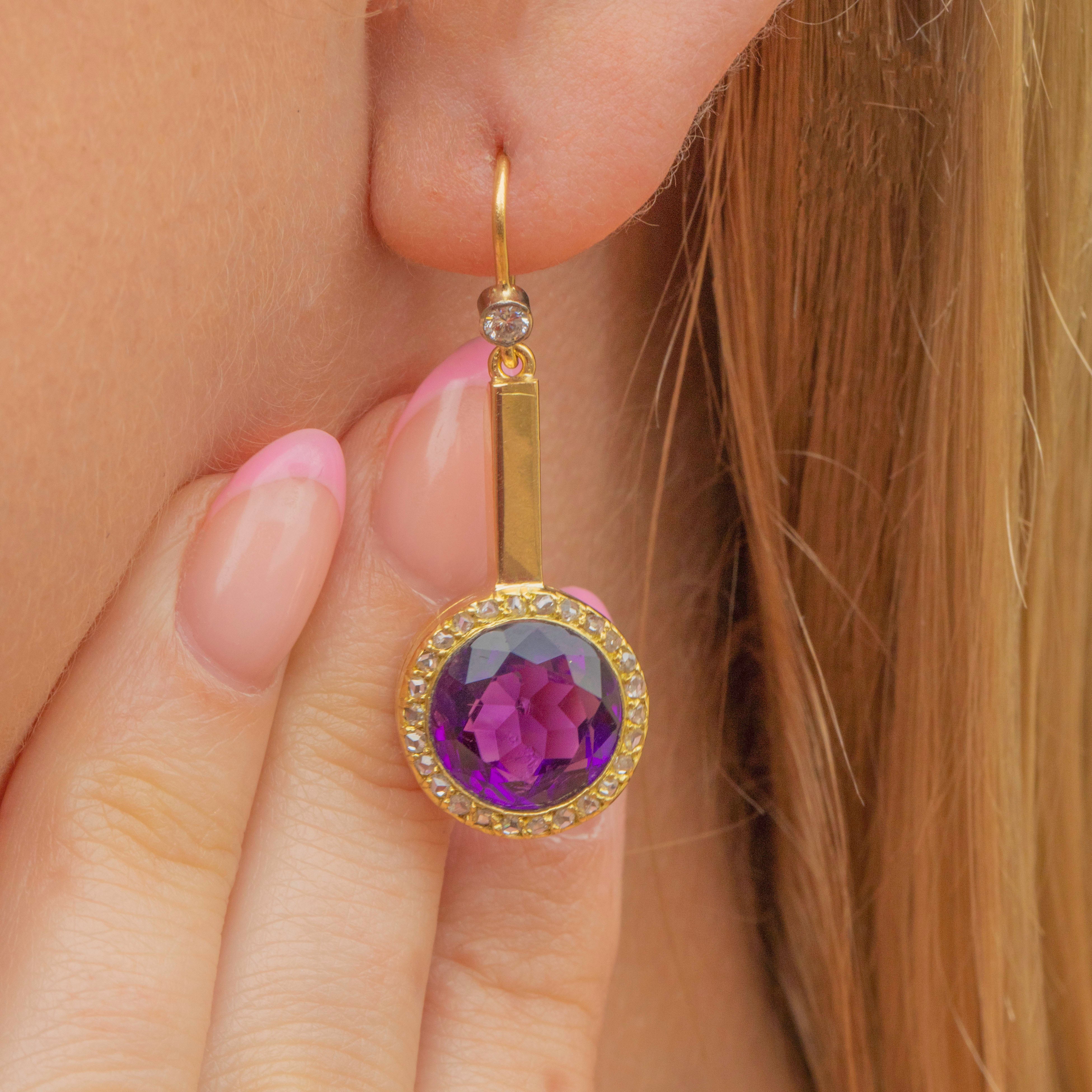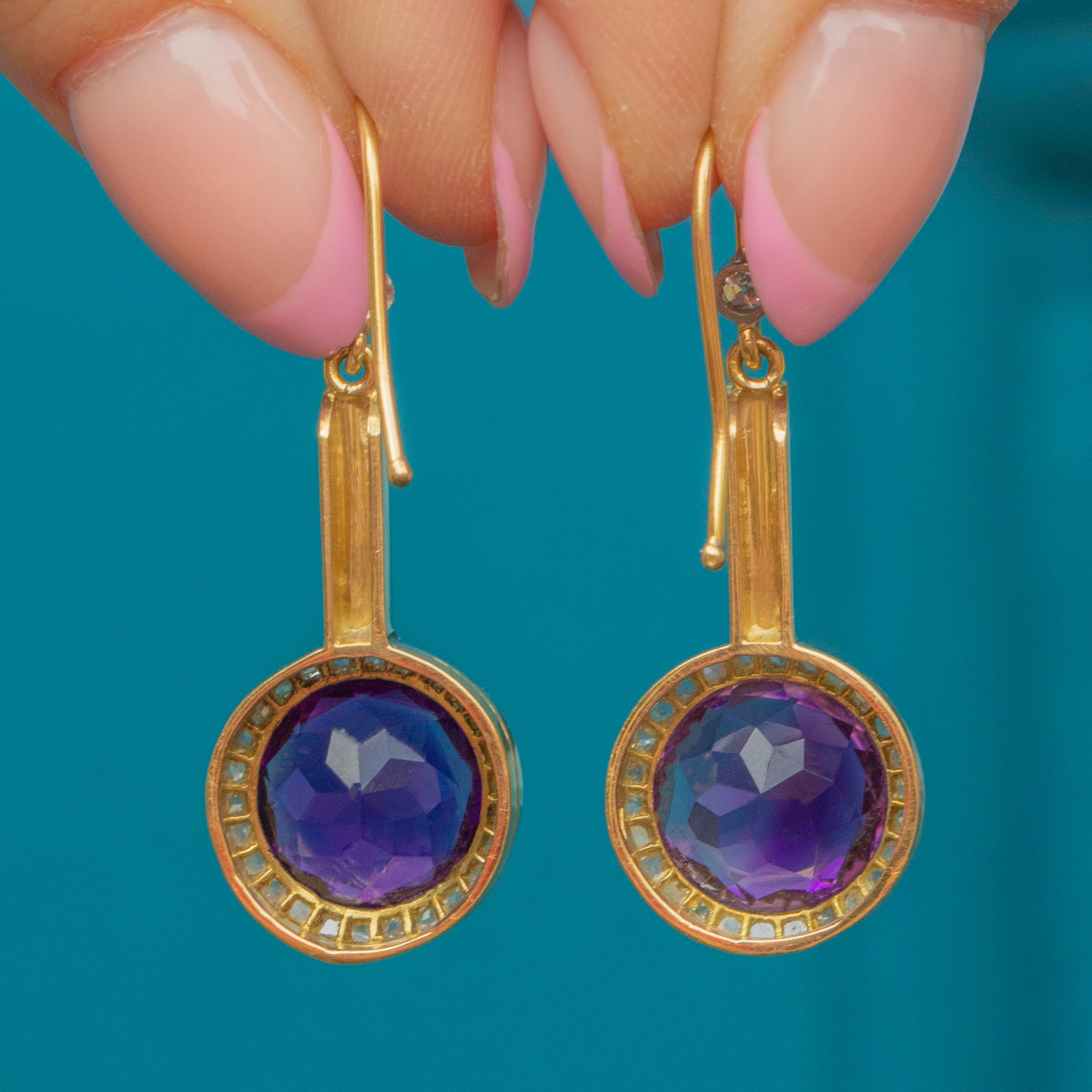 EXCELLENT. These fine Edwardian 18ct Gold Amethyst Diamond drop earrings are in excellent condition. The Diamonds are securely set have retained a great structure. The 18ct Gold settings have retained great form, with the intricate detailing remaining intact. The Amethysts are in superb condition, sitting securely within their setting and bursting with rich colour! Complete with 18ct Gold hooks you can display this pair from your earlobes with the utmost confidence!