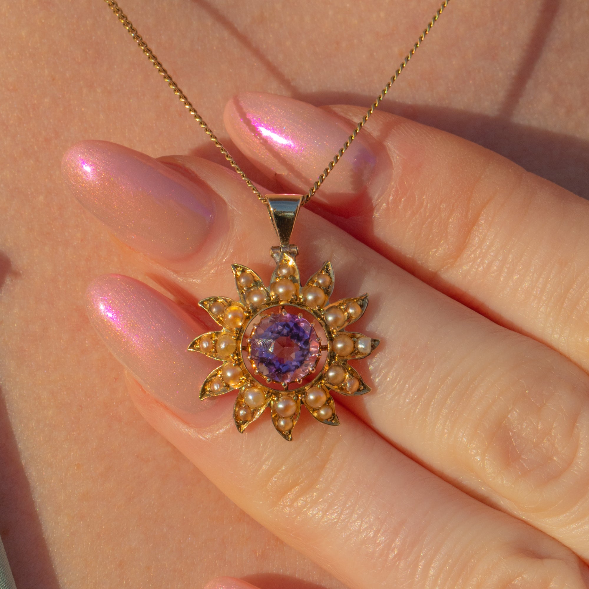 Crafted from buttery 9ct Gold, this floral pendant features a plump faceted Amethyst in her centre, radiating gorgeous lilac and lavender hues as she catches the light. She is adorned by a halo of graduating creamy Pearls, with each of her gemstones married by the warmth of their yellow Gold settings.