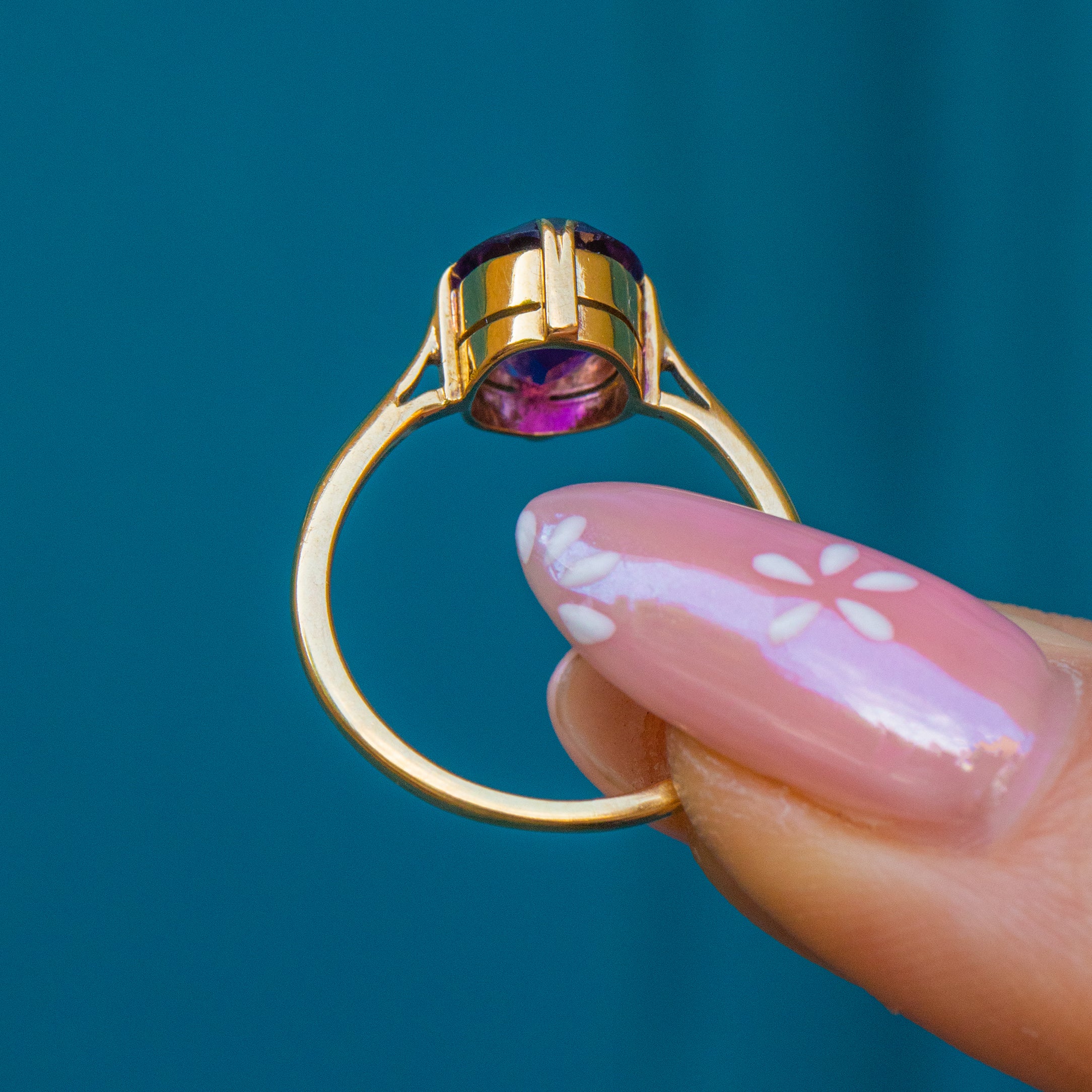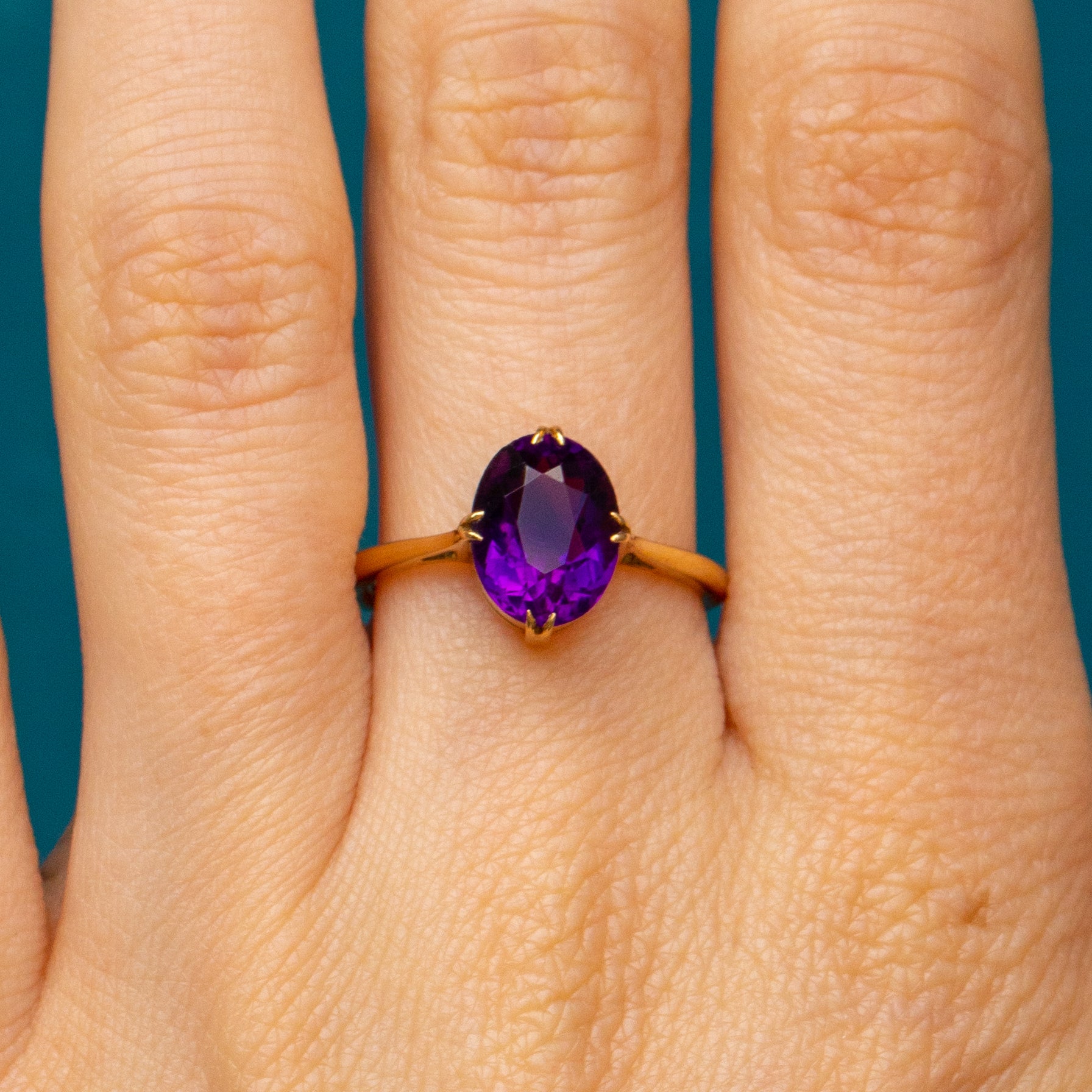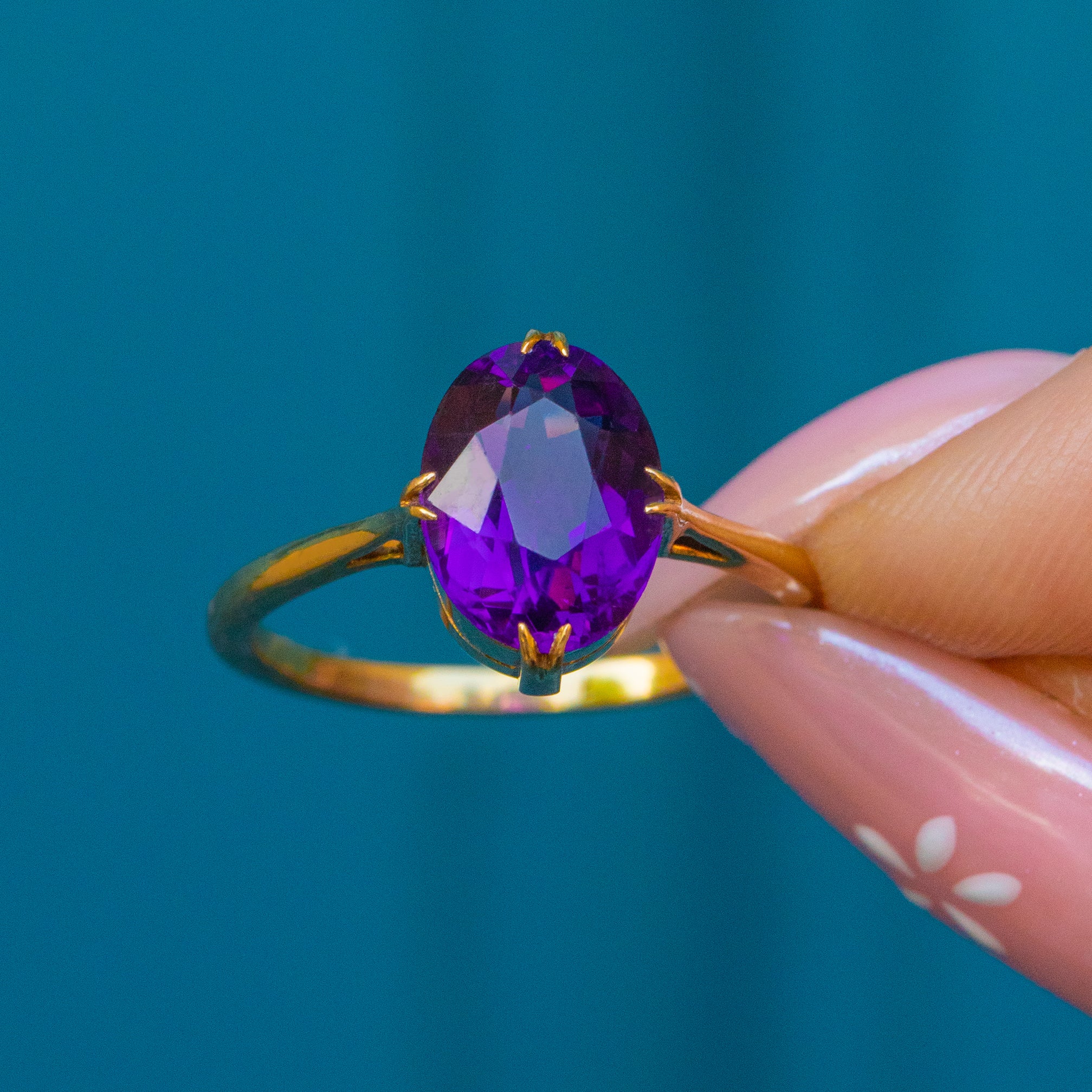 Bring a touch of regal allure to your repertoire with this striking antique 18ct Gold Amethyst ring! Displayed within split claw settings, the deep purple Amethyst takes centre stage glimmering with crisp facets as it catches the light.