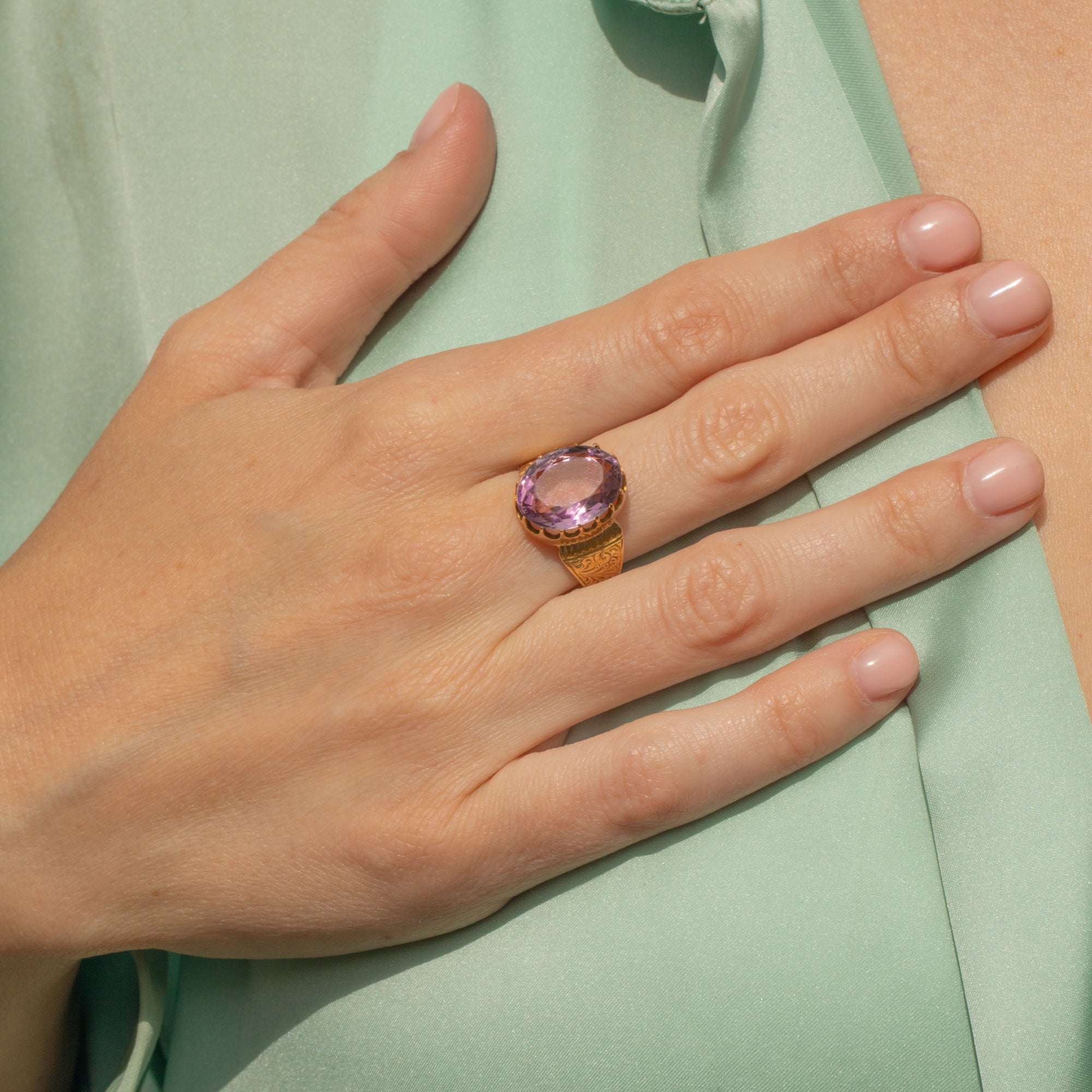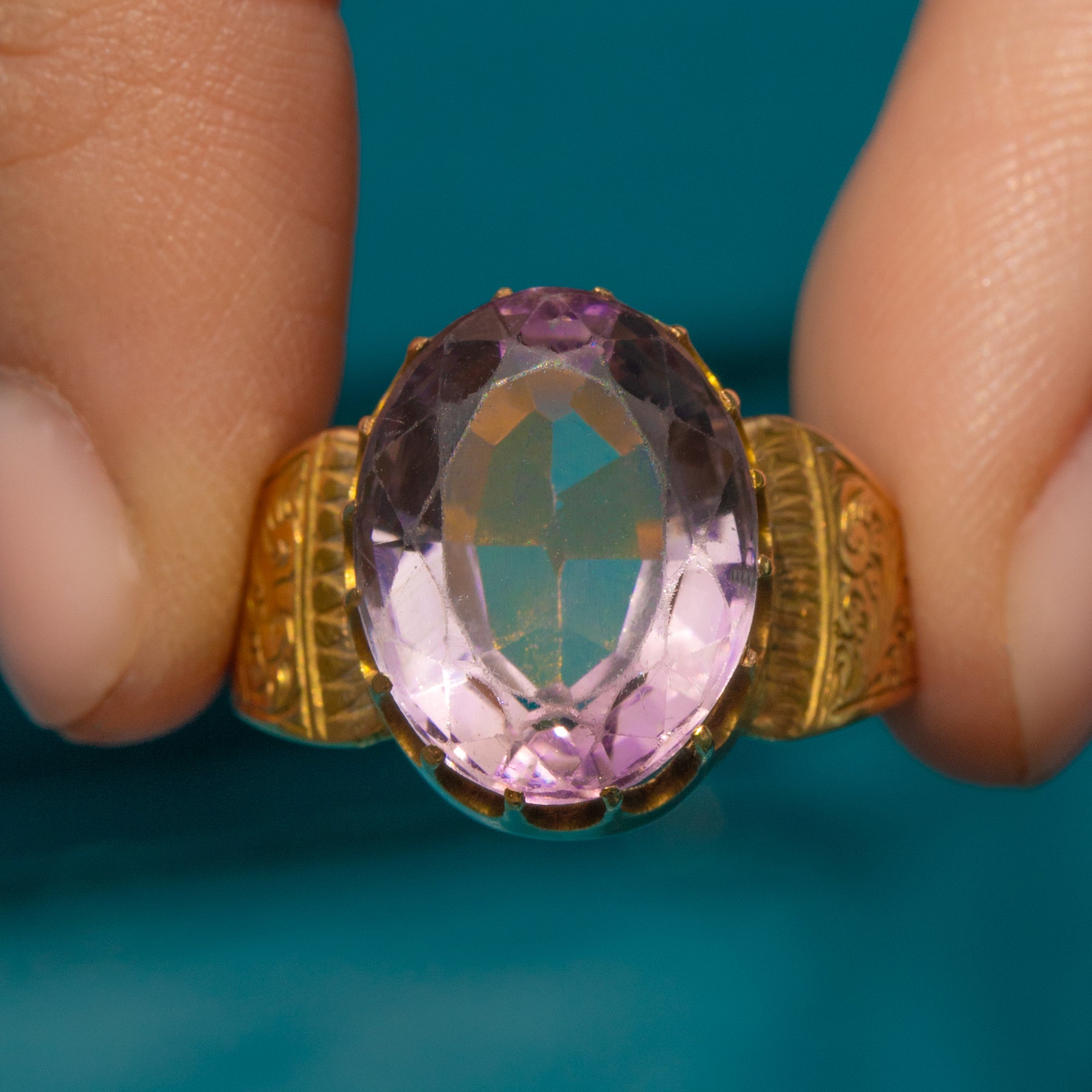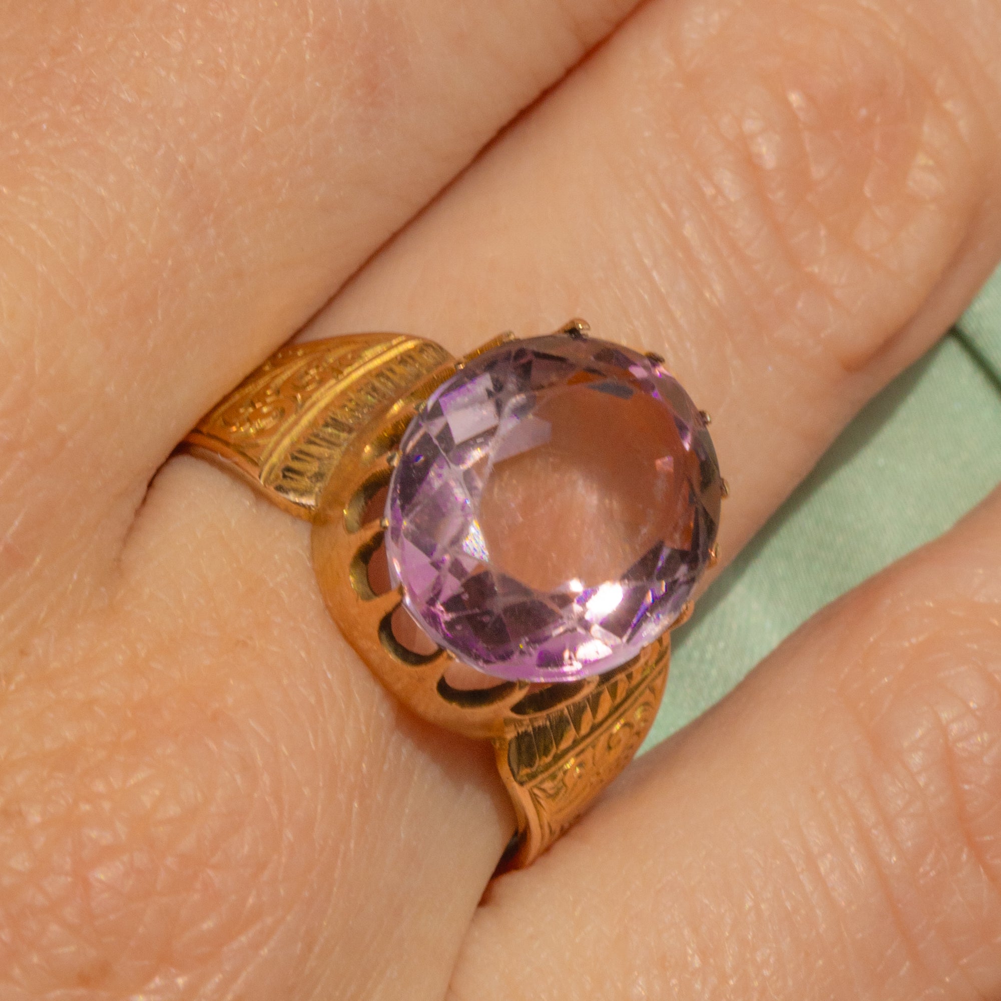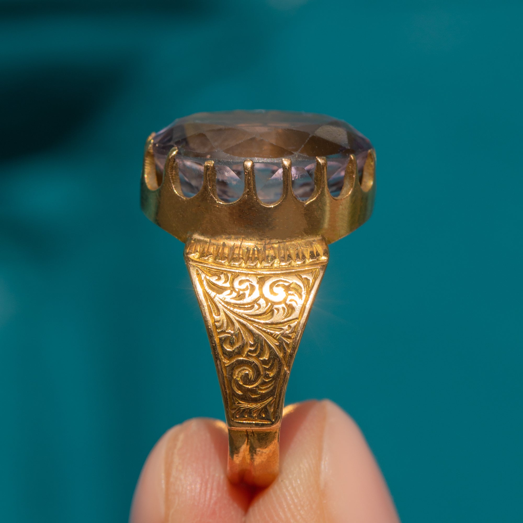 Antique 18ct Gold Amethyst Ring 5.22ct, Engraved Shoulders