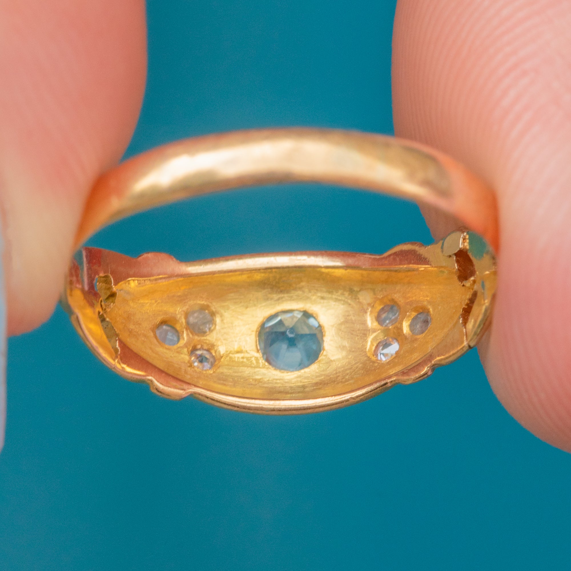 EXCELLENT: The 18ct Gold band has been formed beautifully and holds each gemstone securely. The Aquamarine and surrounding Diamonds are each radiant and free from any notable signs of wear. With the smooth band providing a comfortable wear, this Victorian gypsy ring can be worn with utmost confidence.