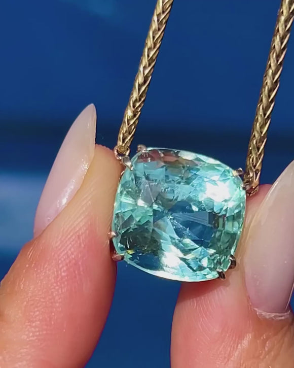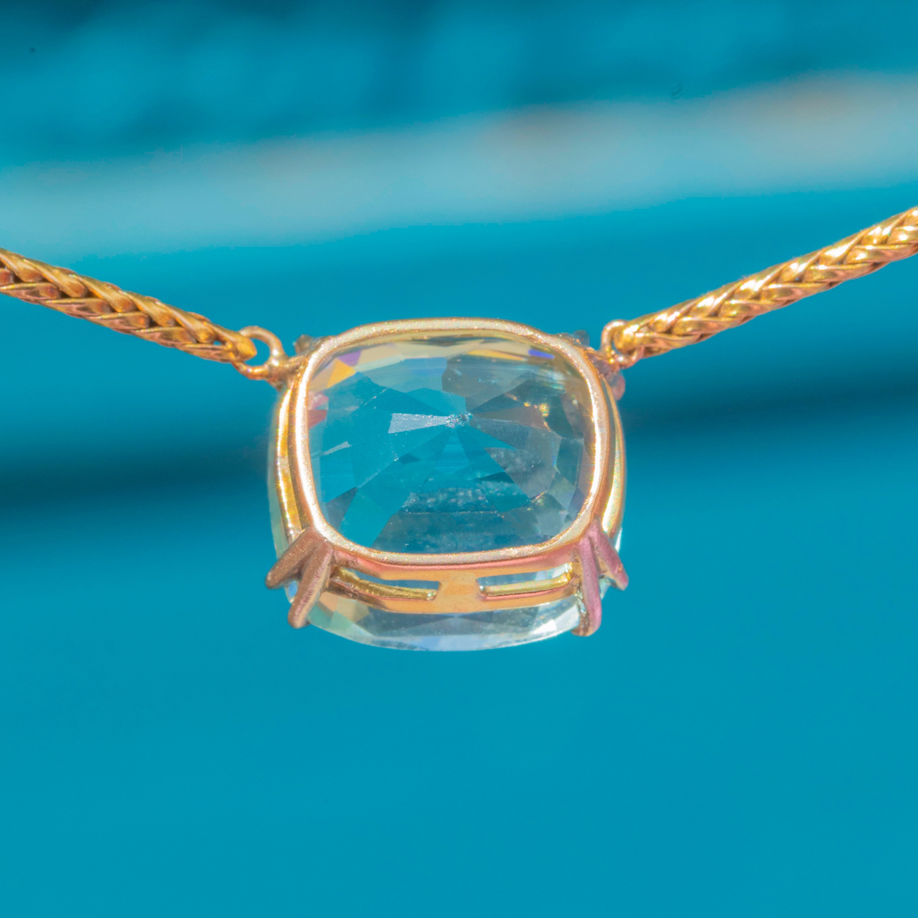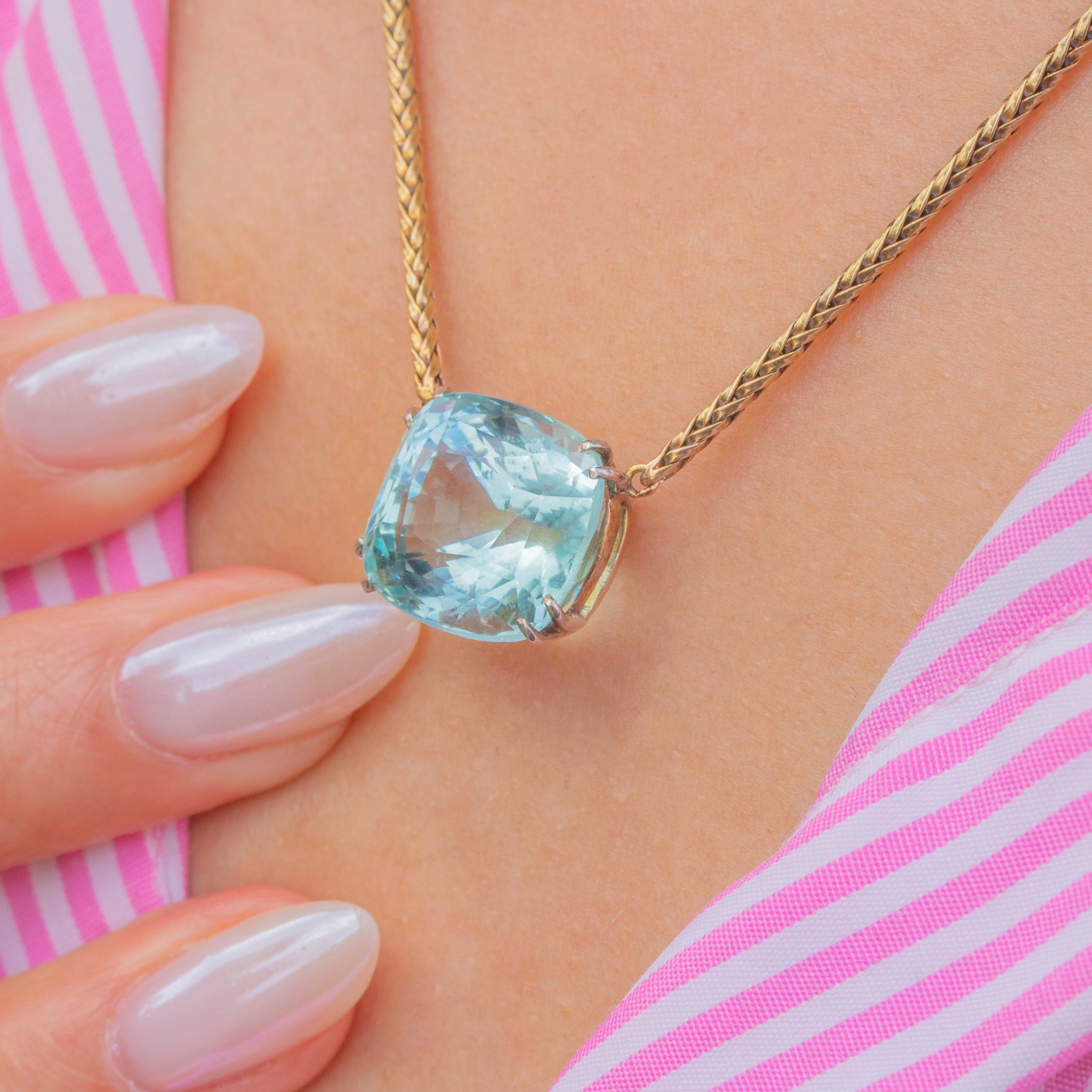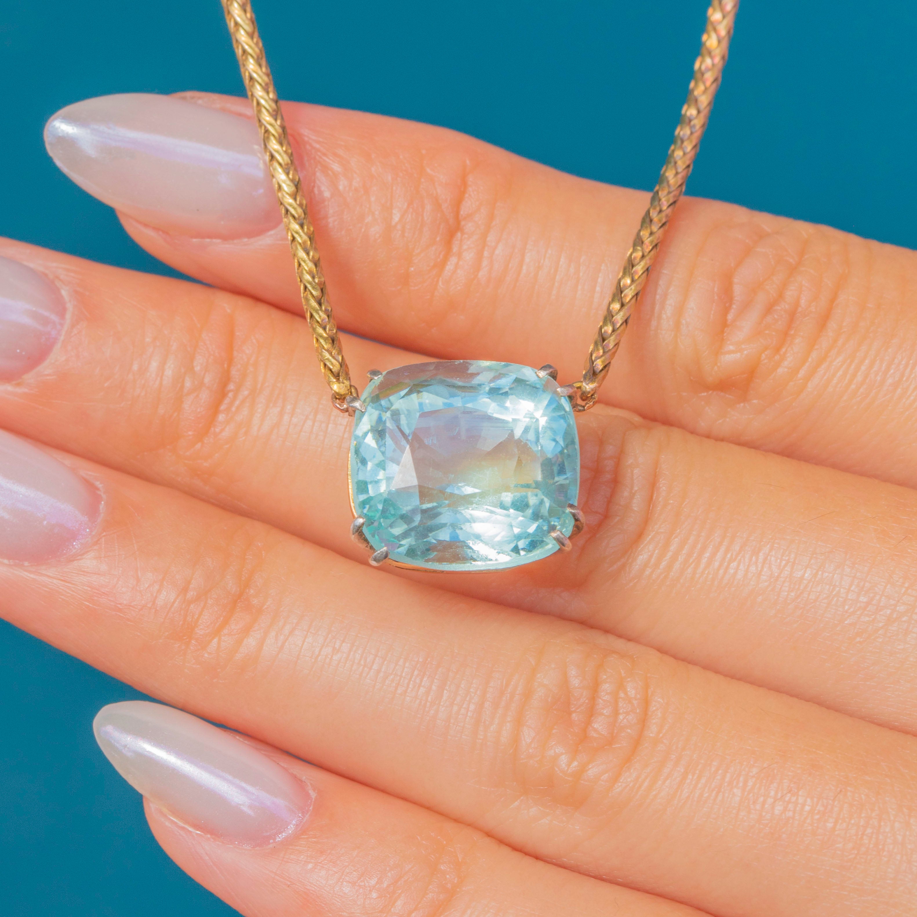 VERY GOOD-EXCELLENT: The Aquamarine is faceted beautifully and free from any chips or cracks, with only a small nibble present at the base of the gemstone, which is only noticeable under close inspection. The buttery 18ct rope chain is secure, and with the clasp fully functioning, you can wear this antique necklace with utmost confidence!