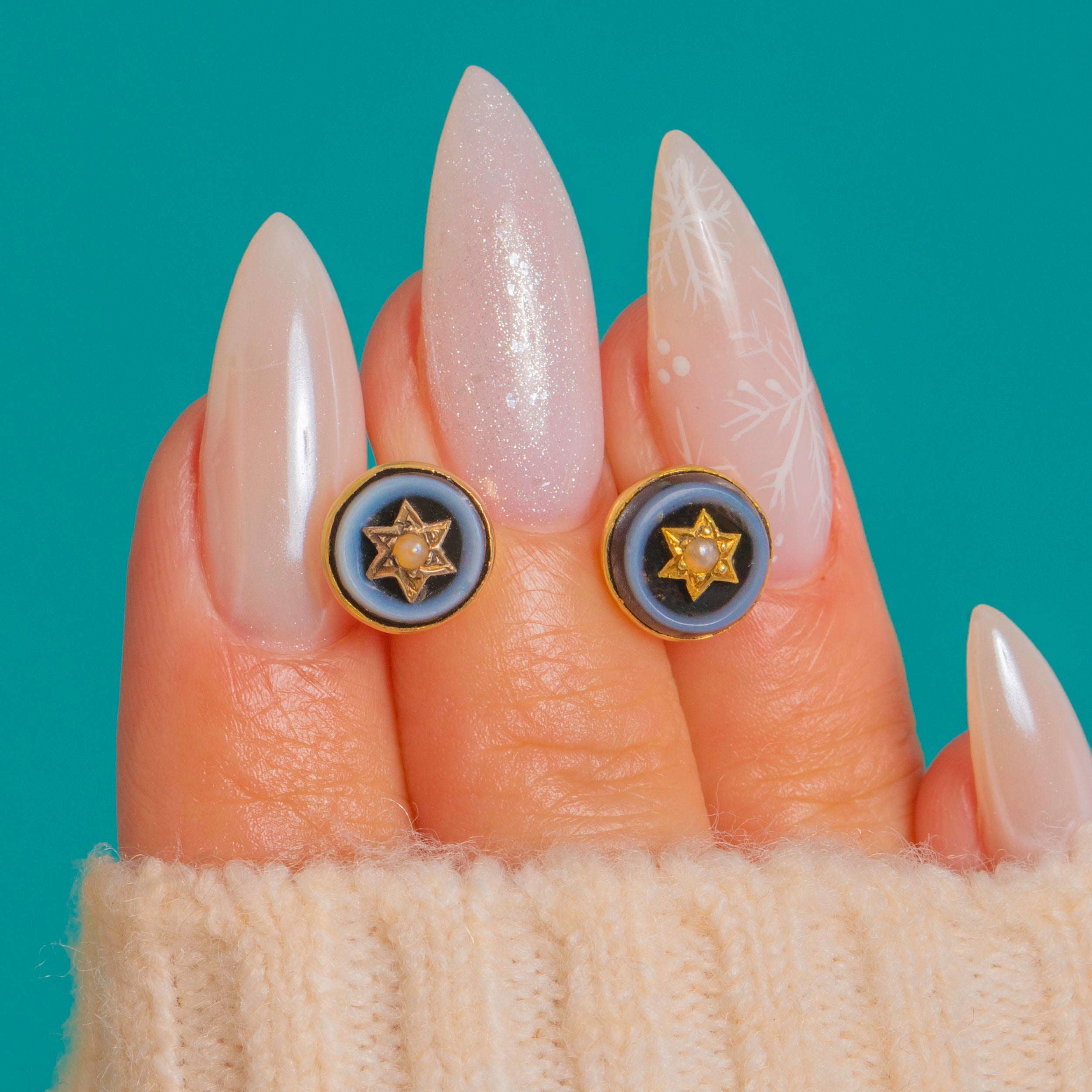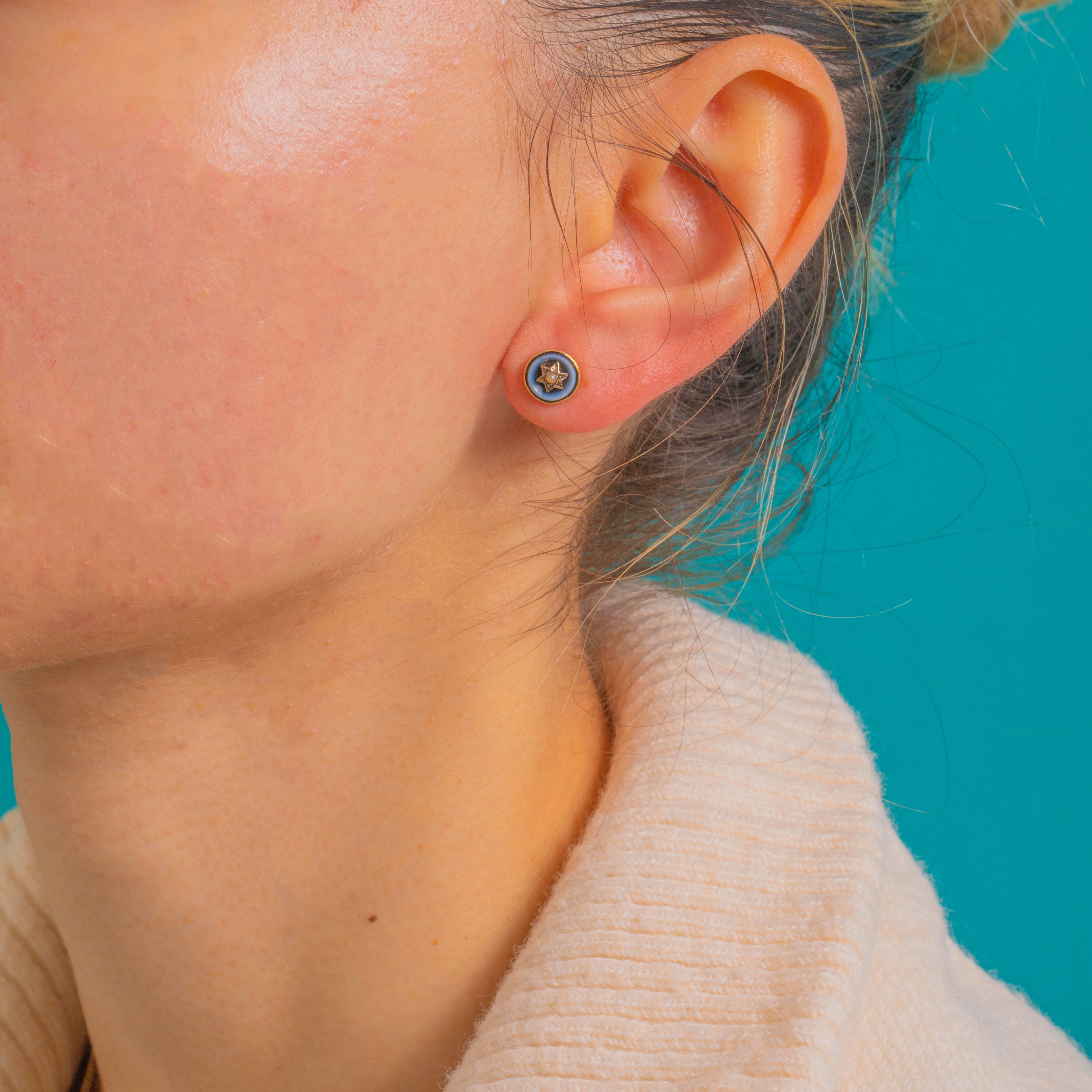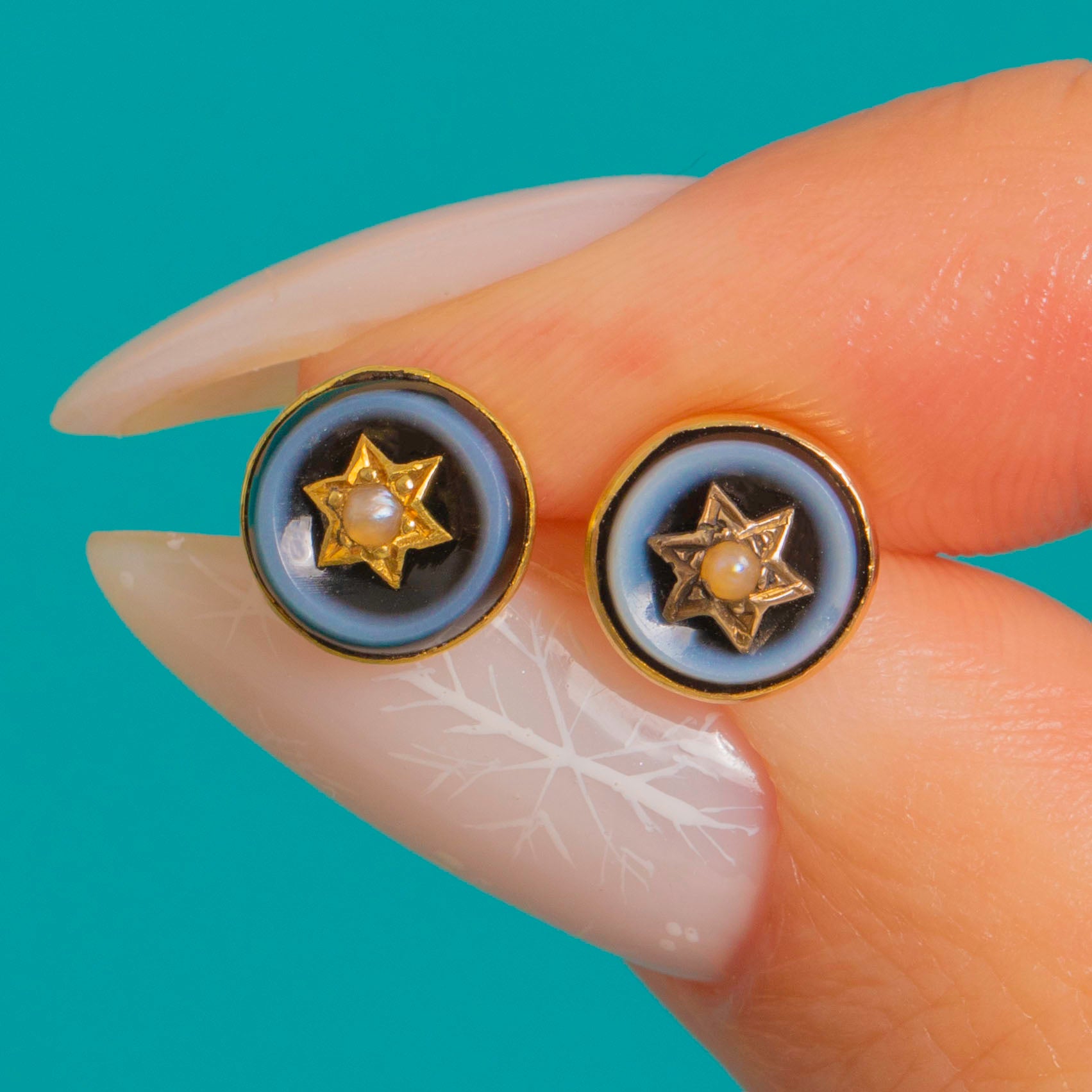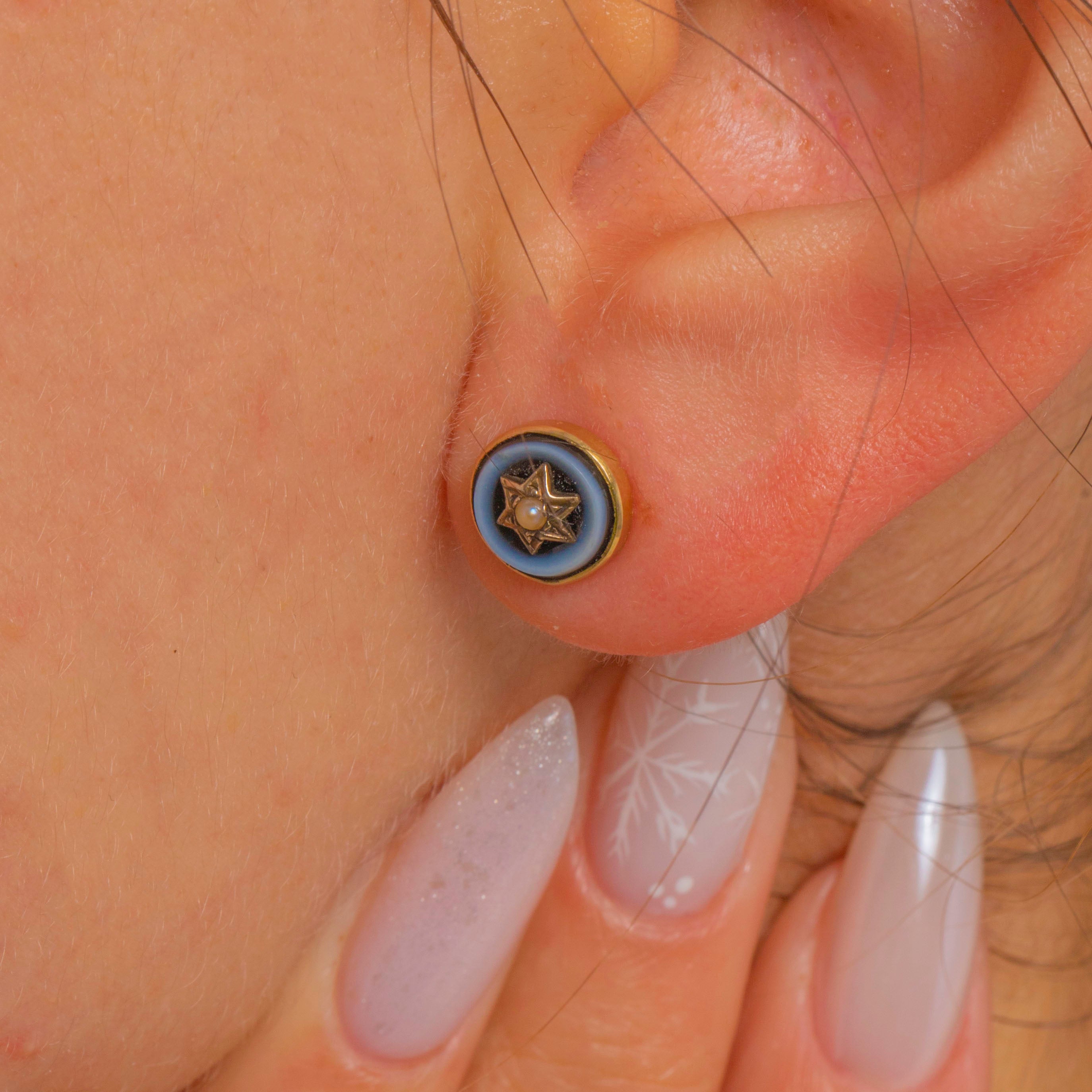 Dainty and deliciously striking, these Victorian 18ct Gold target studs centre glossy Banded Agate bullseyes around a petite star set with a tiny Pearl. The concentric rings shift from deep inky blue-black to pale blue-grey, creating a refined celestial motif that’s as charming by day as it is elegant by night.