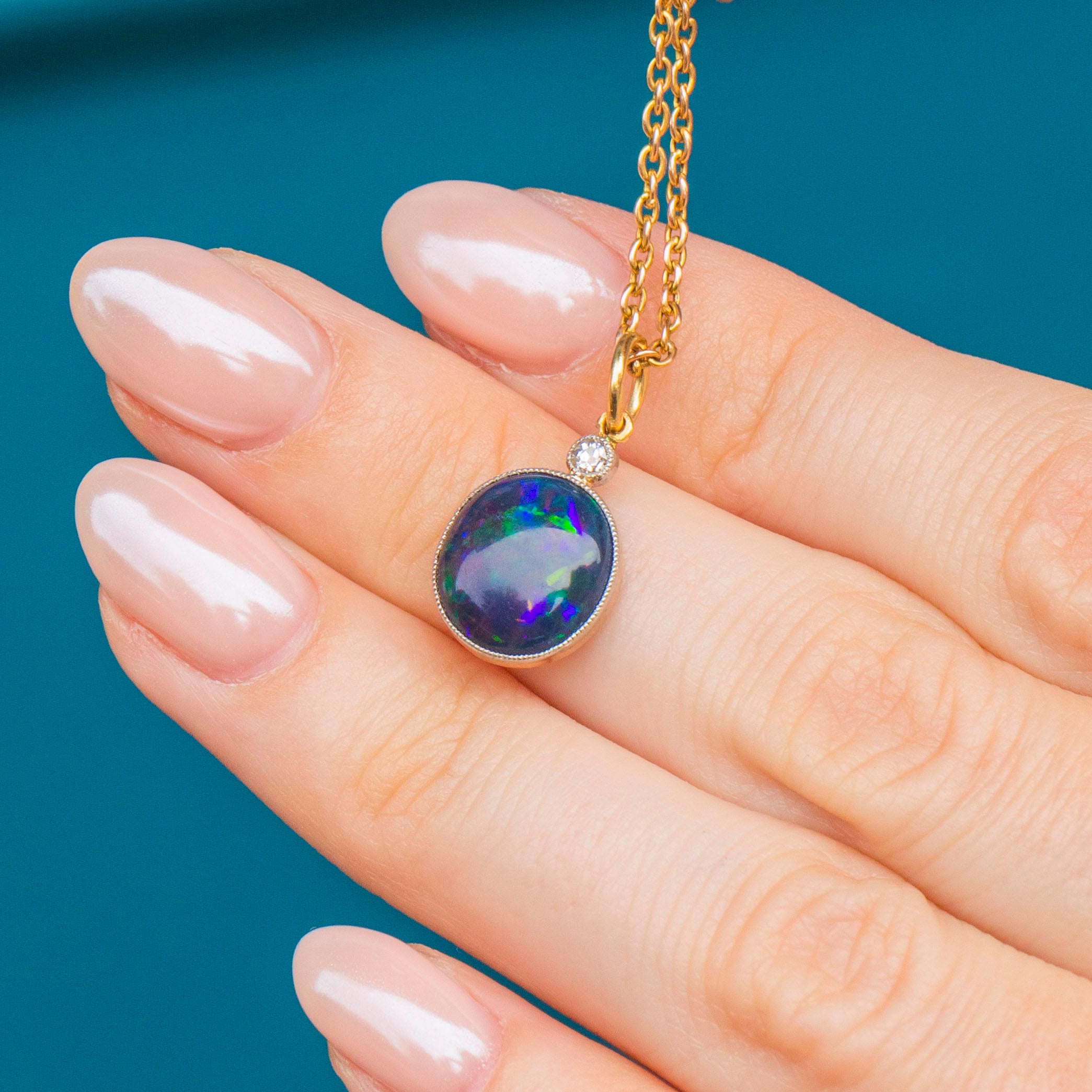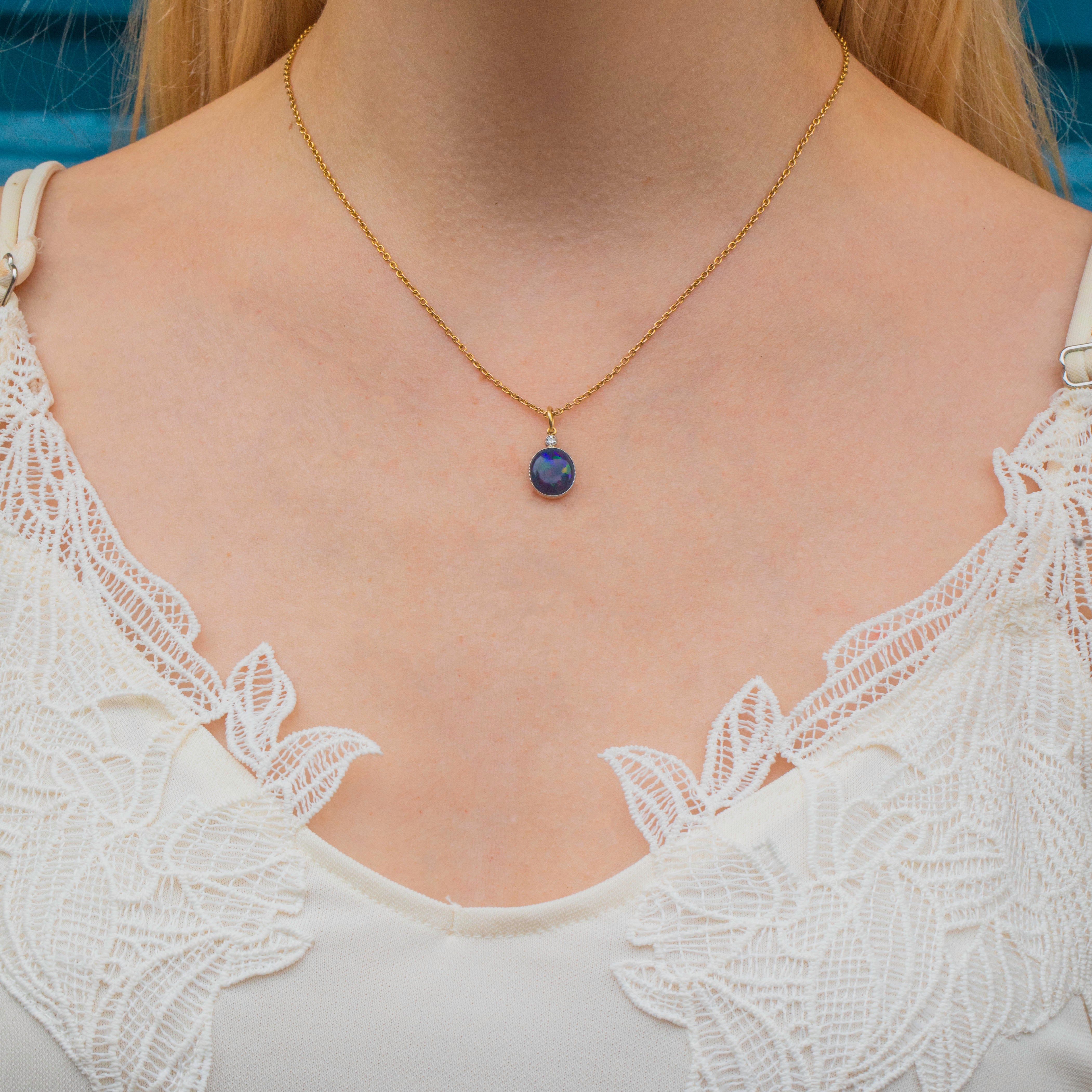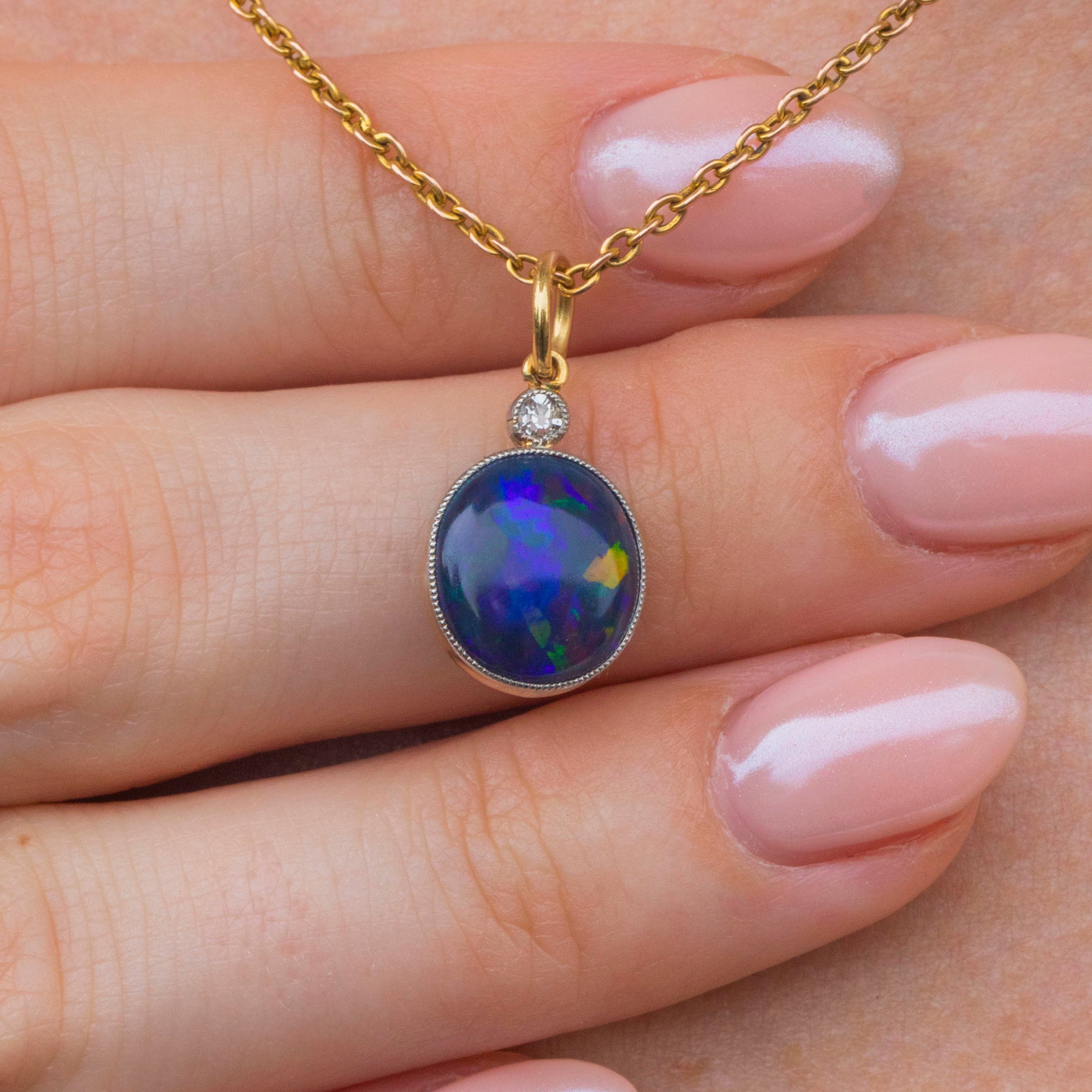 EXCELLENT. This antique 18ct Gold Black Opal Diamond charm is in excellent condition. Her glorious Opal is set securely in her bezel, with no chips or scuffs to her surface. On the underside of the Opal is a natural and uneven layer of 'potch', which contributes to her vivid dark colour, making her even more sough-after. Her glittering Diamond is also set securely with no fleabites visible. Simply add a chain and wear with pride!