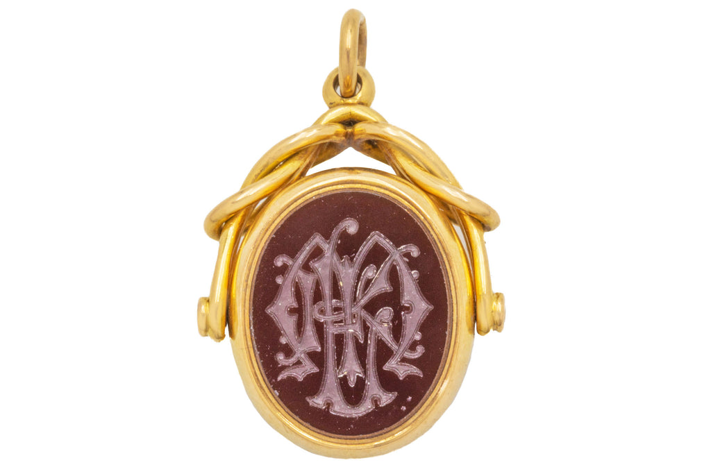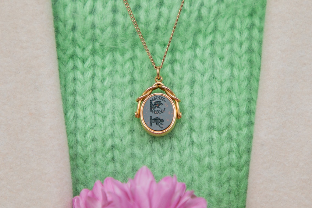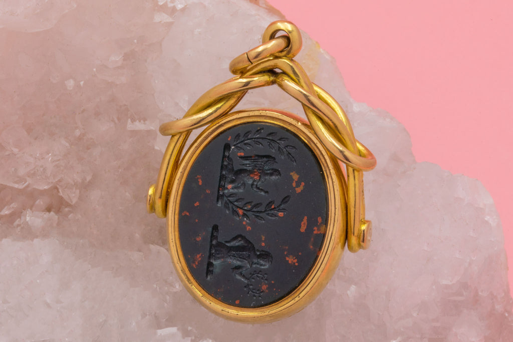 VERY GOOD. Bursting with character, this antique 18ct Gold Bloodstone Carnelian intaglio fob pendant is in lovely condition throughout. Both of her stones are securely set and their intaglios are intricate, with all detailing still visible to see. Her 18ct Gold has retained good form, with only minor surface wear across her underside, slightly obscuring the hallmarks. Her wire bale is akin to a lover's knot and very sturdy. She swivels with ease and will make for a lovely pendant suspended from a chain. An absolute dream to add to your antique jewellery collection!