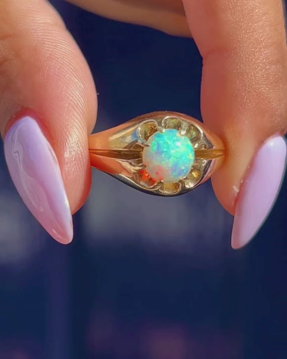 In true Victorian style, the Opal is held within a sweet buttercup setting and is crafted entirely from honey-hued 18ct Gold. The chunky design provides impressive finger coverage and her smooth surface allows her to effortlessly glide onto your hand. This Victorian Opal ring is a show-stopping piece!