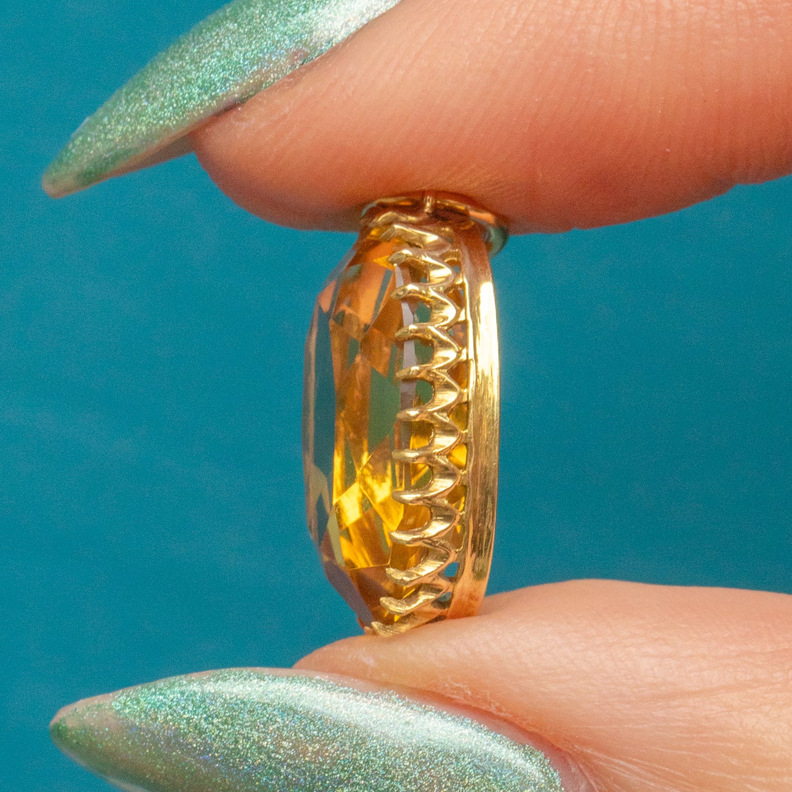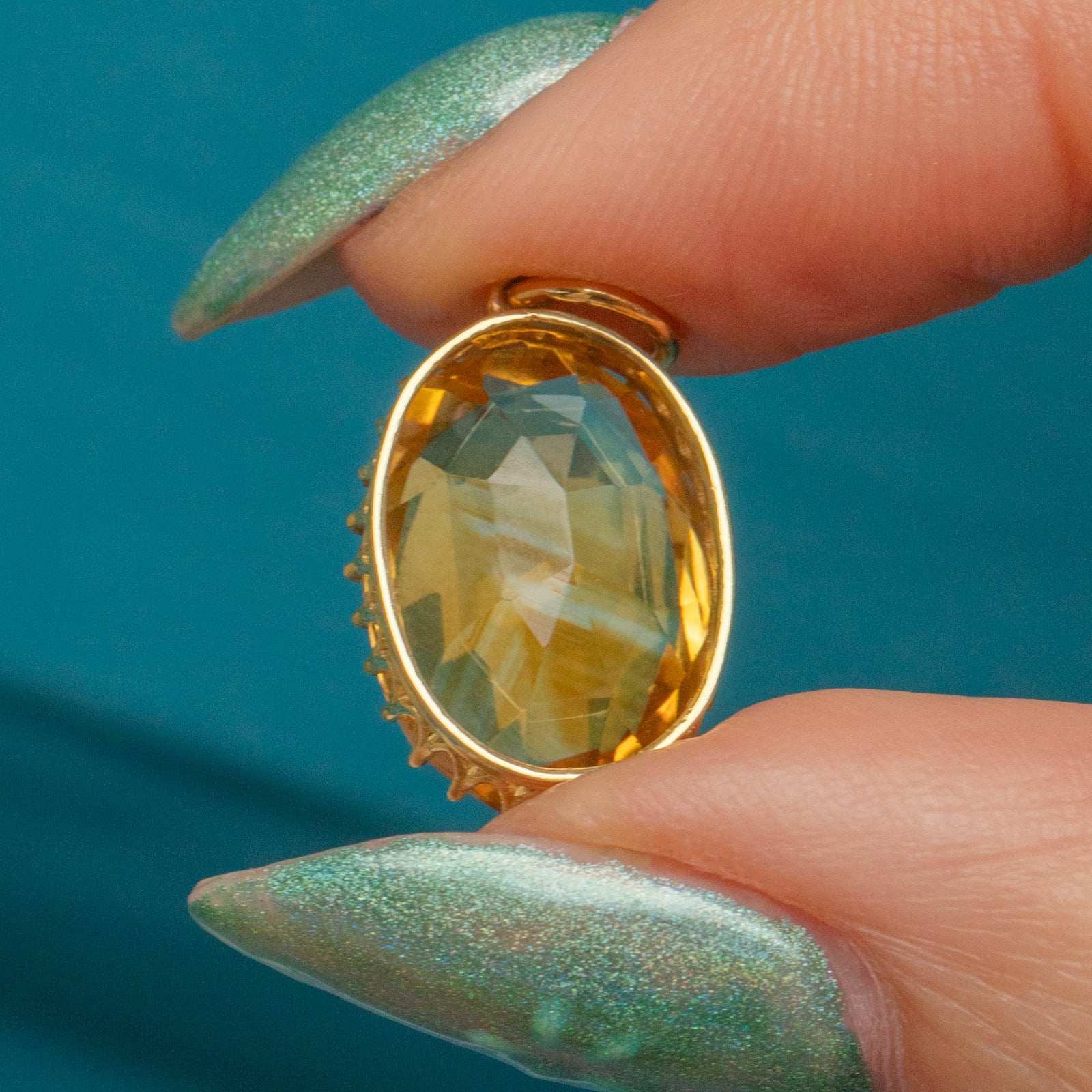 With sunshine yellow hues glimmering across her crisp cut facets, this antique 18ct Gold Citrine pendant will make a joyous addition to your collection! An 18ct Gold crown setting proudly displays the 5.95ct Citrine, with a luxurious satin finish that compliments the syrupy gemstone perfectly.