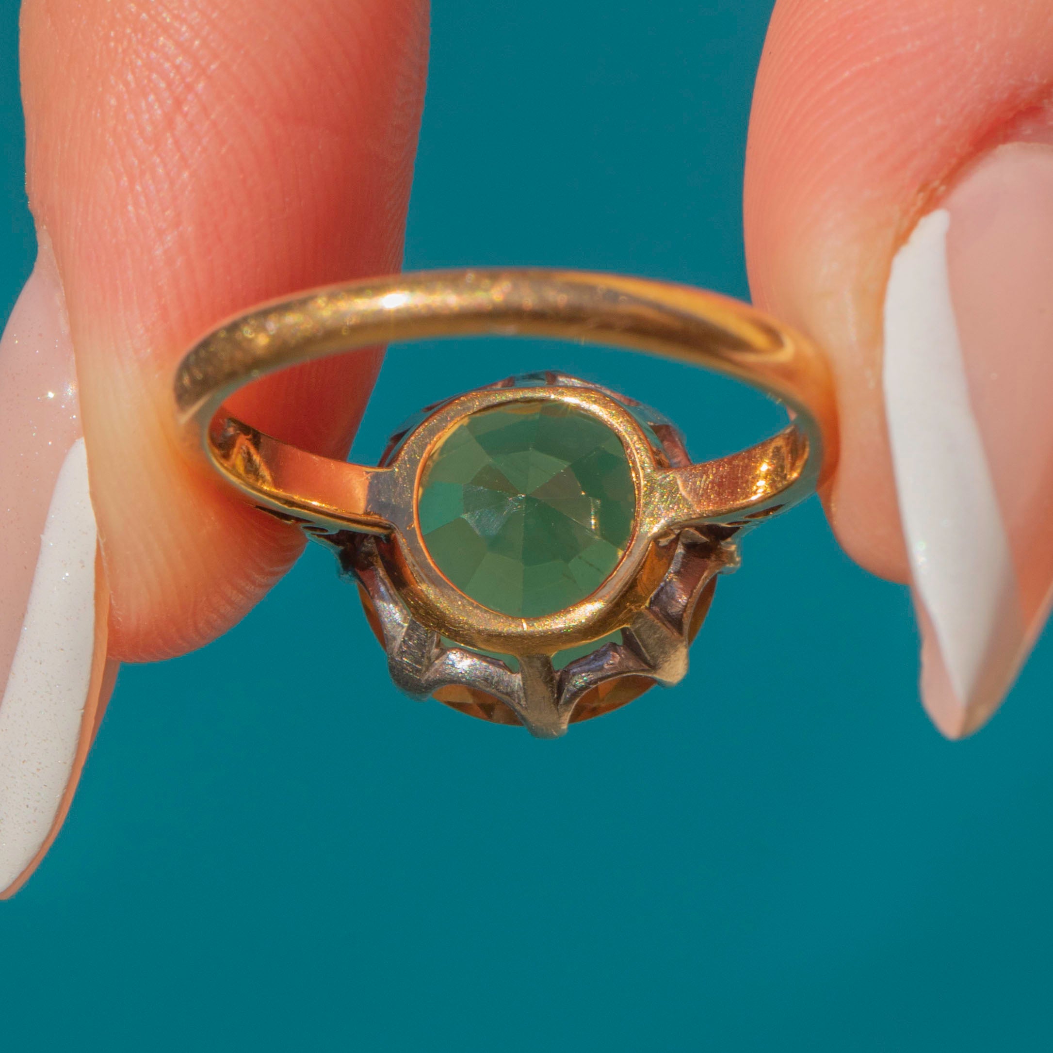 This antique 18ct Gold Citrine solitaire ring is a ray of sunshine! Her honey-hued Citrine sits proudly within gorgeously cool Platinum settings, glowing cheerfully as her crisp facets catch the light.