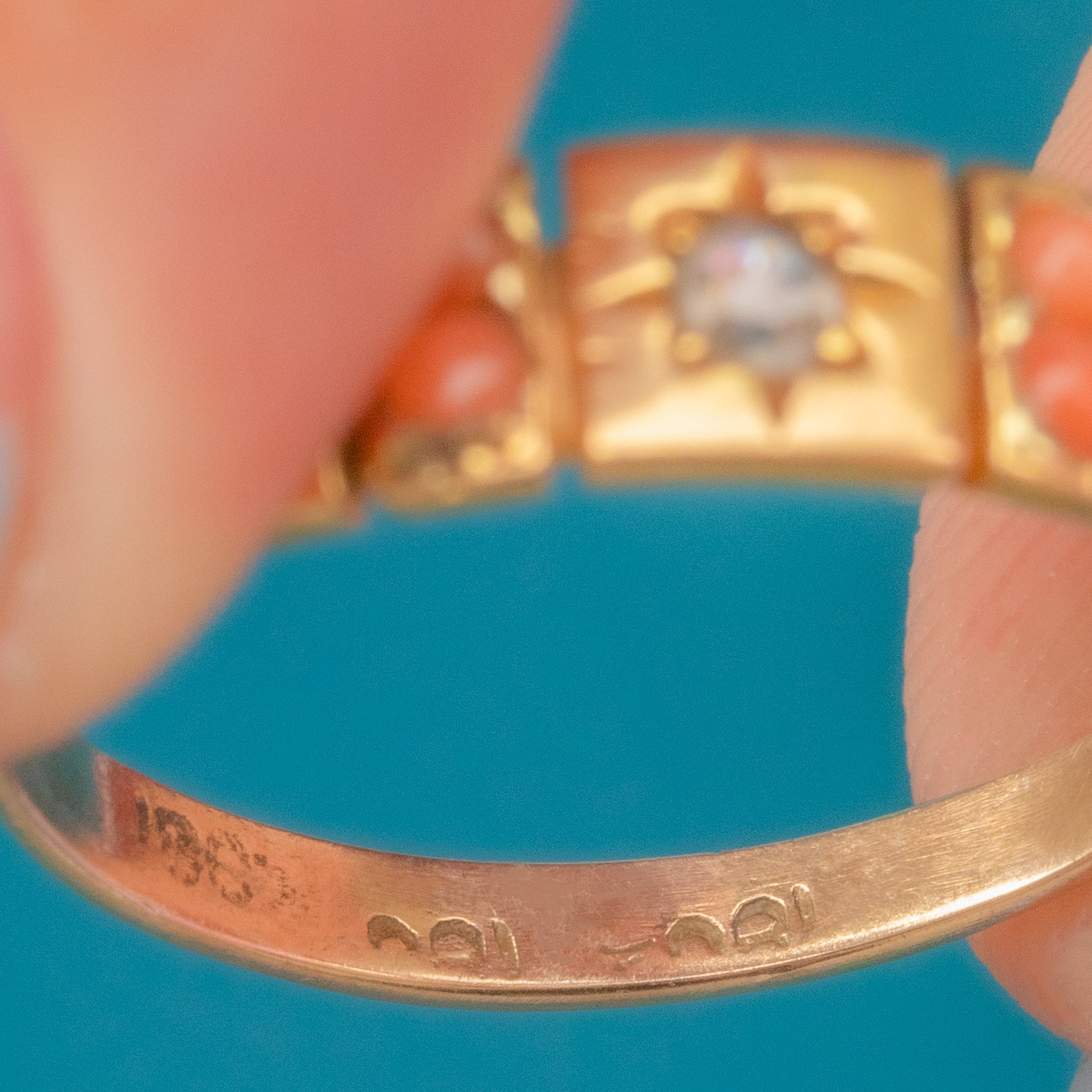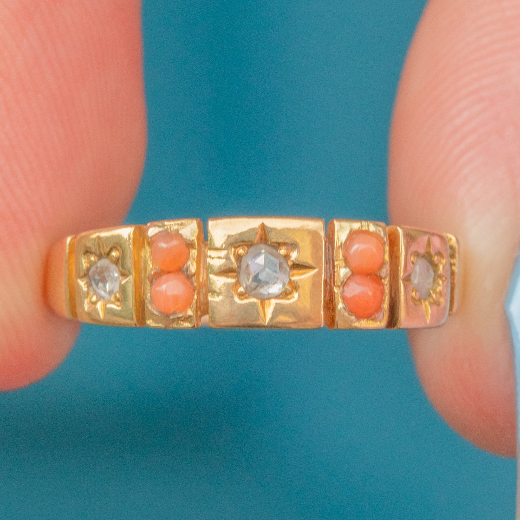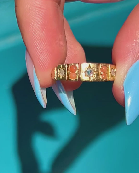 Antique 18ct Gold Coral Diamond Star Set Gypsy Ring