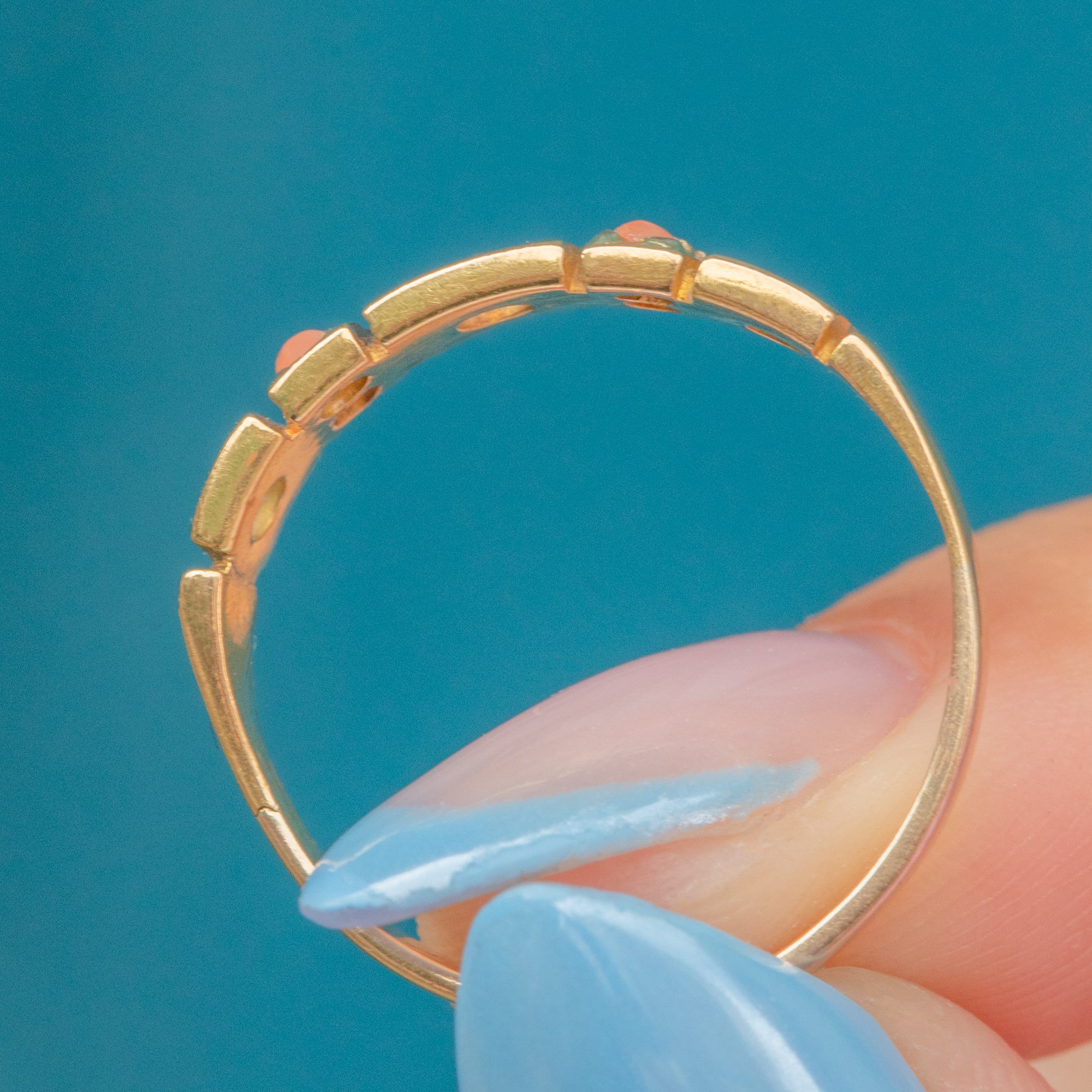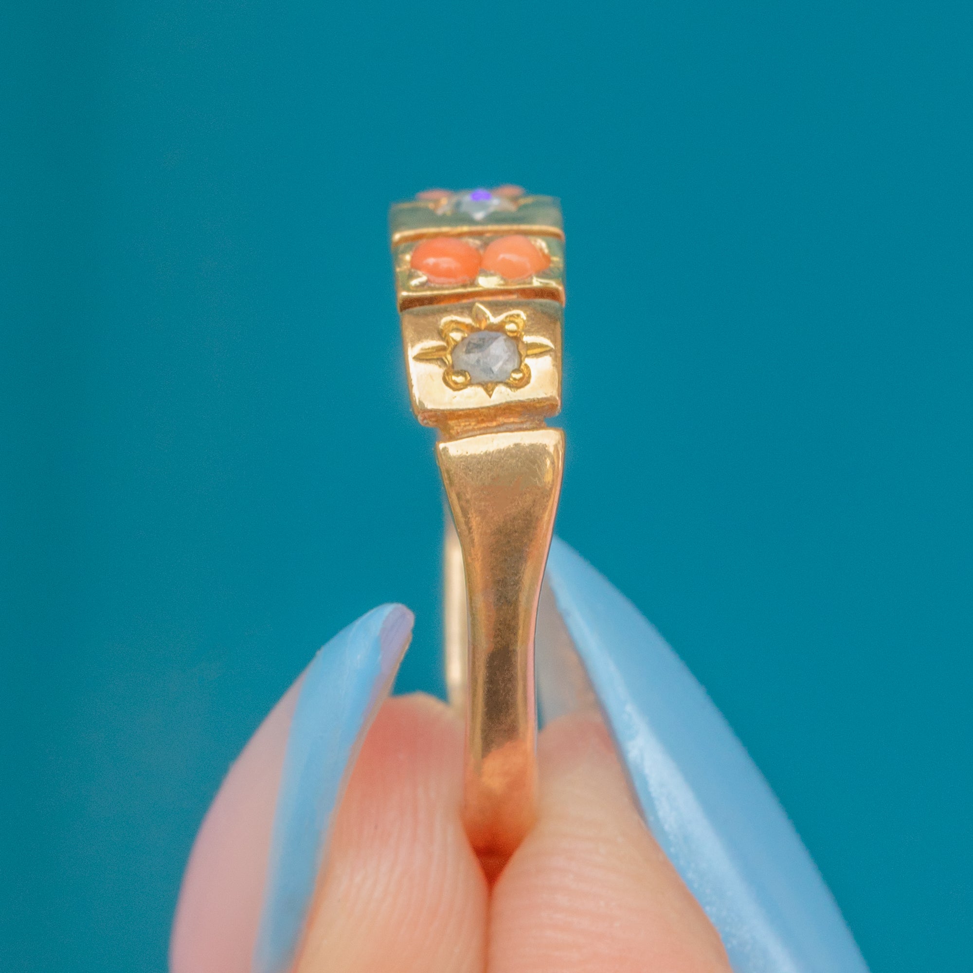 This Victorian gypsy ring radiates a gorgeous buttery warmth, from its sun-kissed 18ct Gold band to the apricot-hued Coral.