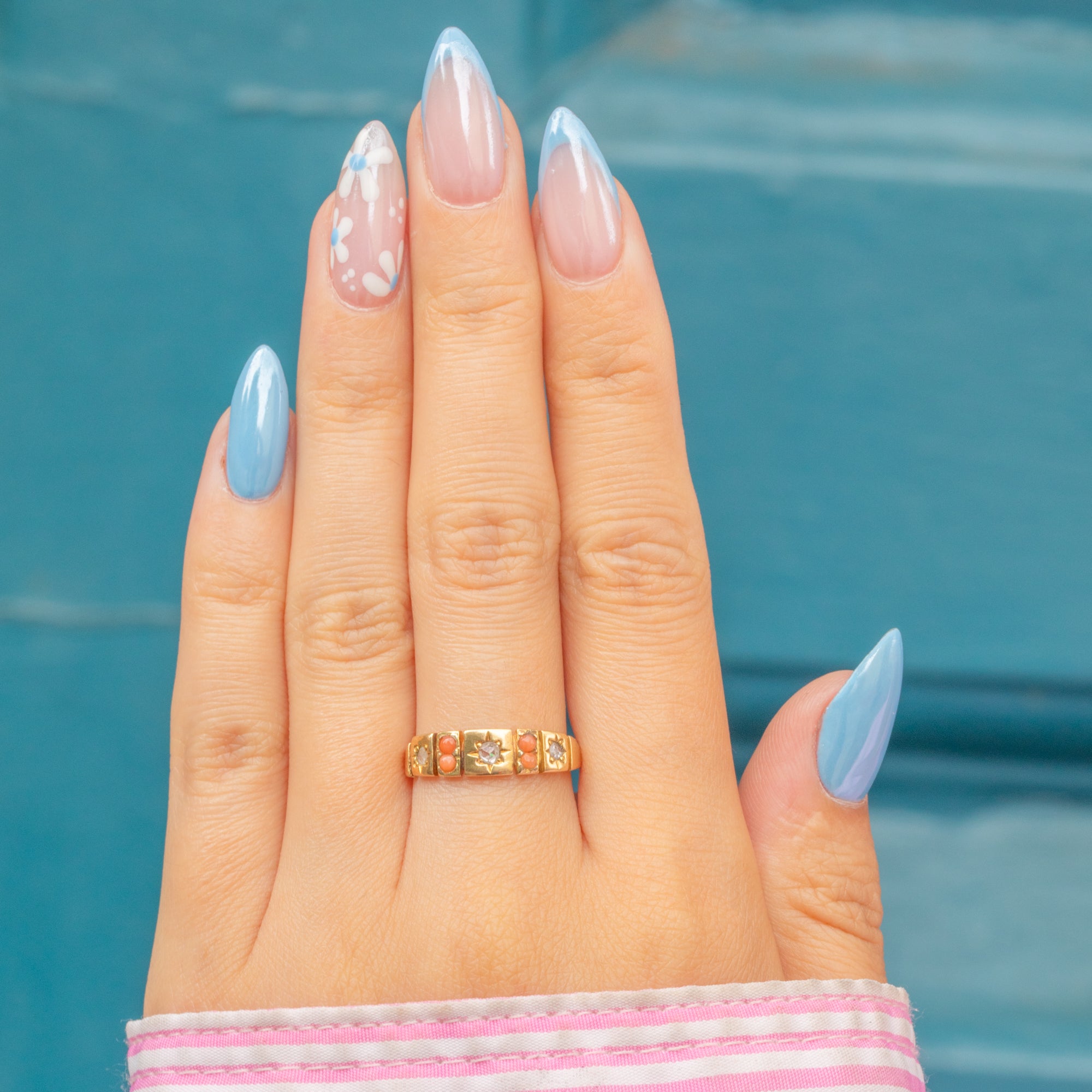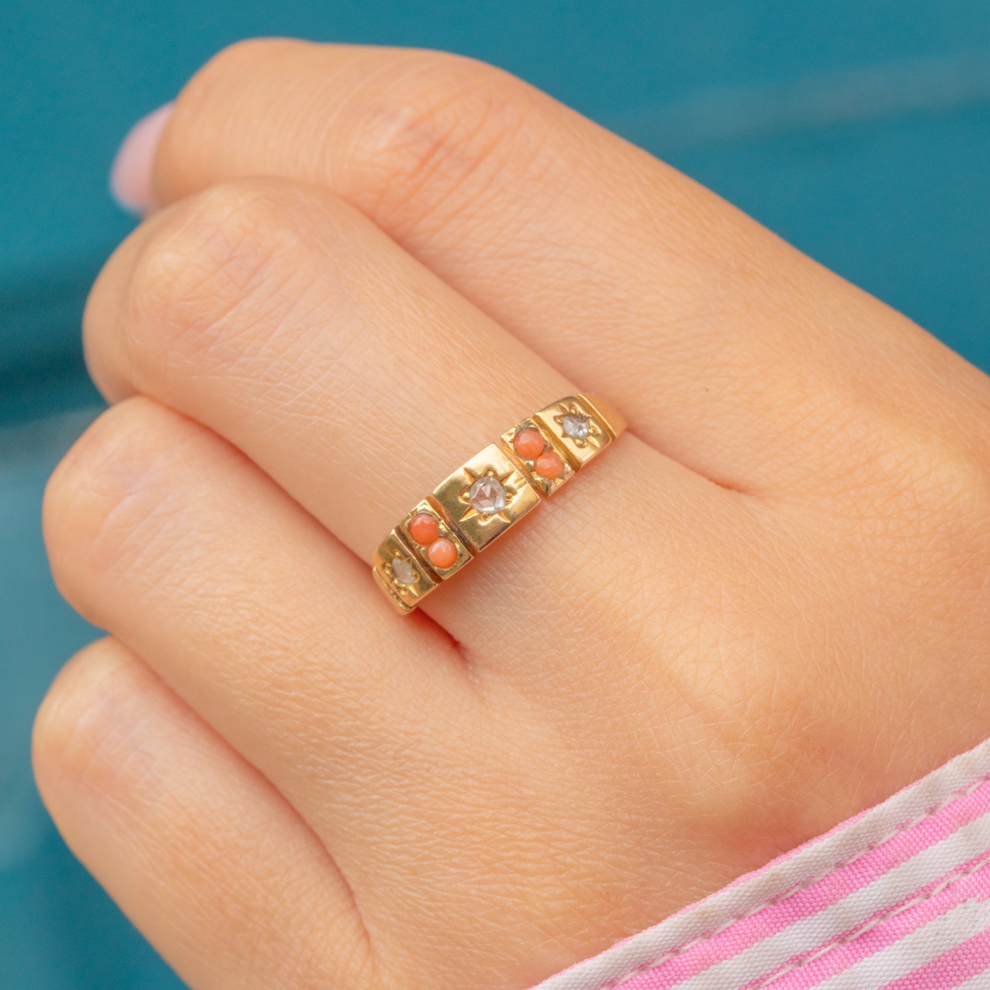 Featuring a trio of star-set Diamonds flanked by dainty Coral cabochons, this antique ring is the perfect celestial piece to stack alongside your golden goodies - a trait for which gypsy rings are so revered!