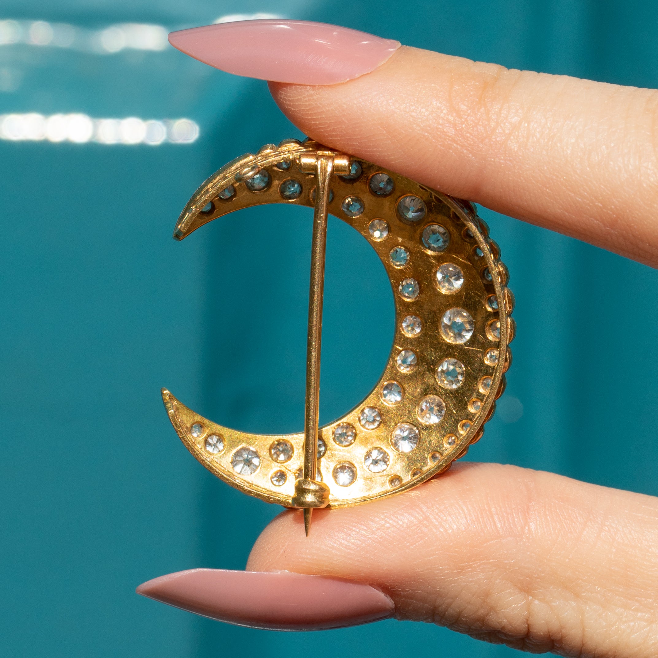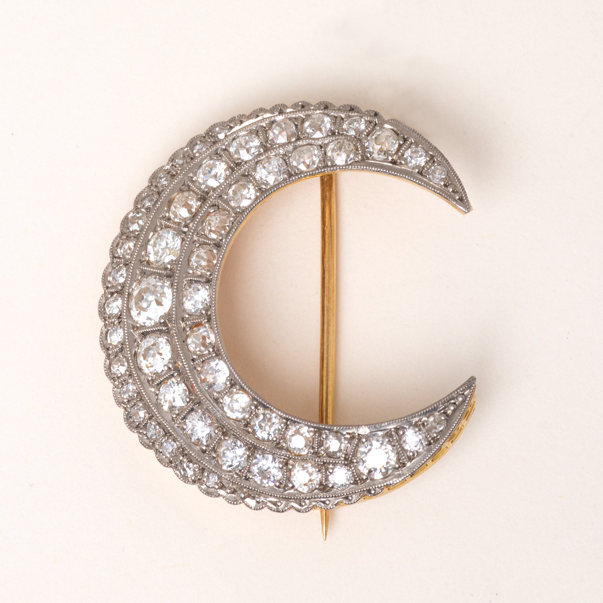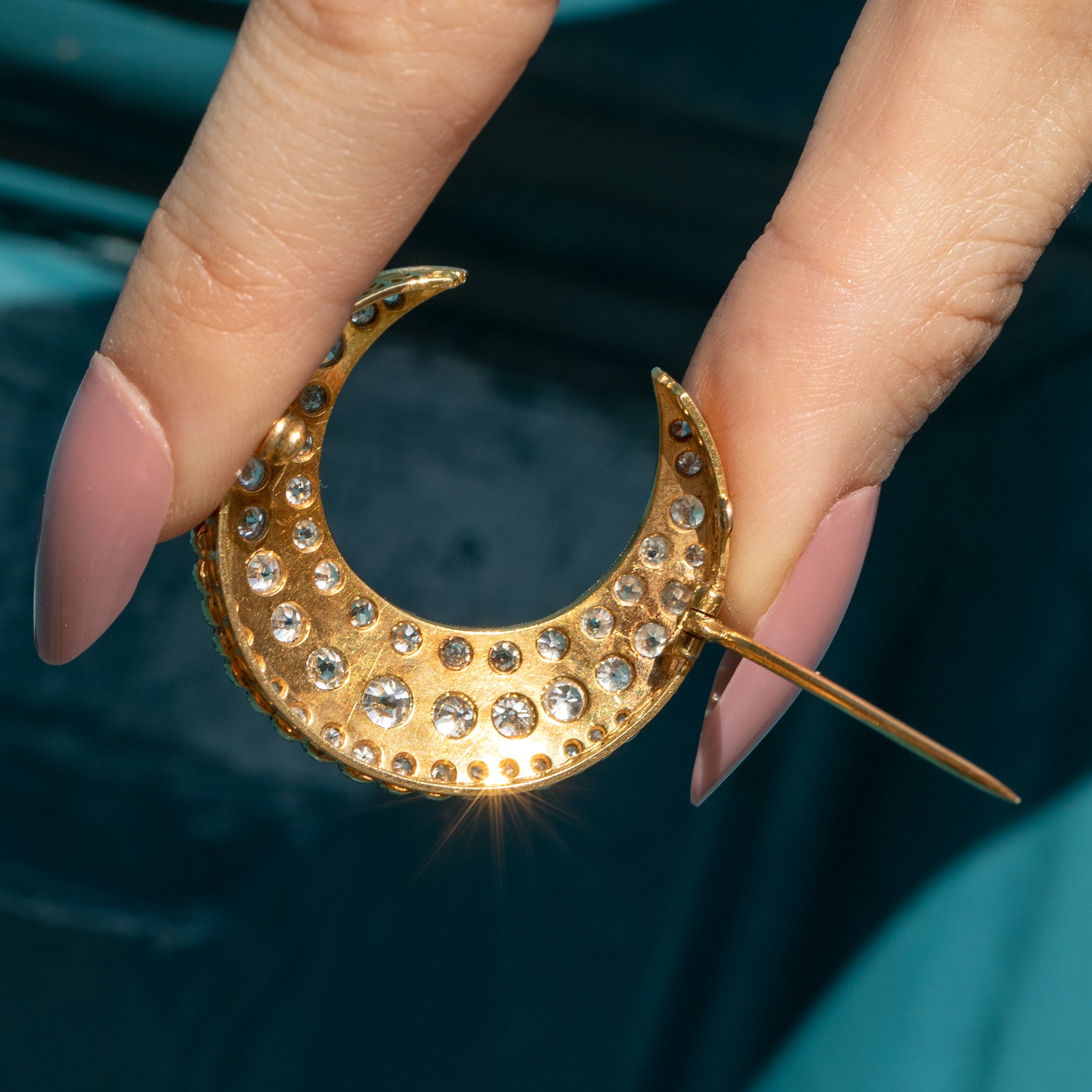 Each Diamond is bright and lively, with old-mine and old-European cut Diamonds filling every crevice with sparkle. With three rows of Diamonds to feast your eyes on, this rare find will command attention on the lapel of your blazer. This high-carat Gold brooch is gorgeous to look at, she abounds with romantic symbolism and is historically associated with feminine power. Destined to impress, don't let this once-in-a-lifetime crescent moon pass you by.