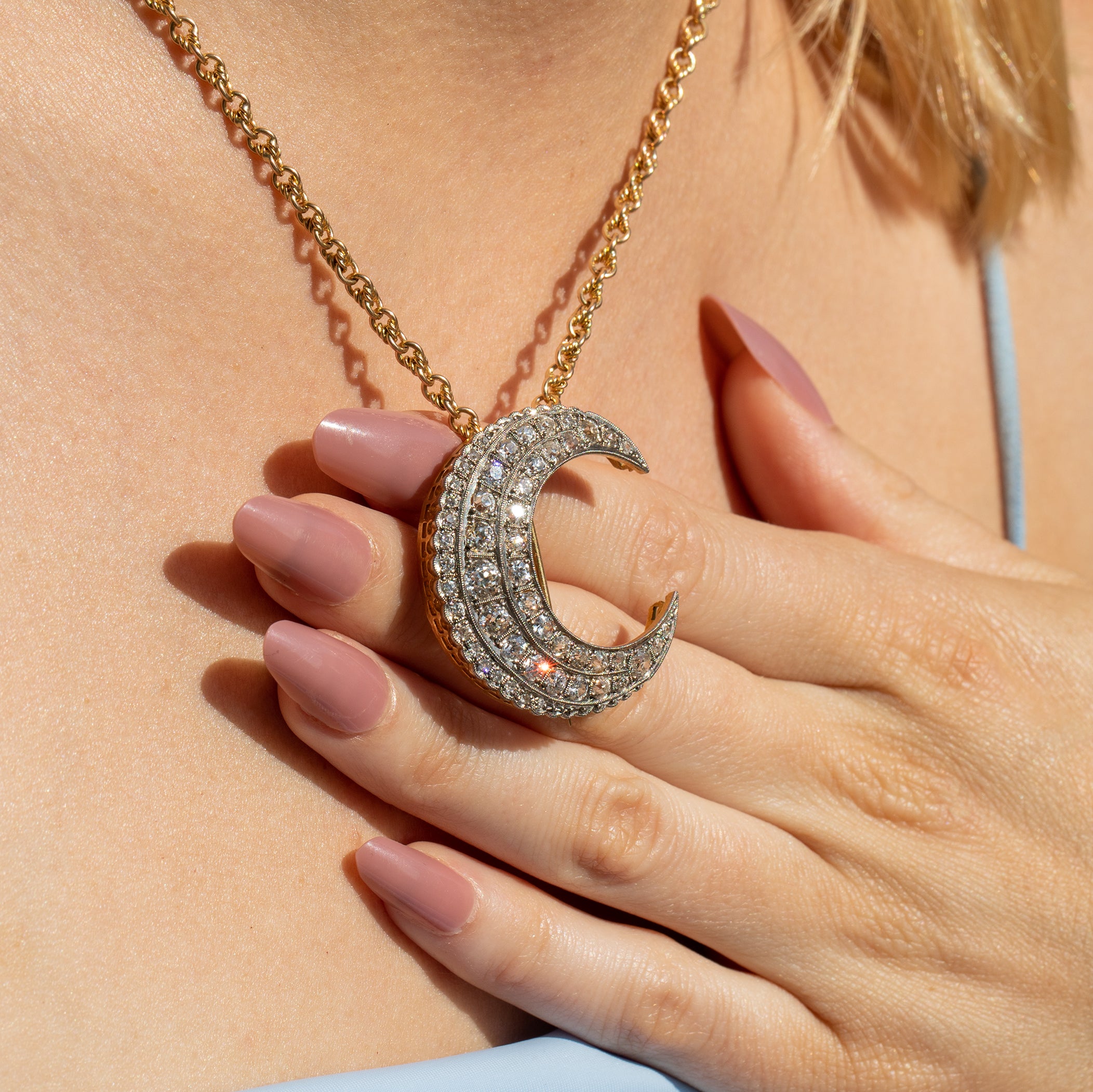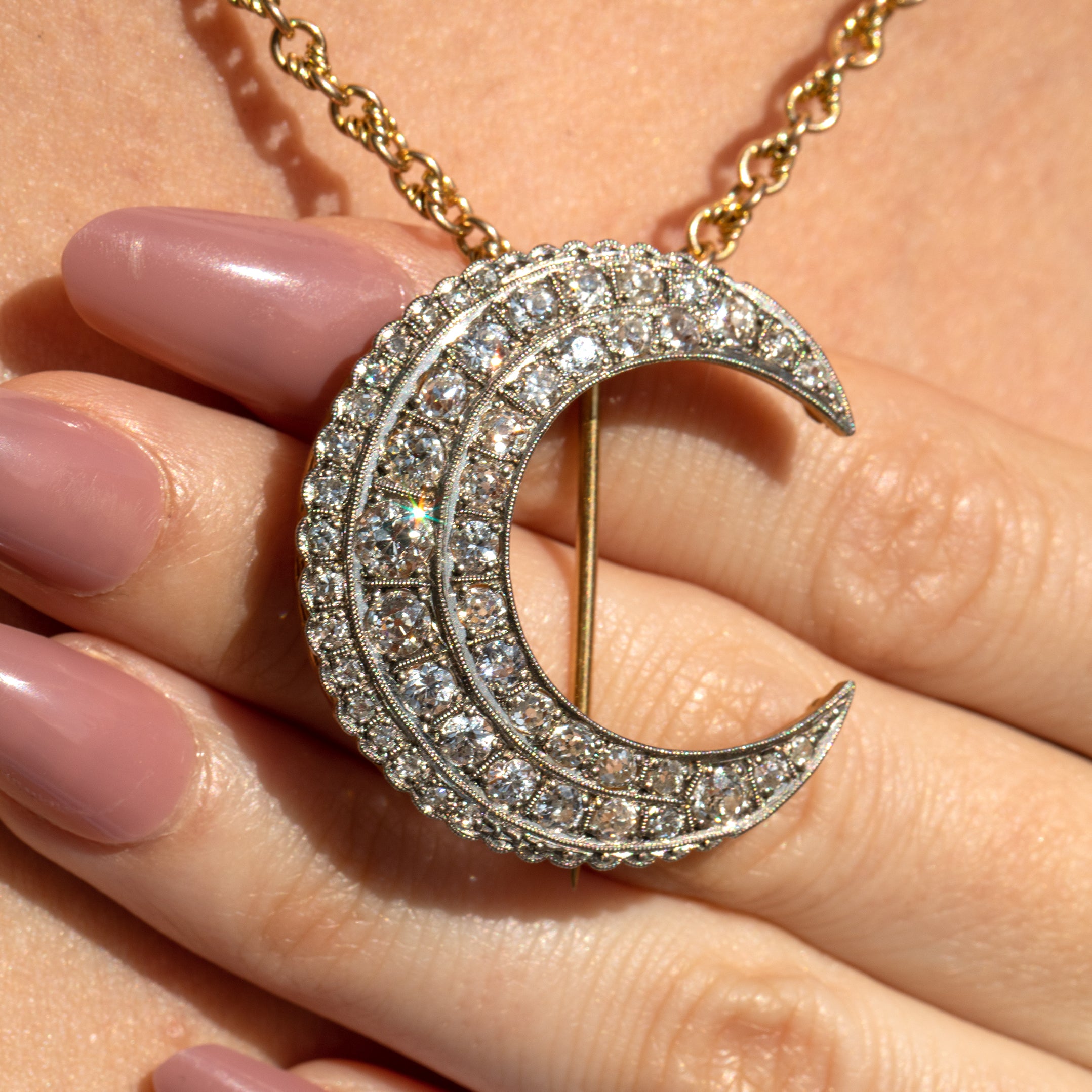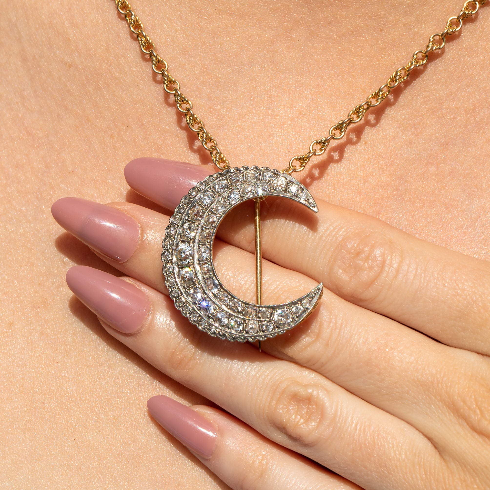 Each Diamond is bright and lively, with old-mine and old-European cut Diamonds filling every crevice with sparkle. With three rows of Diamonds to feast your eyes on, this rare find will command attention on the lapel of your blazer. This high-carat Gold brooch is gorgeous to look at, she abounds with romantic symbolism and is historically associated with feminine power. Destined to impress, don't let this once-in-a-lifetime crescent moon pass you by.