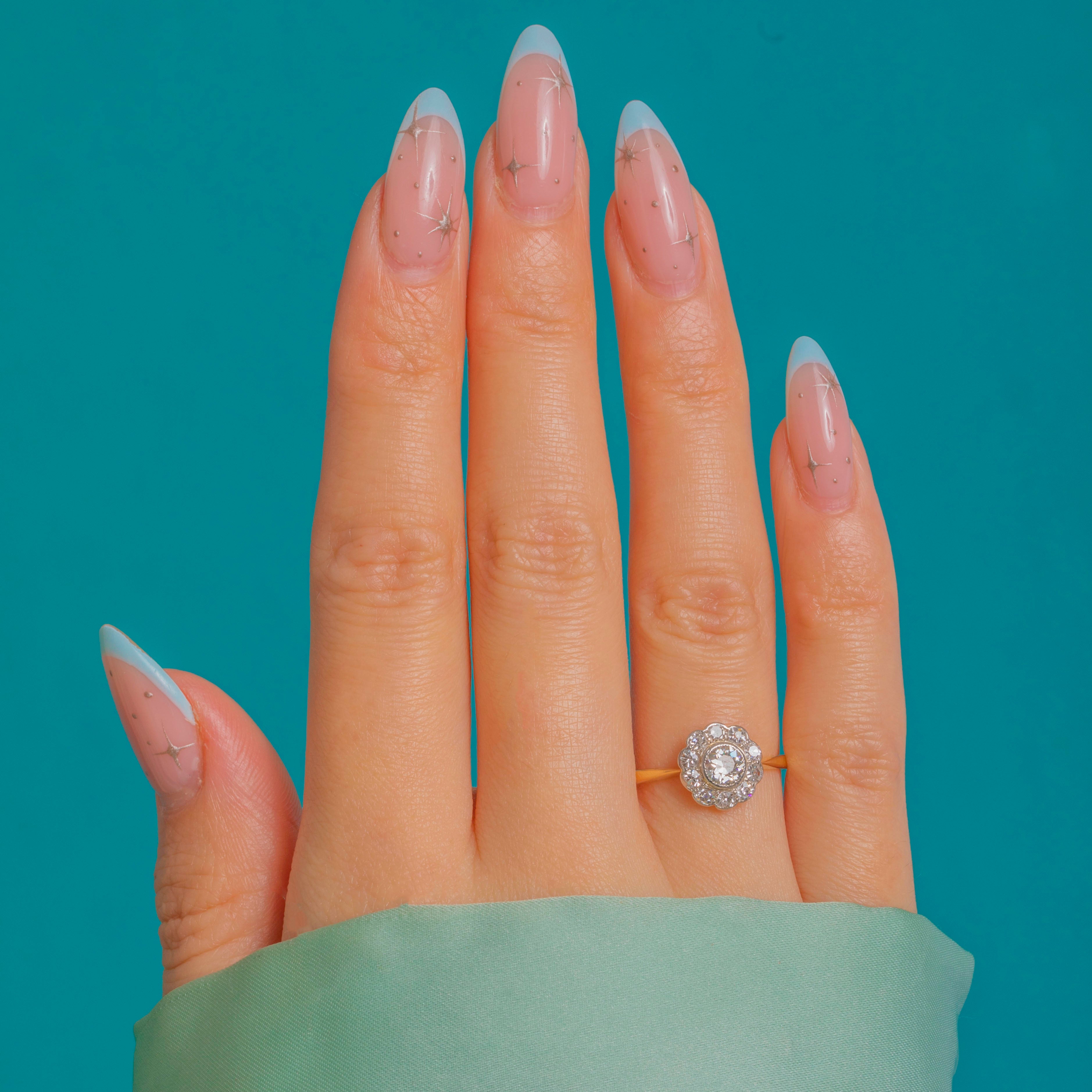 Low in profile and wonderfully wearable, the Platinum settings lend a cool, silvery brilliance to the Diamonds, while the warm 18ct Gold band offers an elegant contrast. With approximately 0.40ct of Diamonds in total, this classic “daisy” blooms with timeless romance—effortlessly graceful for everyday luxury or a sentimental engagement ring choice.