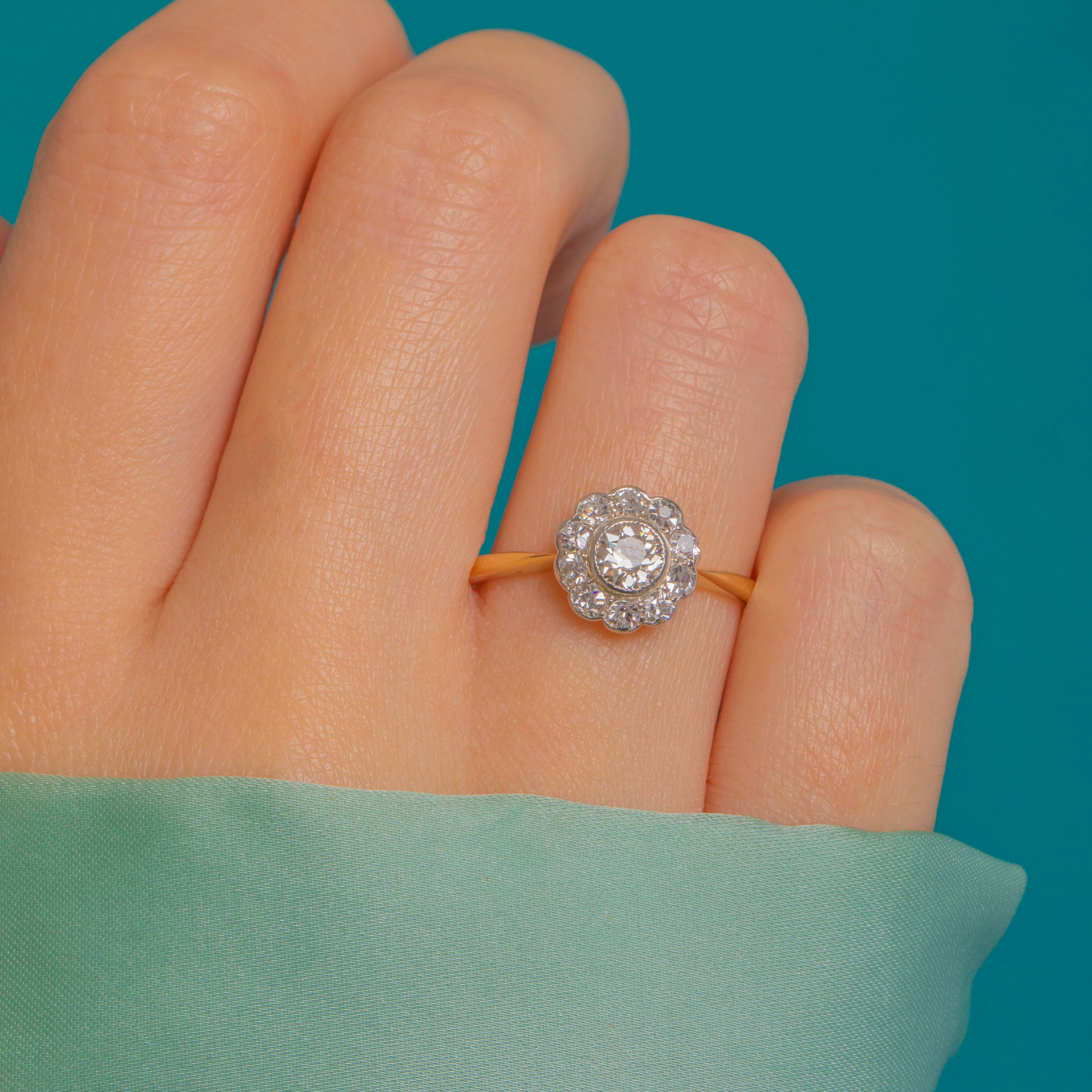 A quintessential Edwardian daisy cluster, this delicate two-tone ring marries a slim 18ct Gold shank with a refined Platinum milgrained head. At its heart sits a bright round 0.25ct Diamond framed by a halo of well-matched round Diamonds, their bead-set sparkle accented by a scalloped outline and crisp milgrain for that unmistakable early 20th-century finesse.