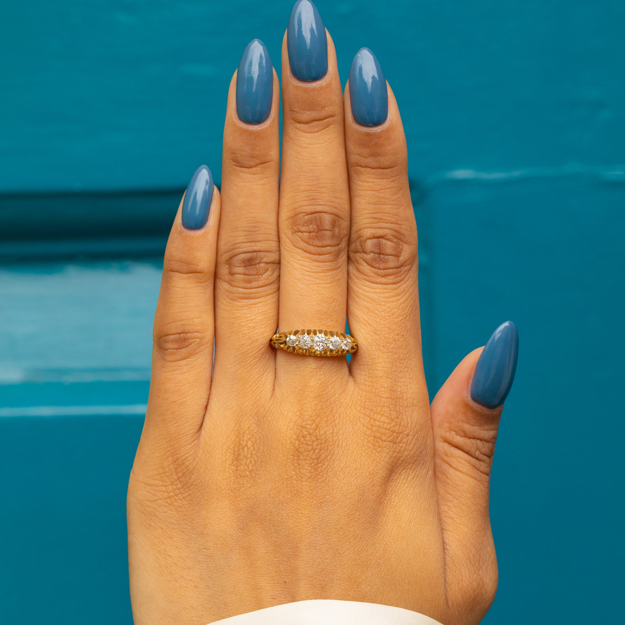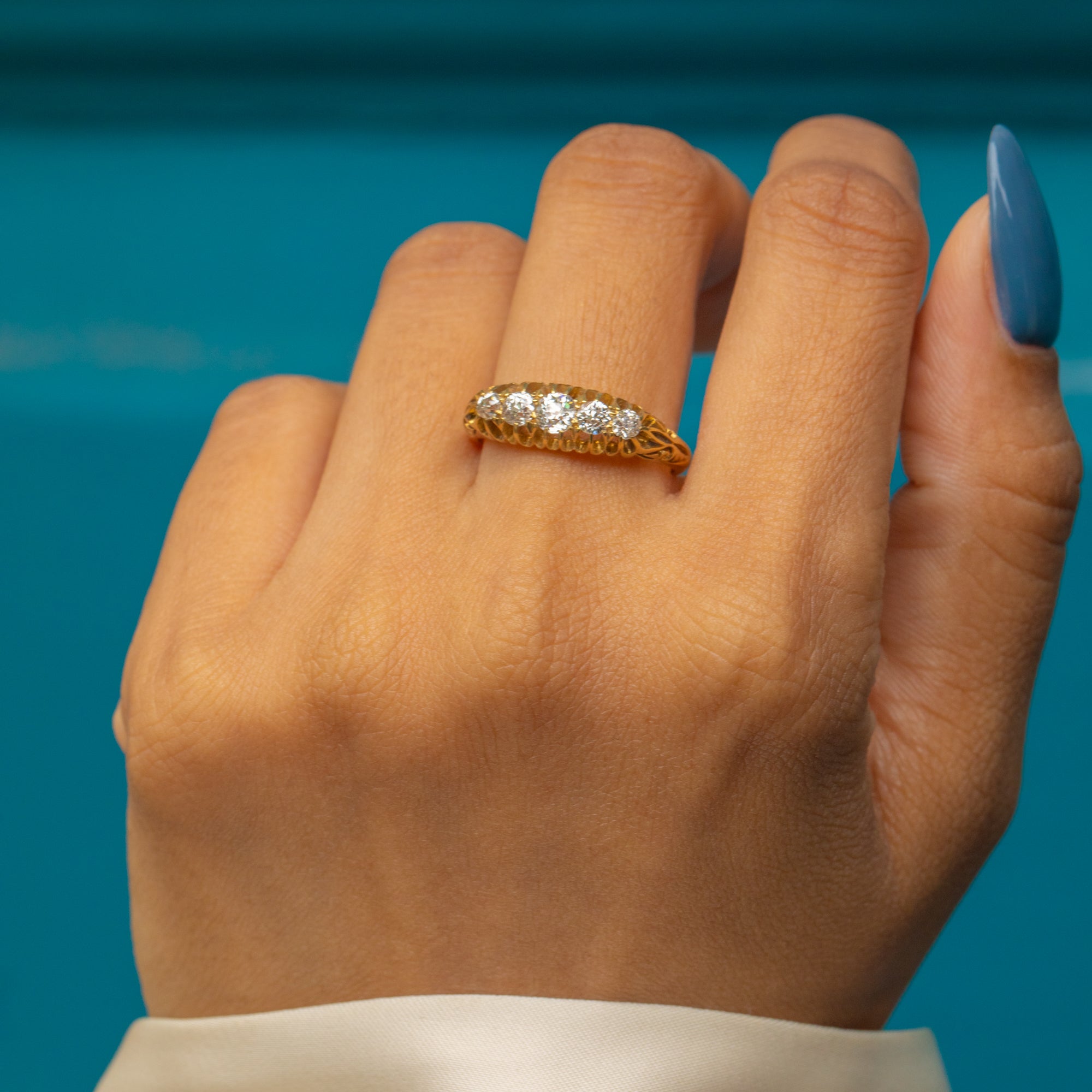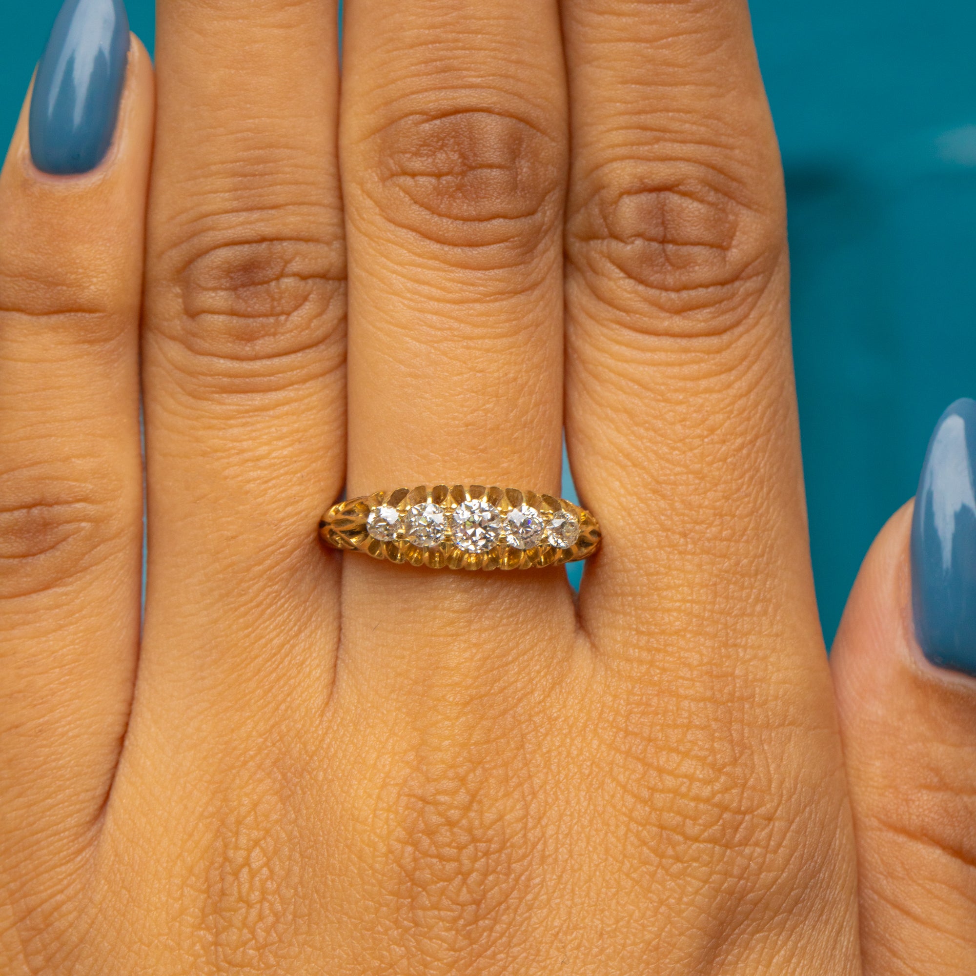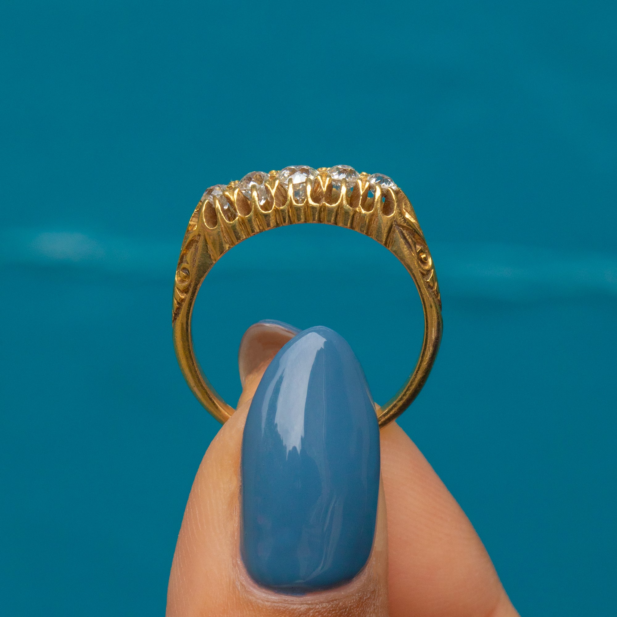 A sparkling sensation, this antique 18ct Gold Diamond five stone ring will satisfy your every jewellery craving. Boasting five twinkling Diamonds with a total weight of 0.50ct, this Victorian 18ct Gold ring is a timeless classic that packs a punch!