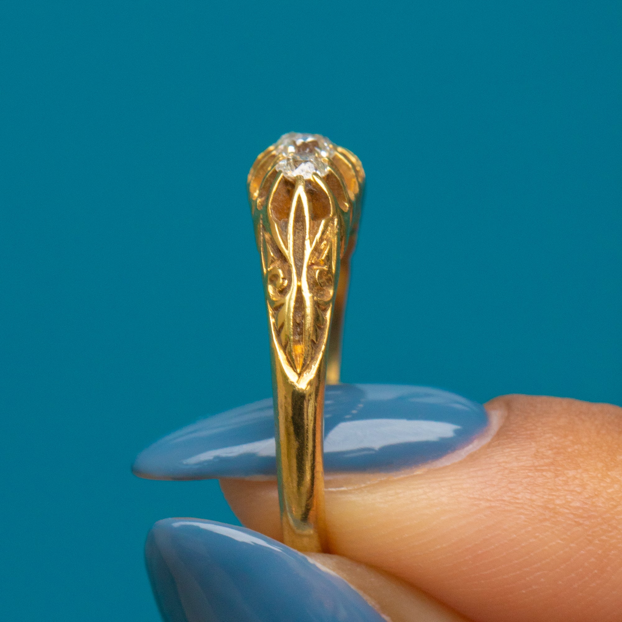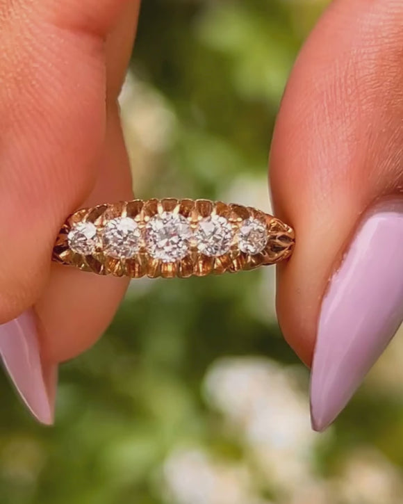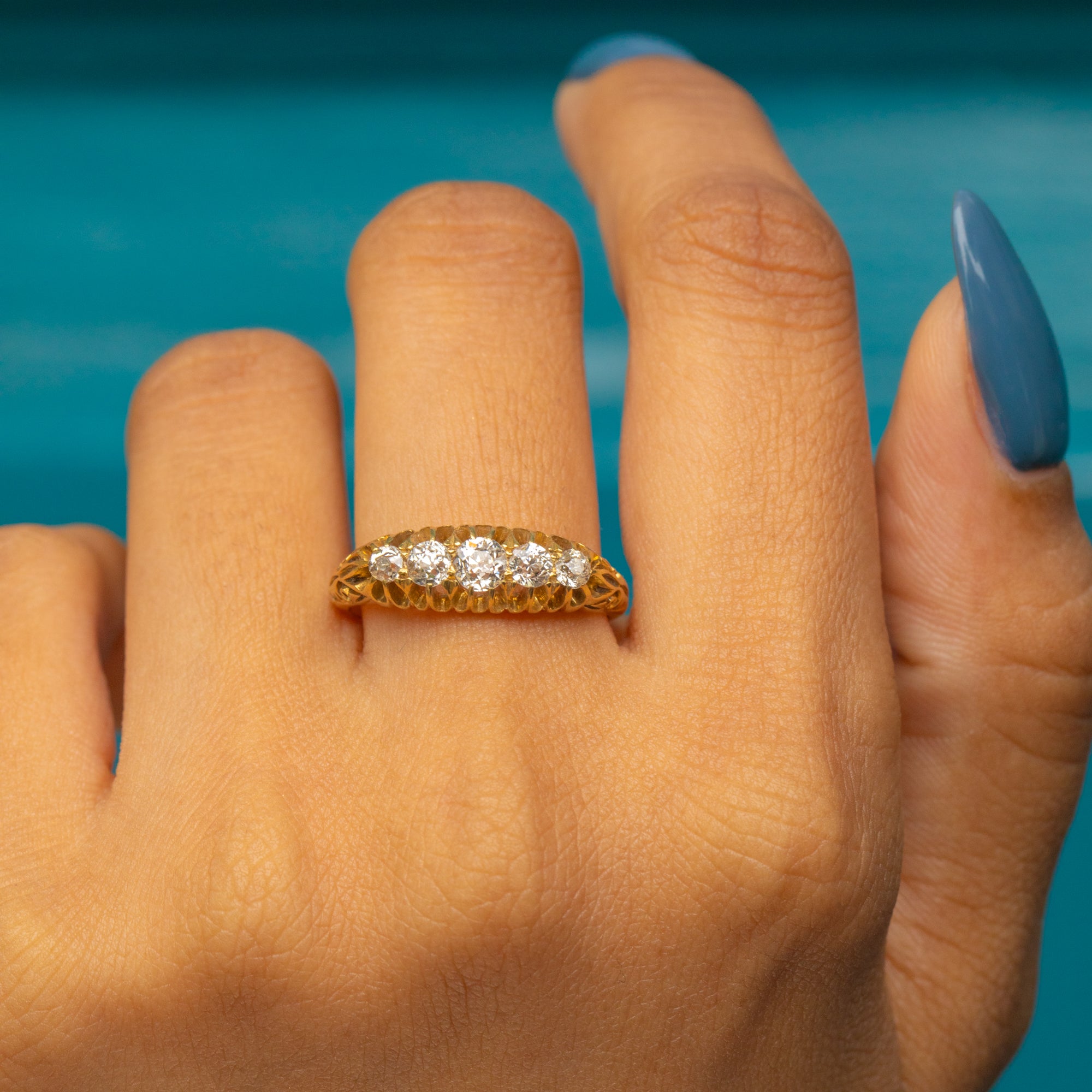 Classically beautiful and elegantly proportioned, this Victorian ring does the job it is designed to do - to enthrall and enchant the wearer with its five Old-Mine Cut Diamonds! Whether you are treating yourself or treating your partner, this ring will stay with you through life's adventures!