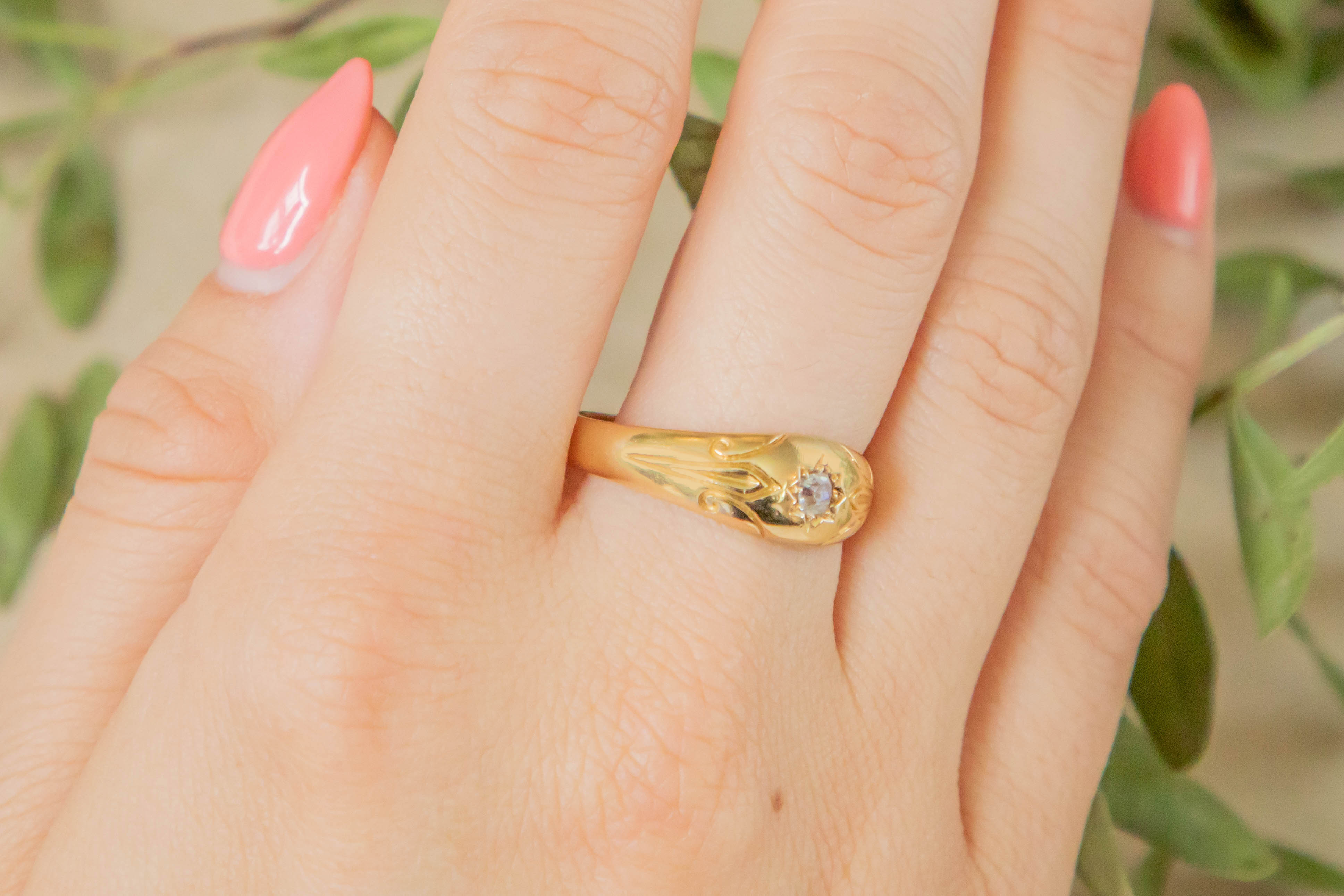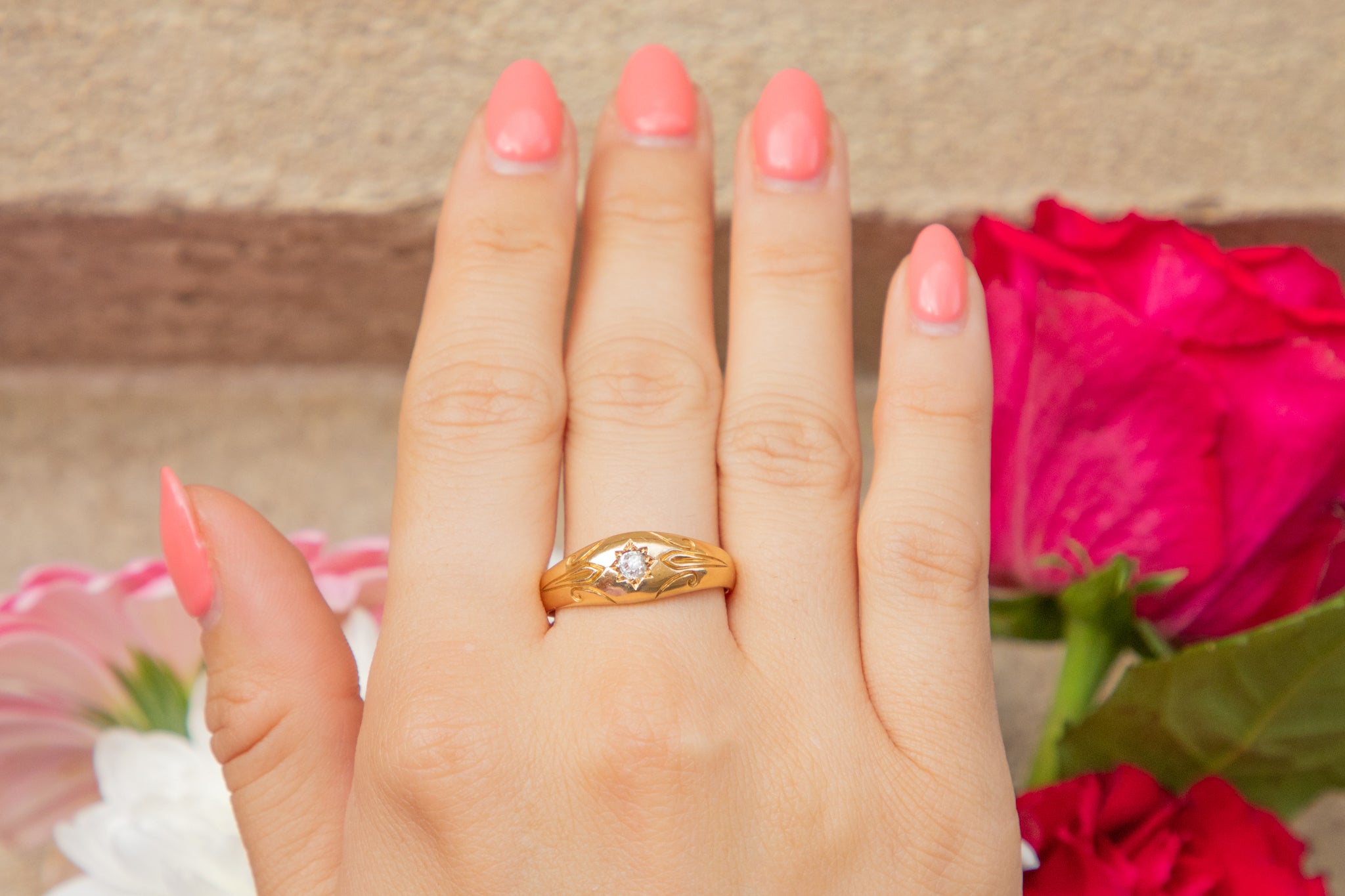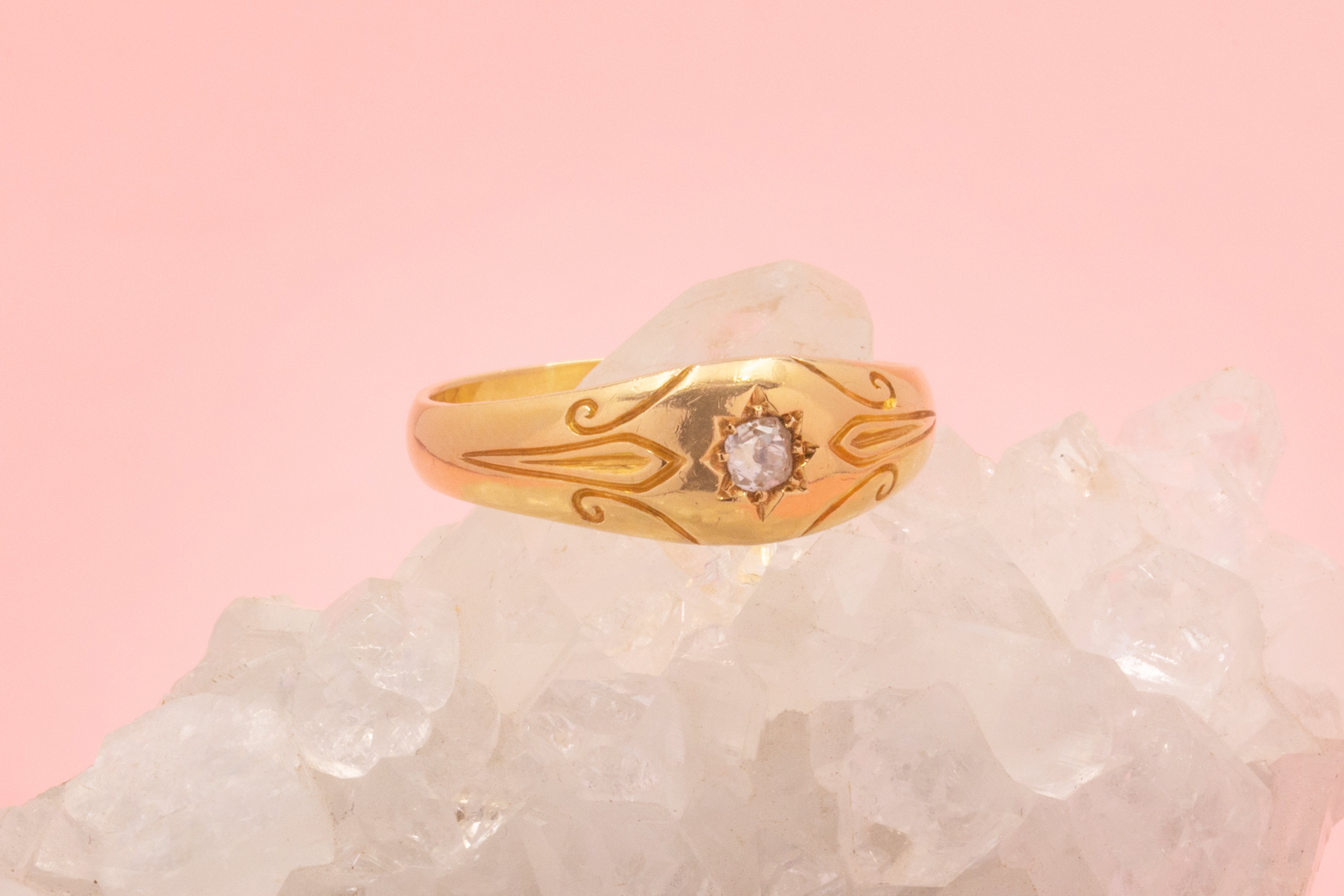 A timeless antique 18ct Gold Diamond gypsy ring, emanating luxury from every angle. With a twinkling 0.10ct Diamond nestled in her starry centre, she boasts ornate scrolled engraved shoulders and a gorgeous glossy finish!