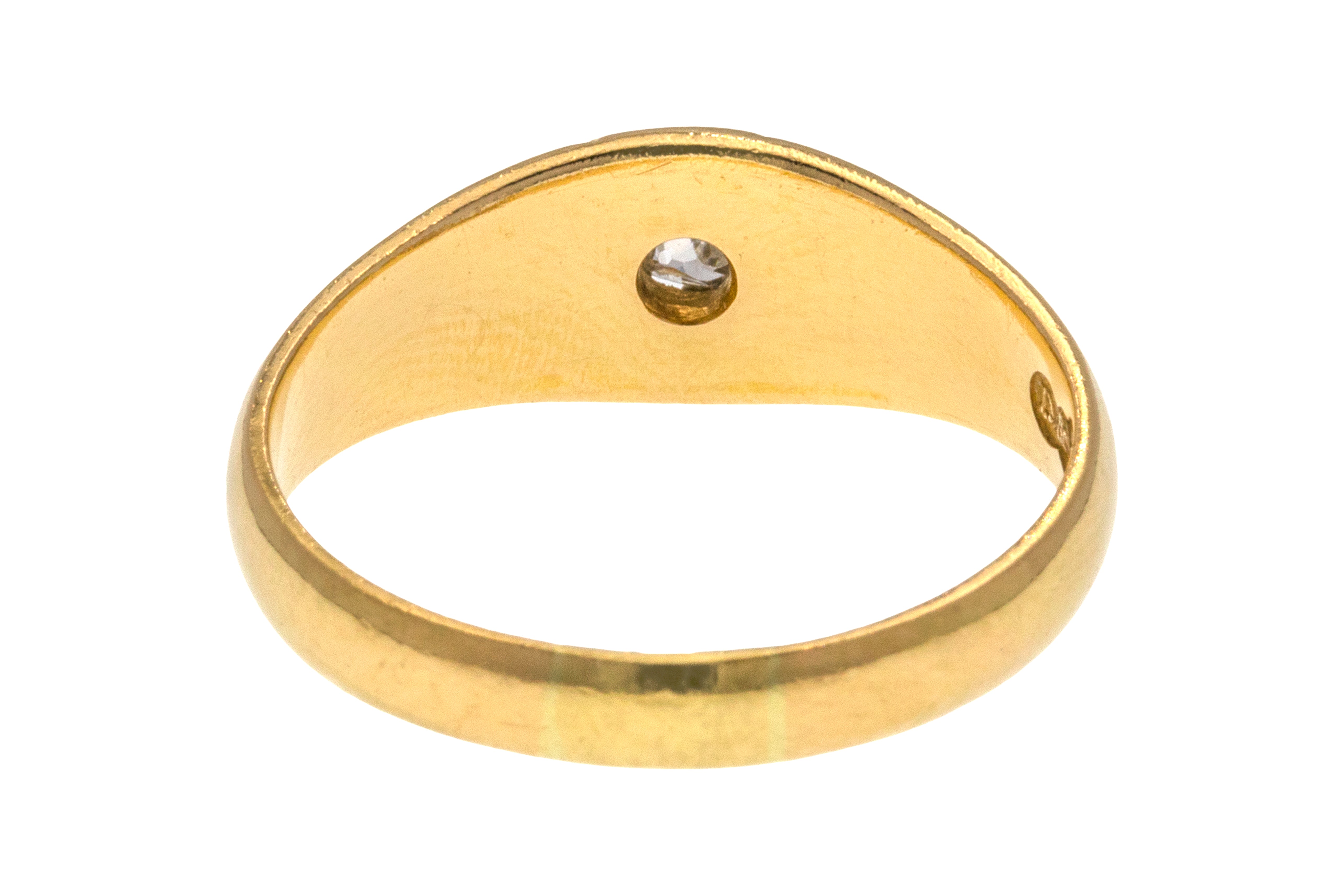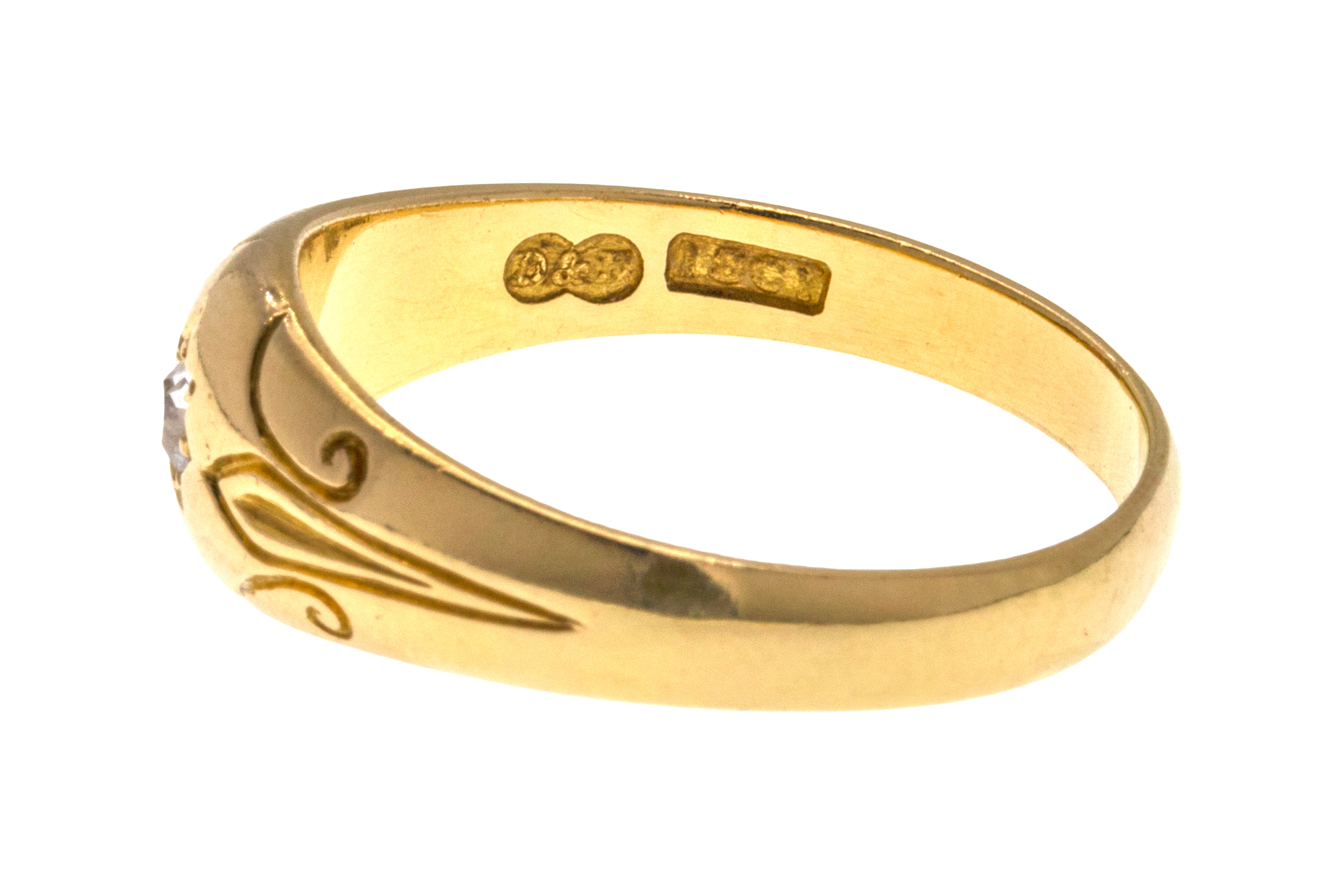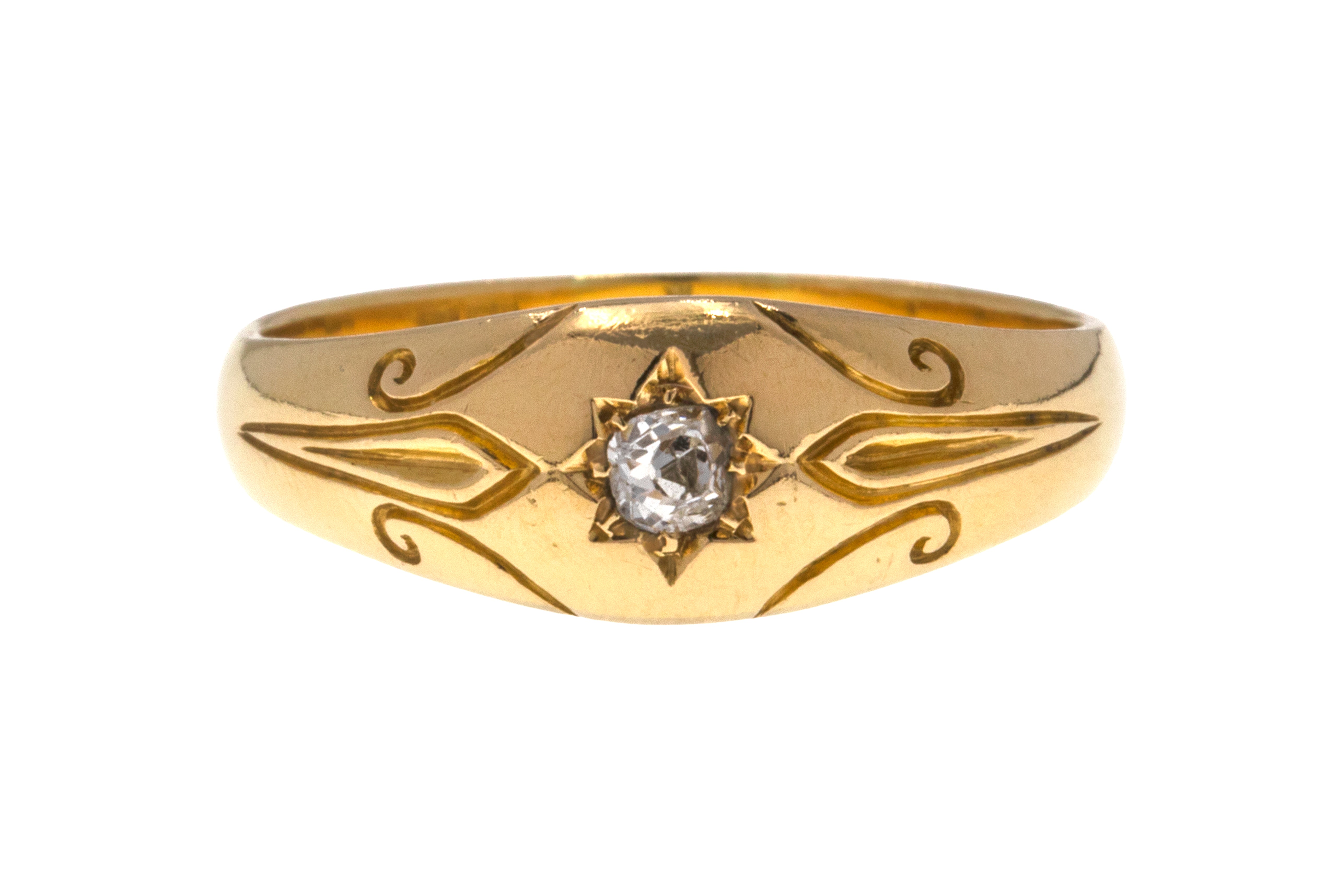 VERY GOOD-EXCELLENT. This antique 18ct Gold Diamond "gypsy" ring is in wonderful condition throughout. Her Diamond is securely set and sparkles to perfection, the star settings remaining crisp and clear. The grooved engravings are also beautiful, and there is only the odd very small scratch to the band to note, commensurate with age.
