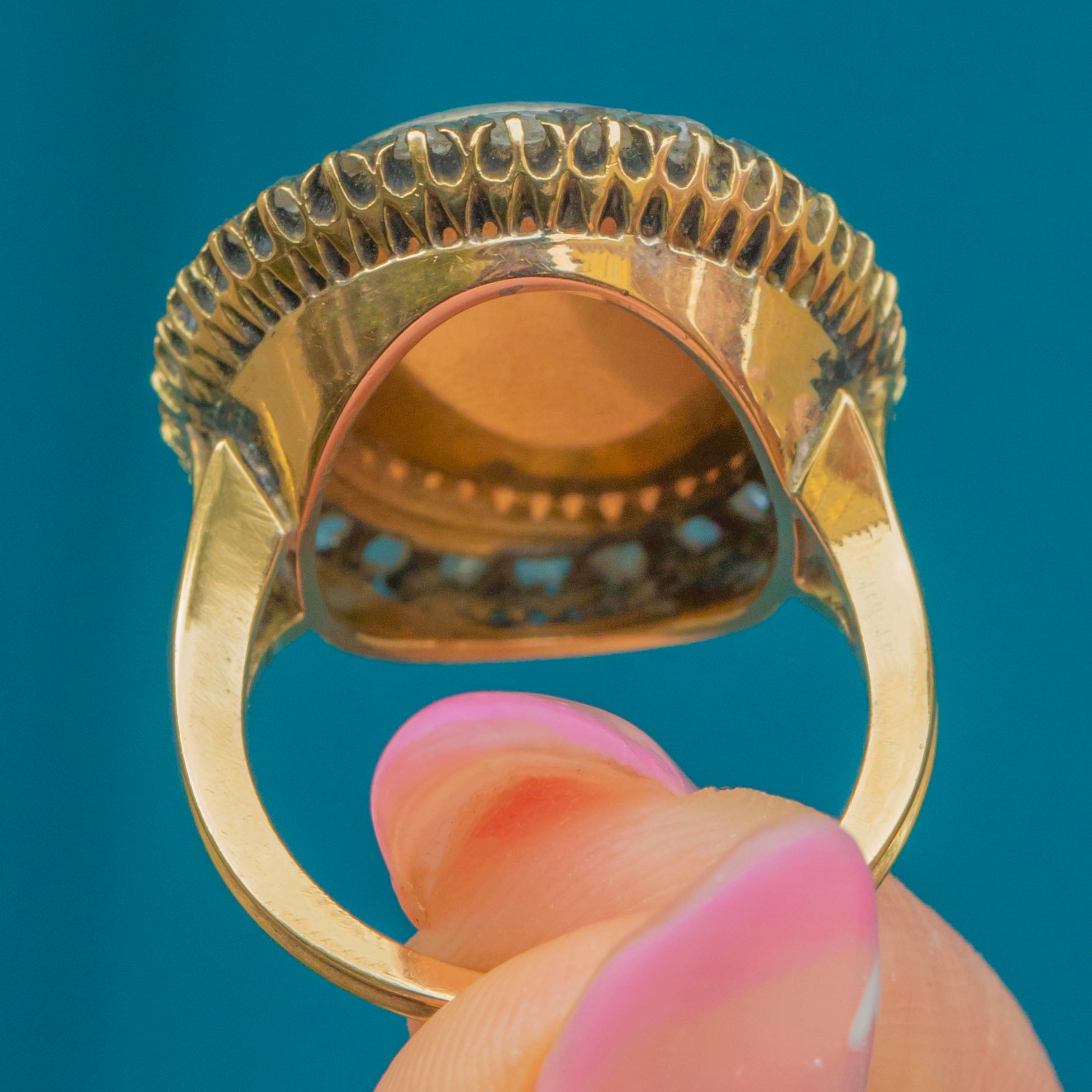This exquisite antique 18ct Gold Diamond miniature portrait ring is a uniquely European treasure- mostly likely Italian or possibly French! Showcasing an elegant lady with impeccably styled hair and Georgian Pompadour style attire, framed by a dazzling spread of rose-cut Diamonds set in 18ct Gold.