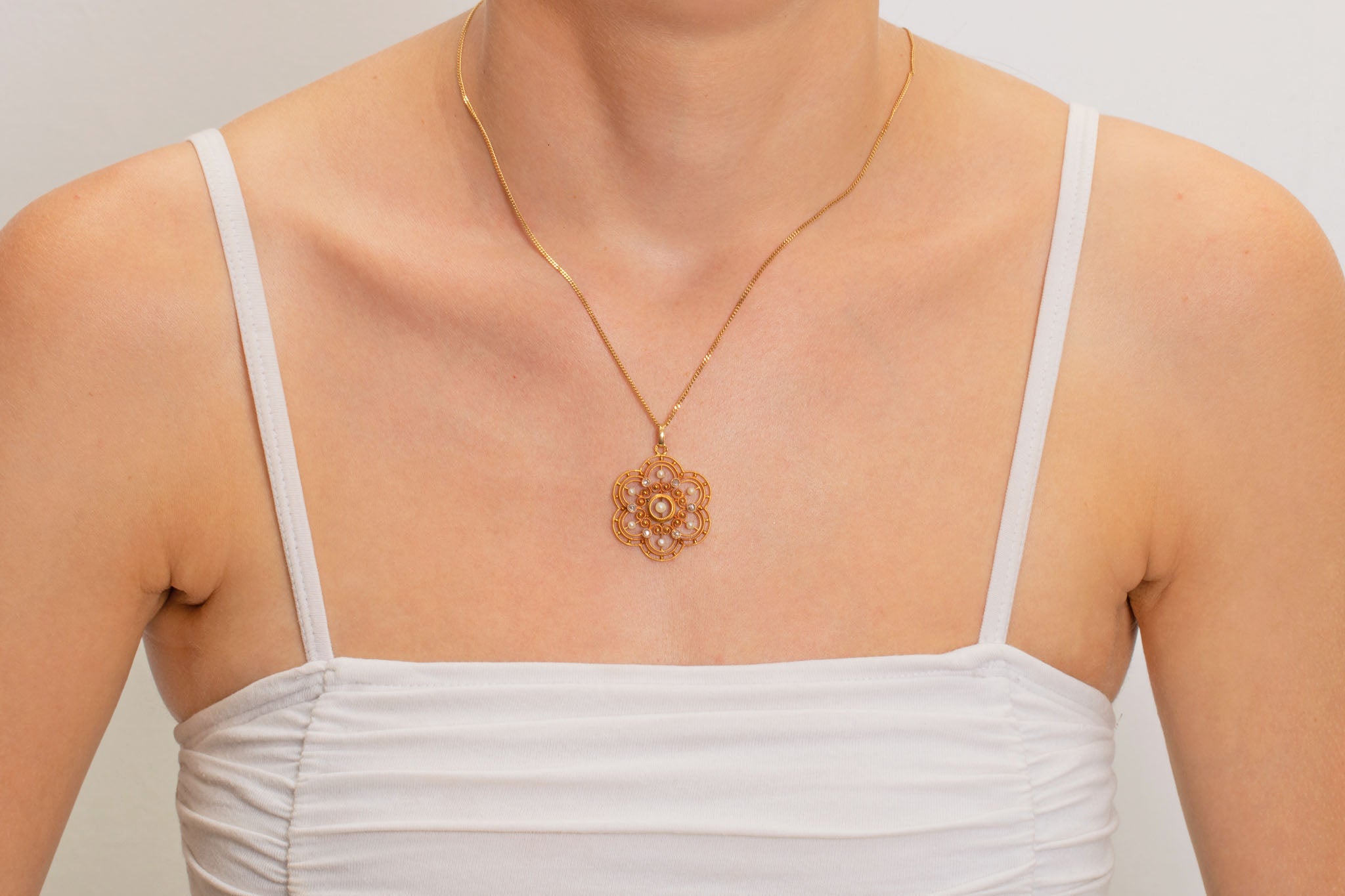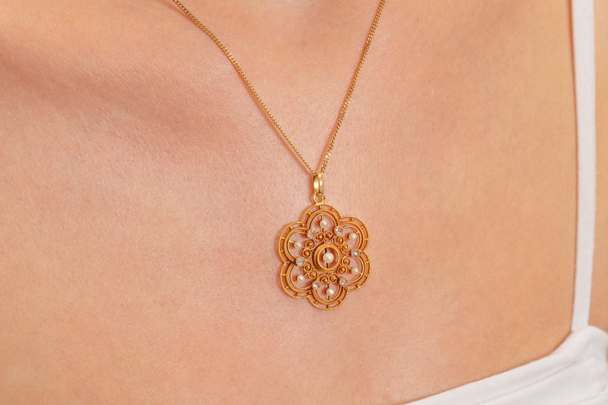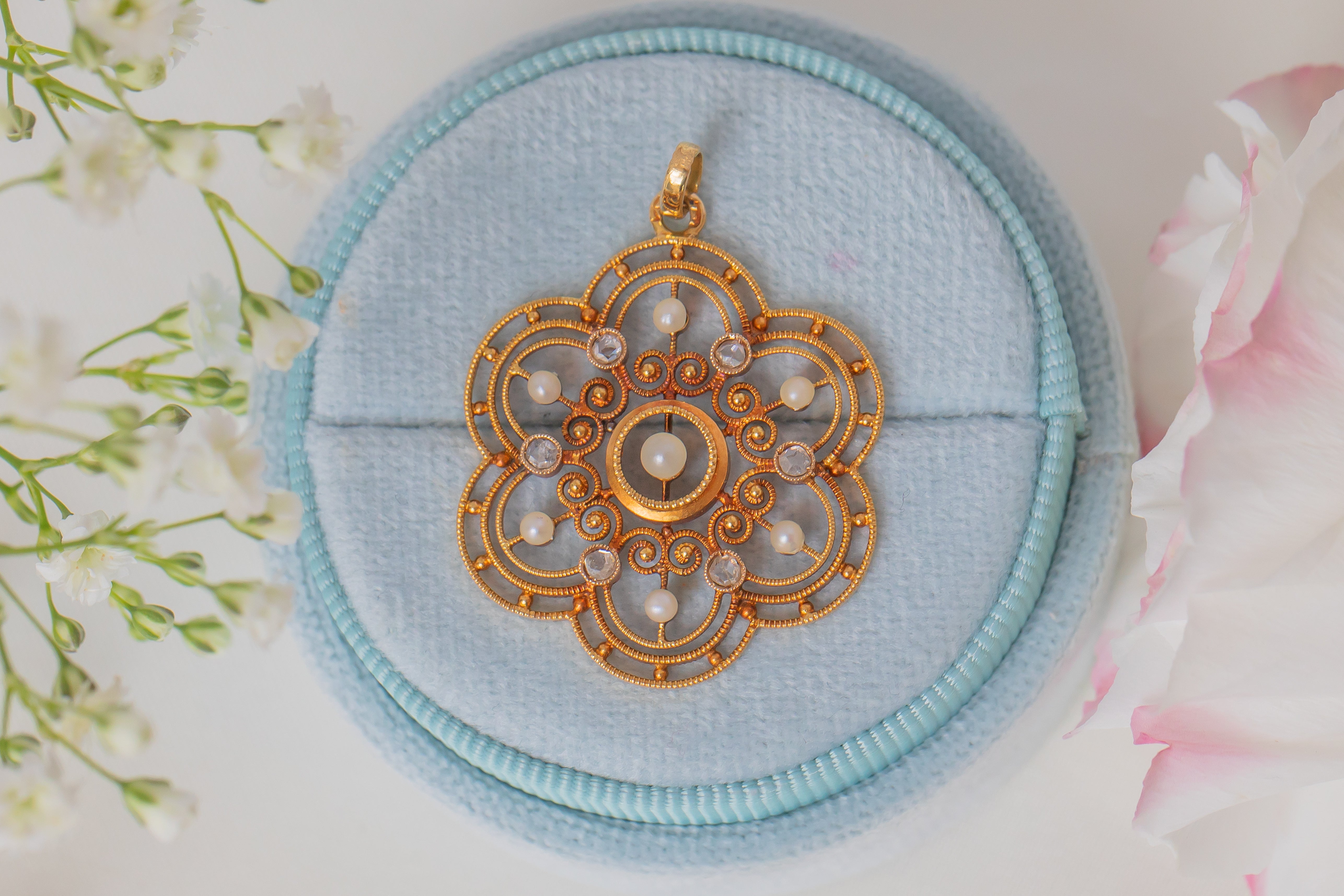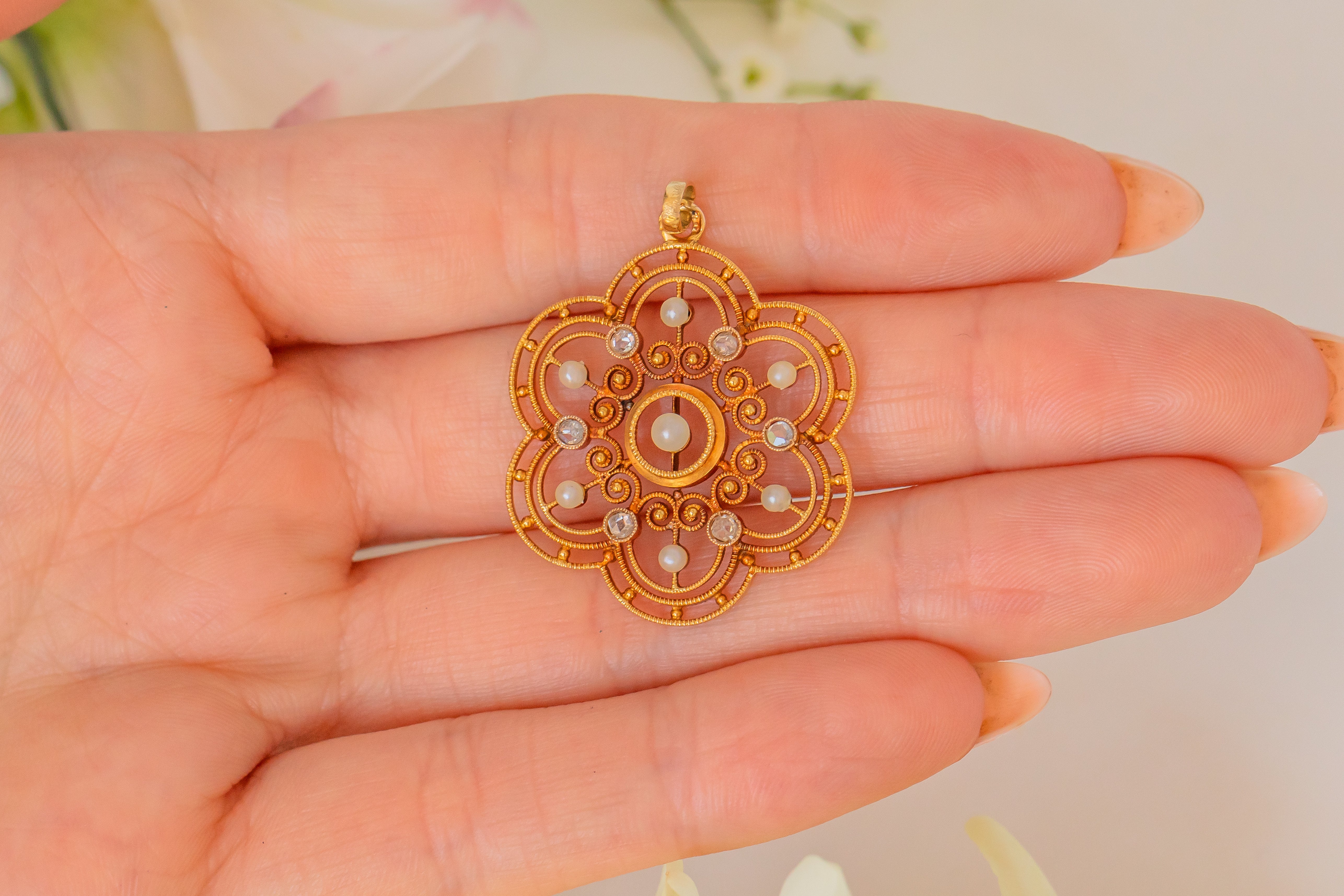 Antique 18ct Gold Diamond Pearl 'Flower' Pendant