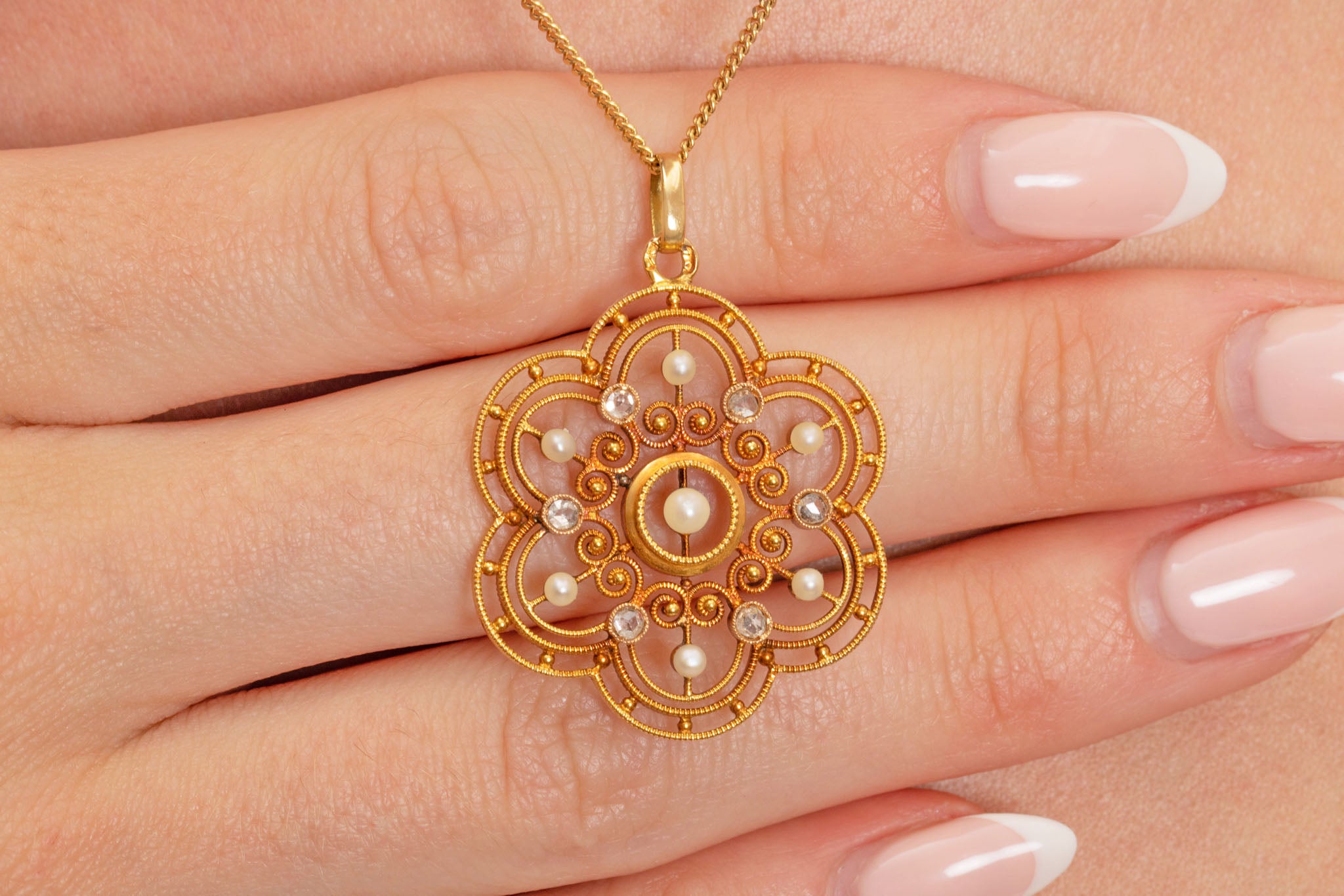 Her 18ct Gold looks rich and bright throughout, with fine filigree ornamental detailing in her centre. With a secure 18ct Gold bale, simply affix her to a