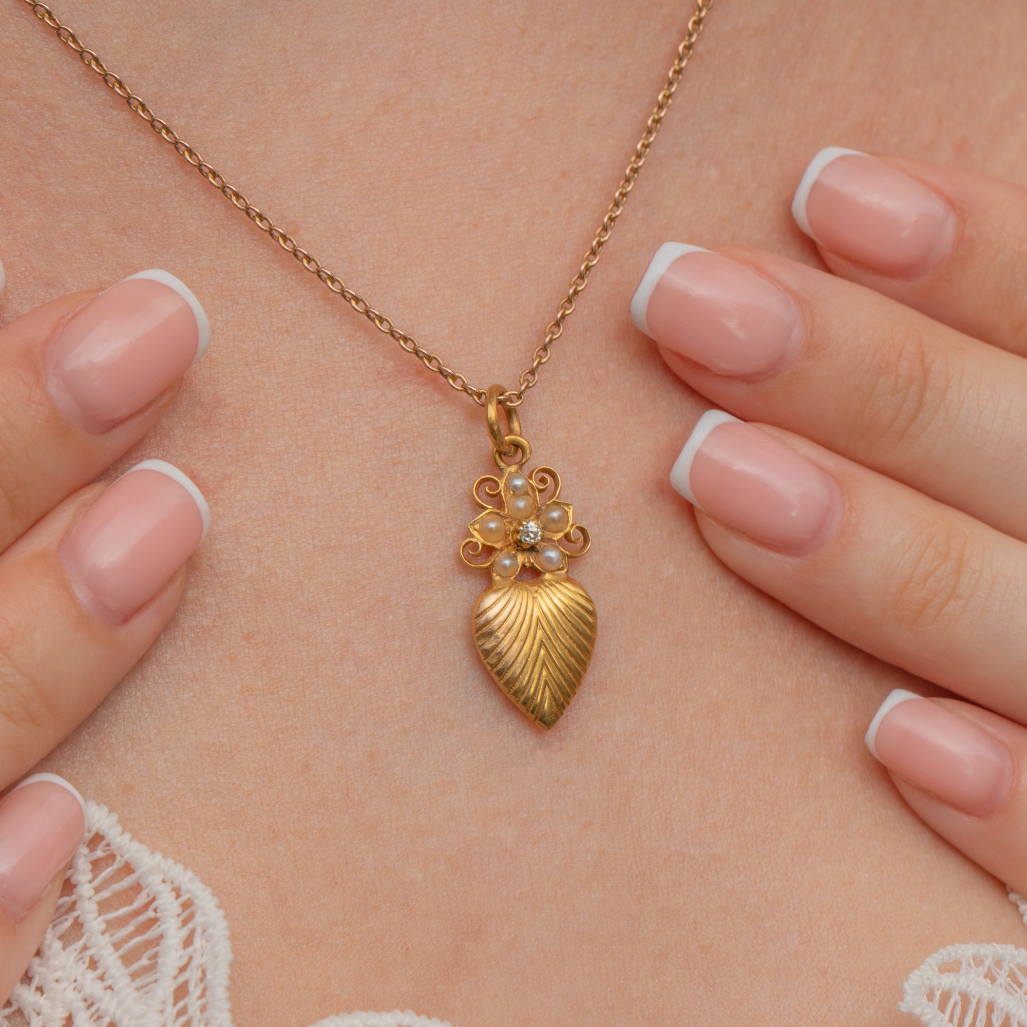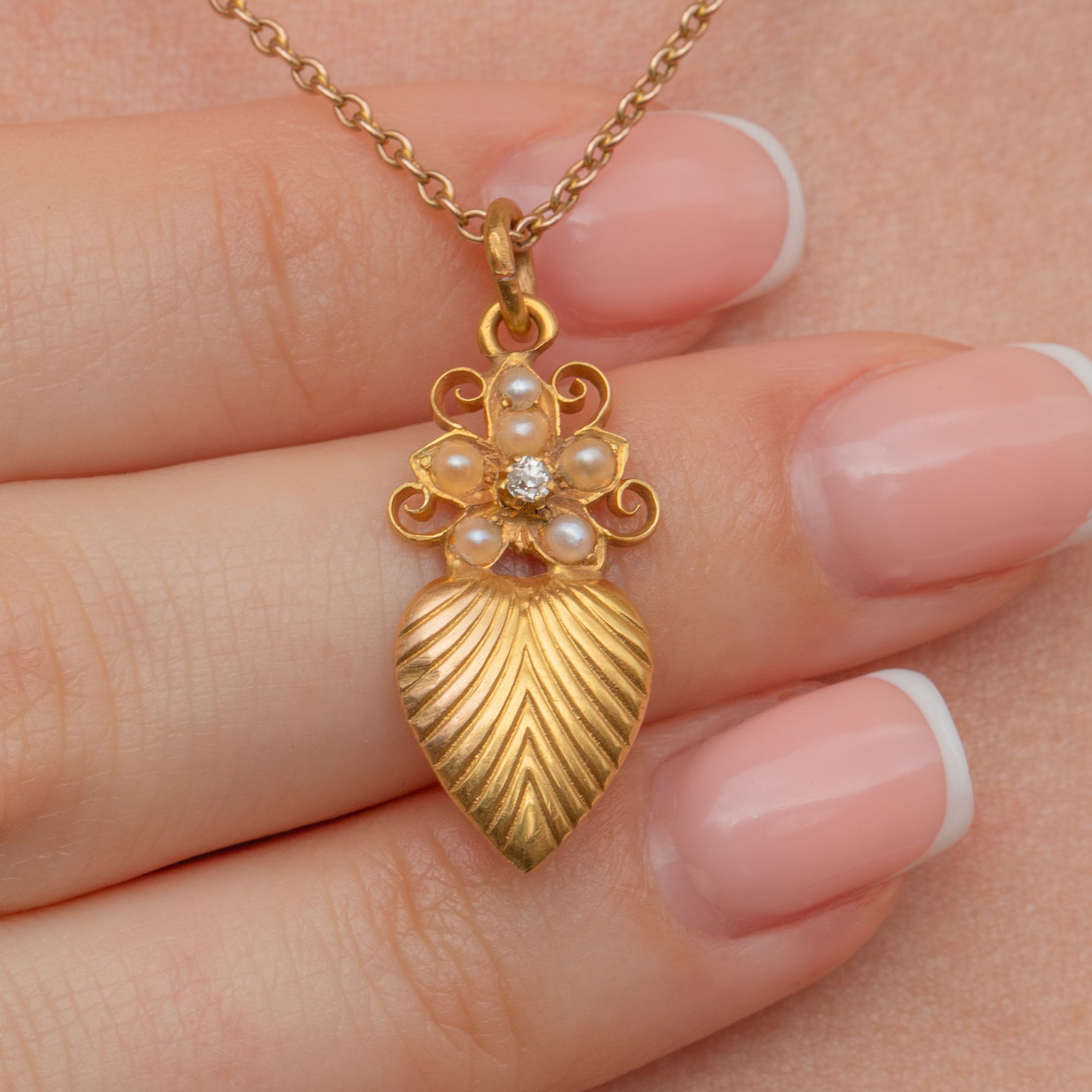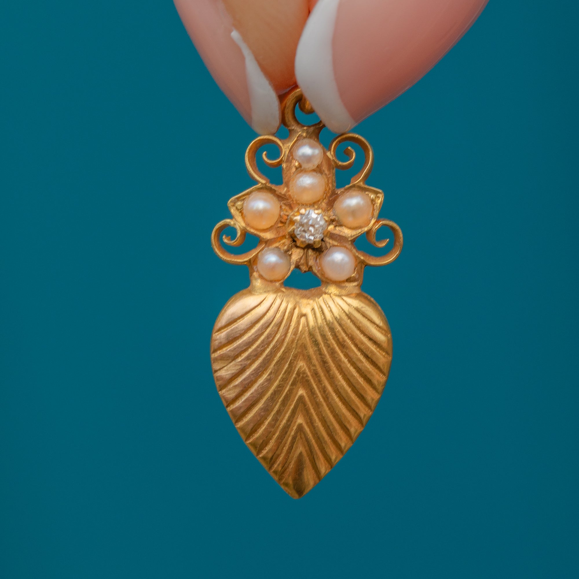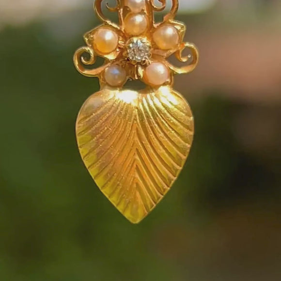 The ridged heart charm catches the light spectacularly, crowned by ornate Goldwork with an enchanting display of plump Pearls haloing a sparkling Diamond. This Victorian pendant is a true treasure that will make your collection stand out from the rest!
