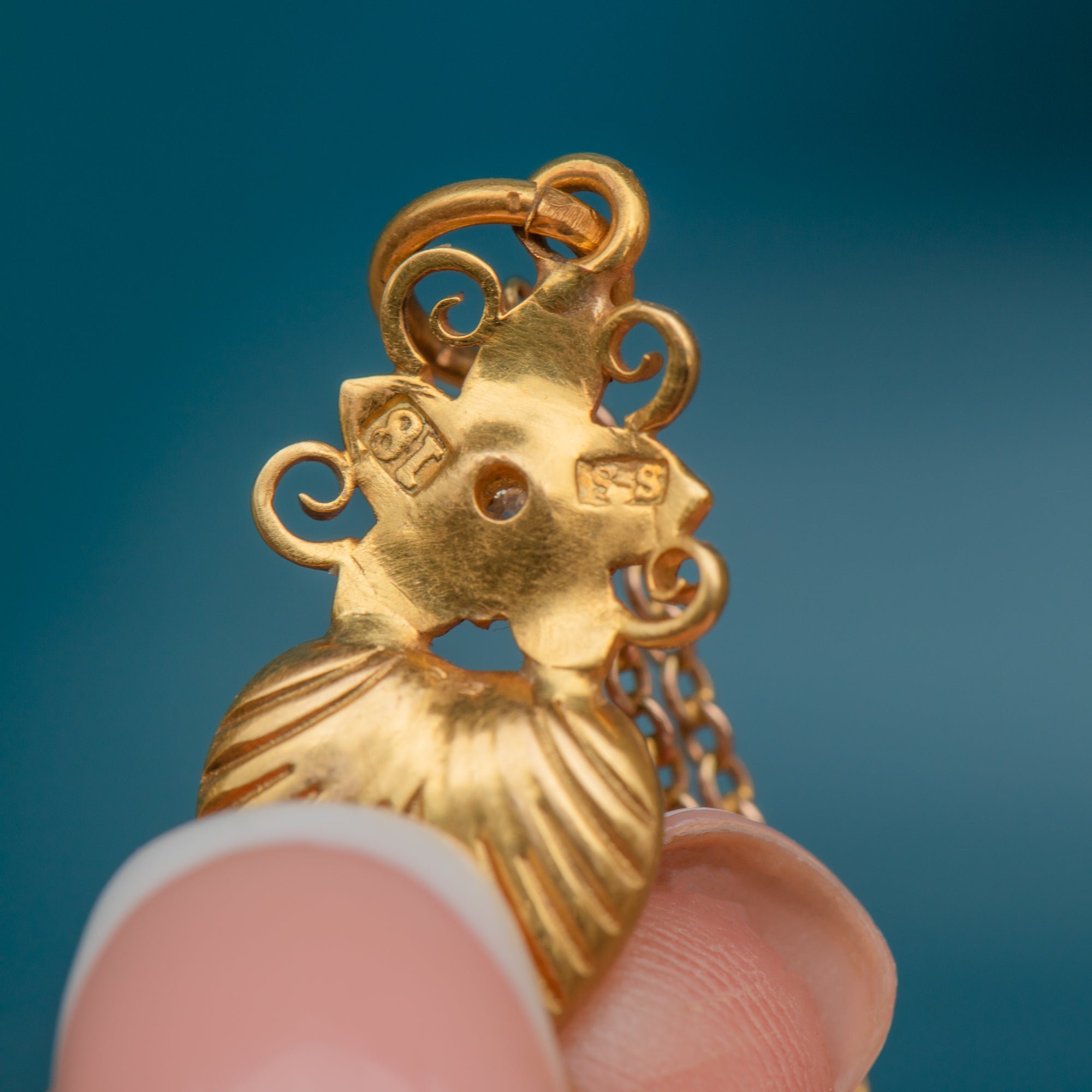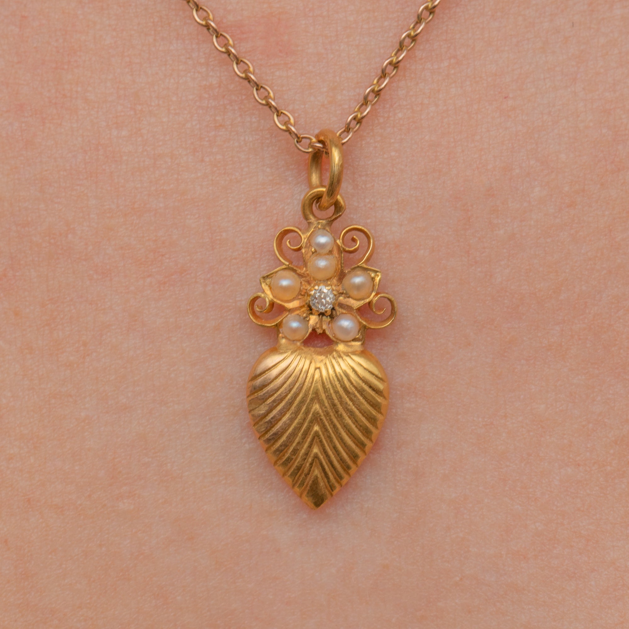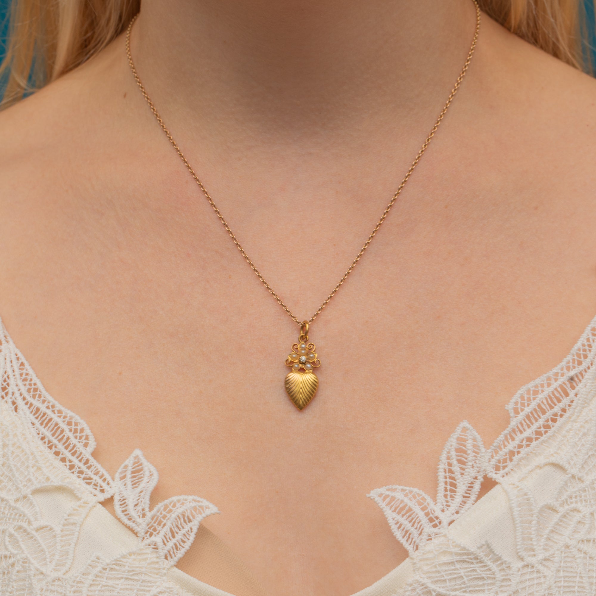 The ridged heart charm catches the light spectacularly, crowned by ornate Goldwork with an enchanting display of plump Pearls haloing a sparkling Diamond. This Victorian pendant is a true treasure that will make your collection stand out from the rest!
