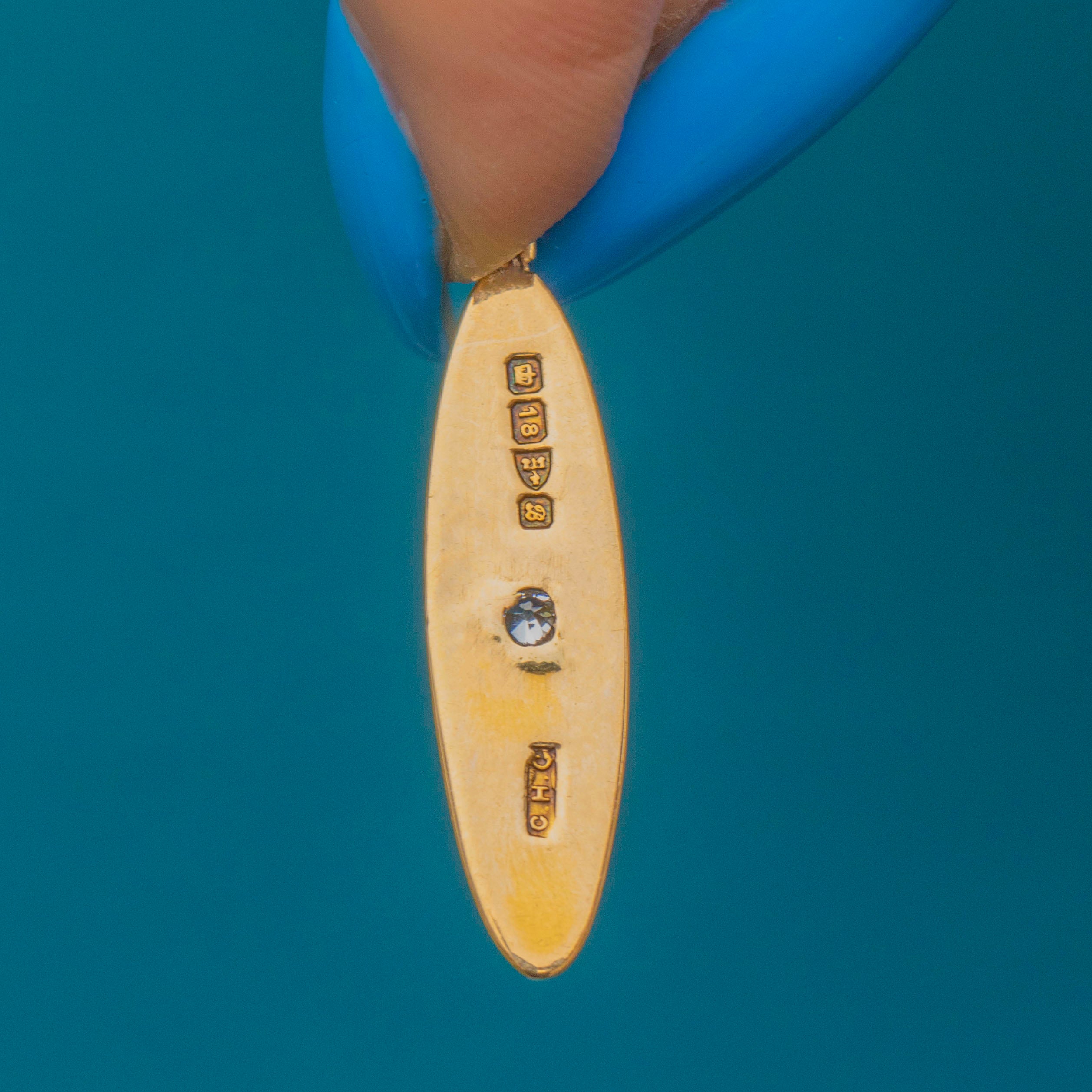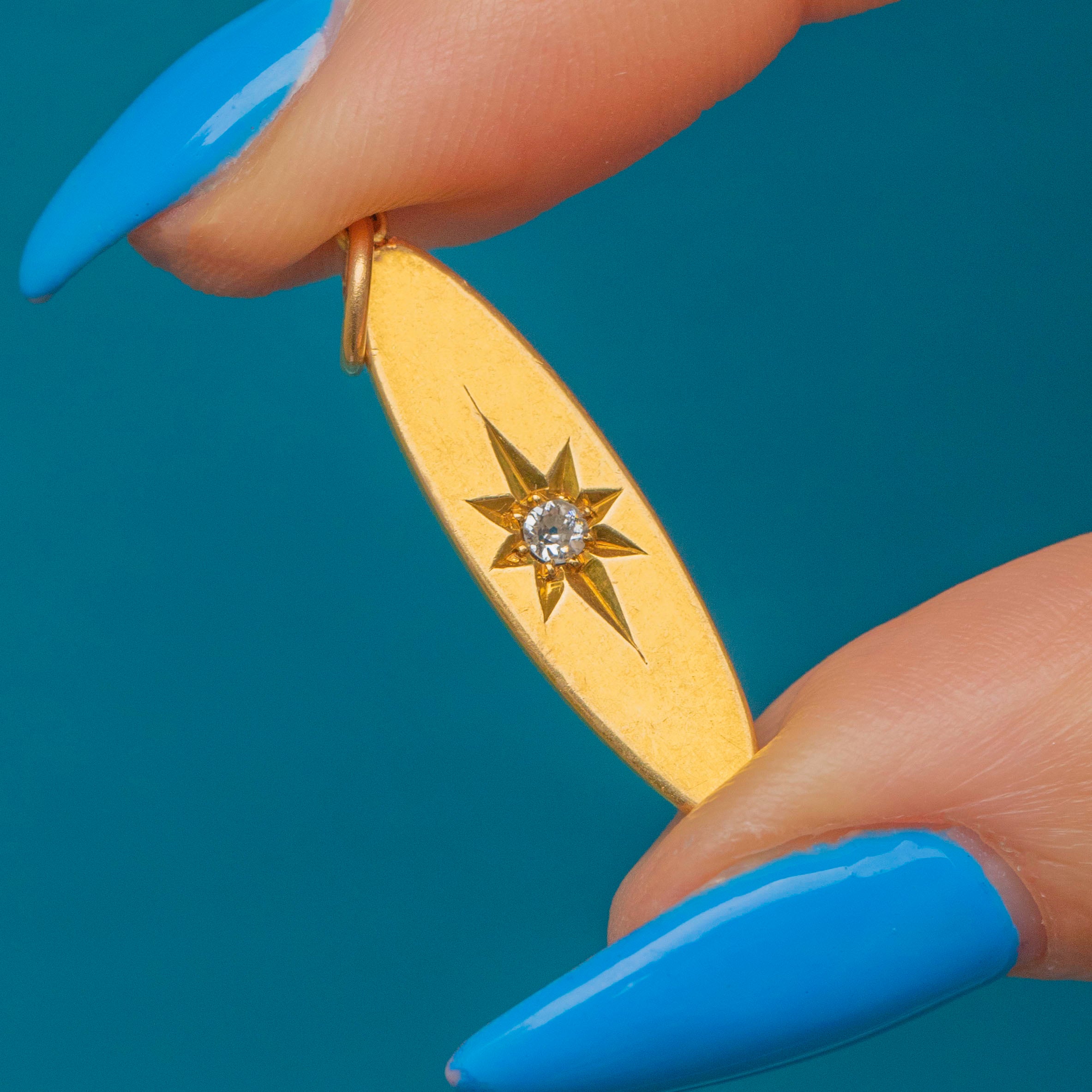 EXCELLENT. This antique 18ct Gold star set Diamond pendant is in wonderful condition. Her Diamond is securely set within her buttery warm 18ct Gold setting. With a soldered jump-ring, this Victorian pendant would rest delicately from a fine chain and make a great versatile addition to your collection.