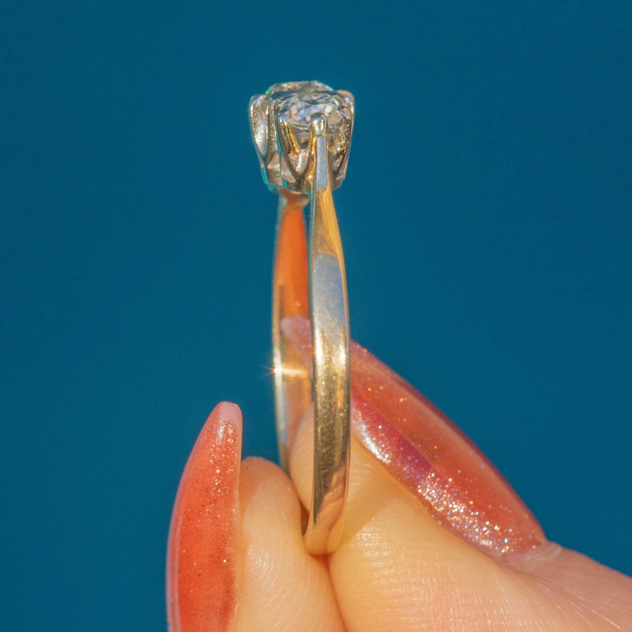 VERY GOOD-EXCELLENT. This antique 18ct Gold Diamond trilogy ring is in wonderful condition. Each Diamond is set securely and has a dazzling brilliance as they catch the light. There are some small fleabites to the Diamonds, however, this is commensurate with age and difficult to spot without a jeweller's loupe. In great condition, she is a must-have!
