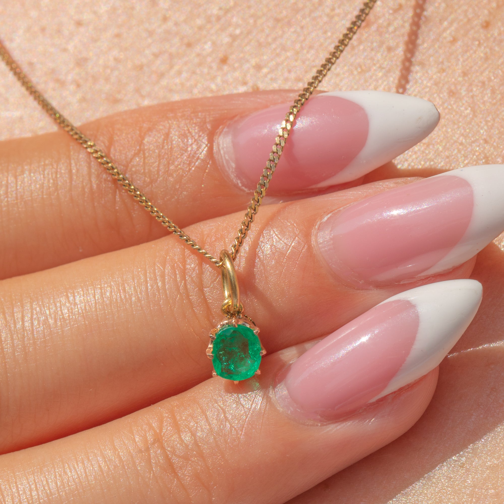 EXCELLENT: The Emerald is secure and displays bright, even colour. The Gold claw setting is in excellent condition, and the charm has been well preserved.