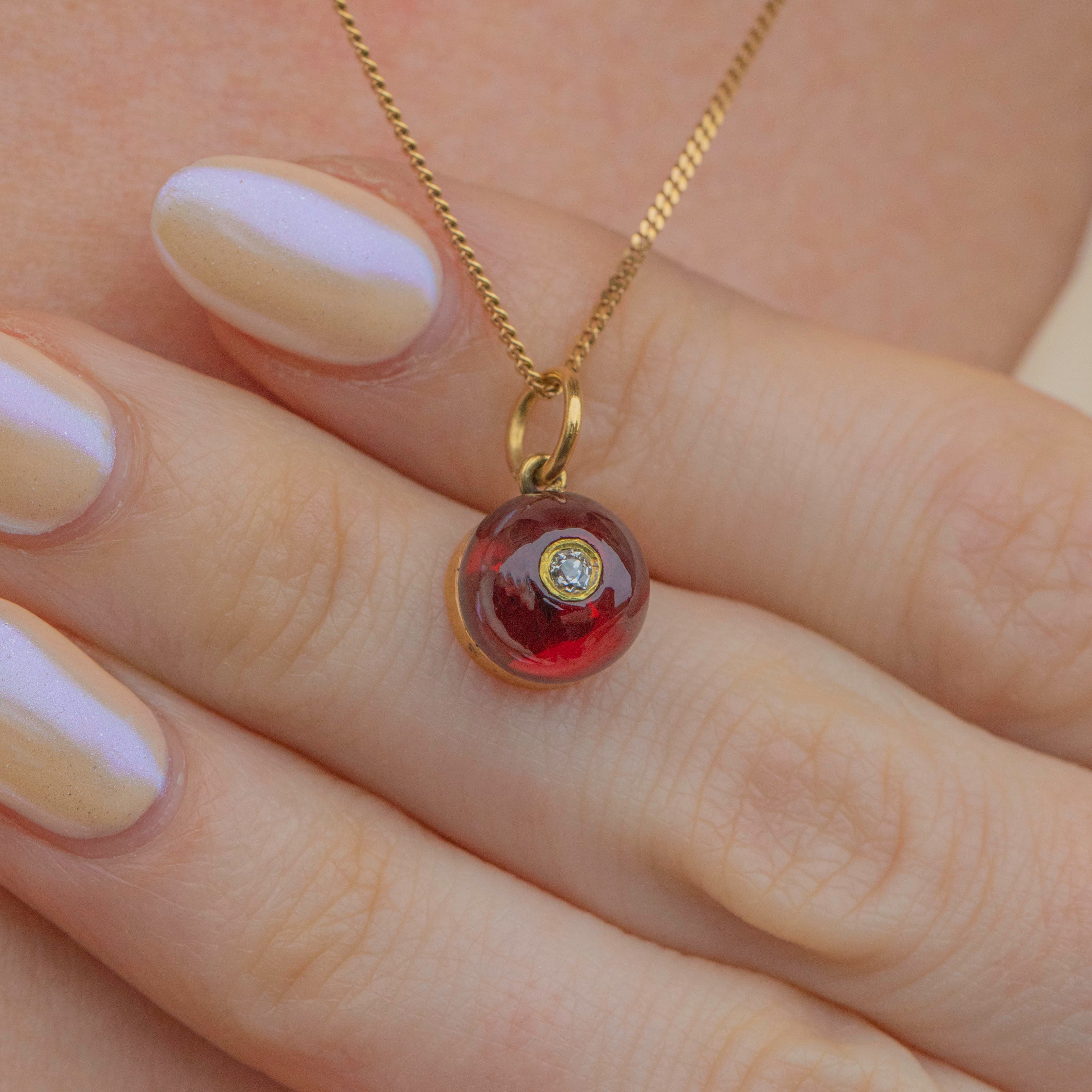 EXCELLENT. This antique 18ct Gold Garnet cabochon Diamond charm is in excellent condition. Her Garnet cabochon is free from any chips or scratches and has clearly been well cared for over the years. Her Diamond is securley set in the centre of the Garnet and is free from fleabites. The 18ct Gold bezel setting remains secure, glossy and bright!