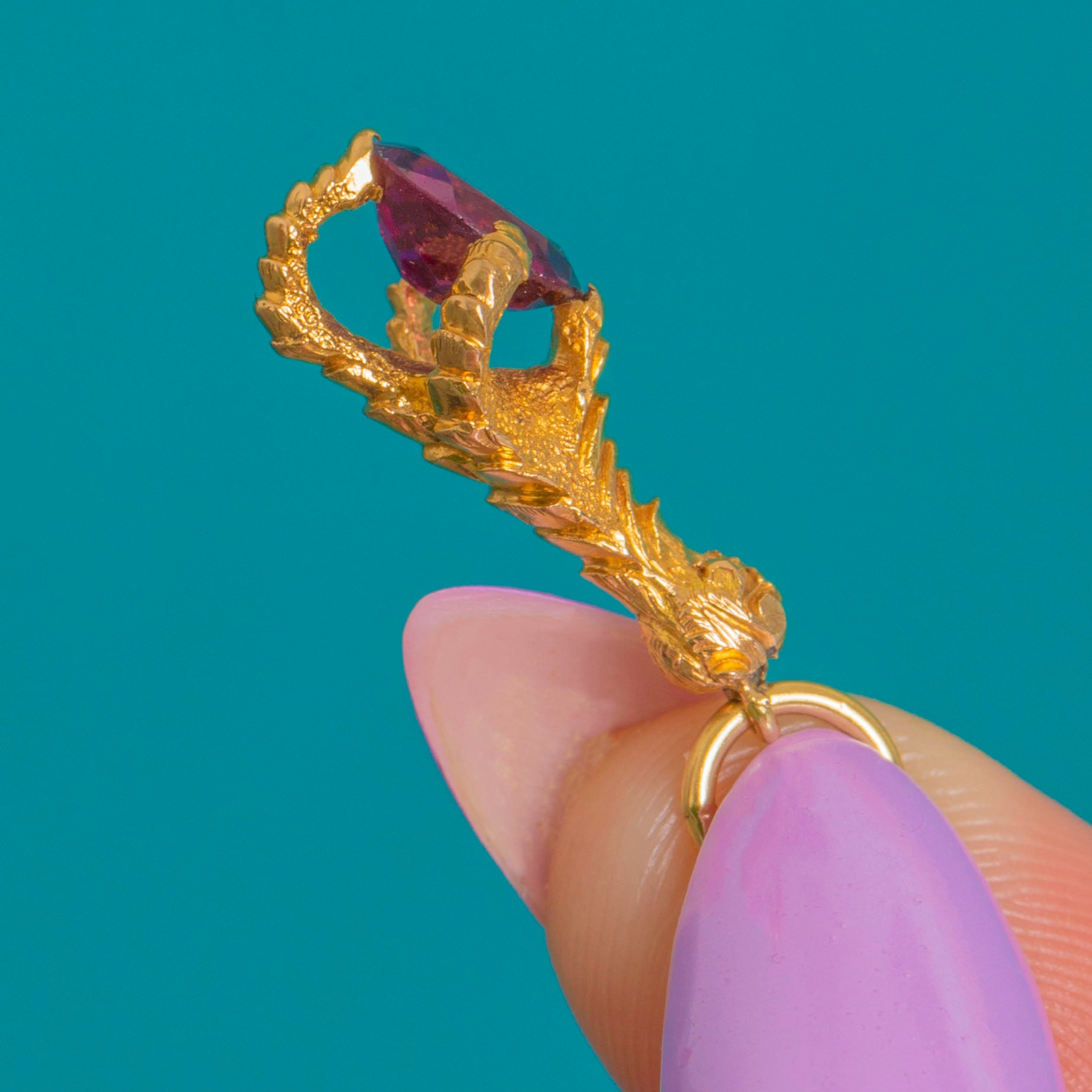 A delightful Victorian treasure, this 18ct Gold charm is sculpted as a naturalistic claw gently clasping a vivid oval Garnet. The three-dimensional figural form flows around the gemstone, with defined talon-like terminals and subtle texturing that accentuates the warm glow of high-carat Gold.