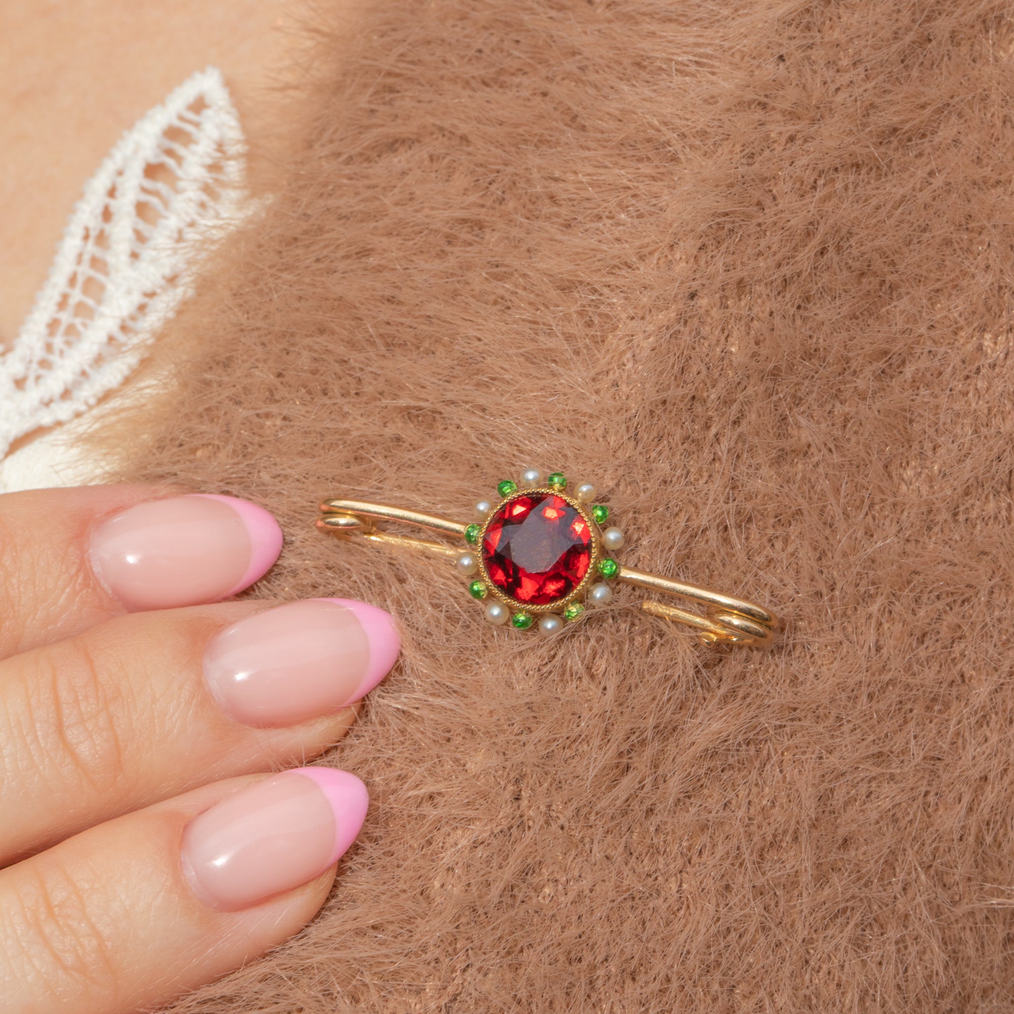 EXCELLENT. We are pleased to offer this antique 18ct Gold Garnet and Green enamel brooch in excellent condition! The Garnet is secure within it setting with no damage to the facets to note, surrounded by Pearls and Enamel which are fimly affixed to the bezel setting. The pin securely sits in the c-clasp allowing you to wear with the utmost confidence!