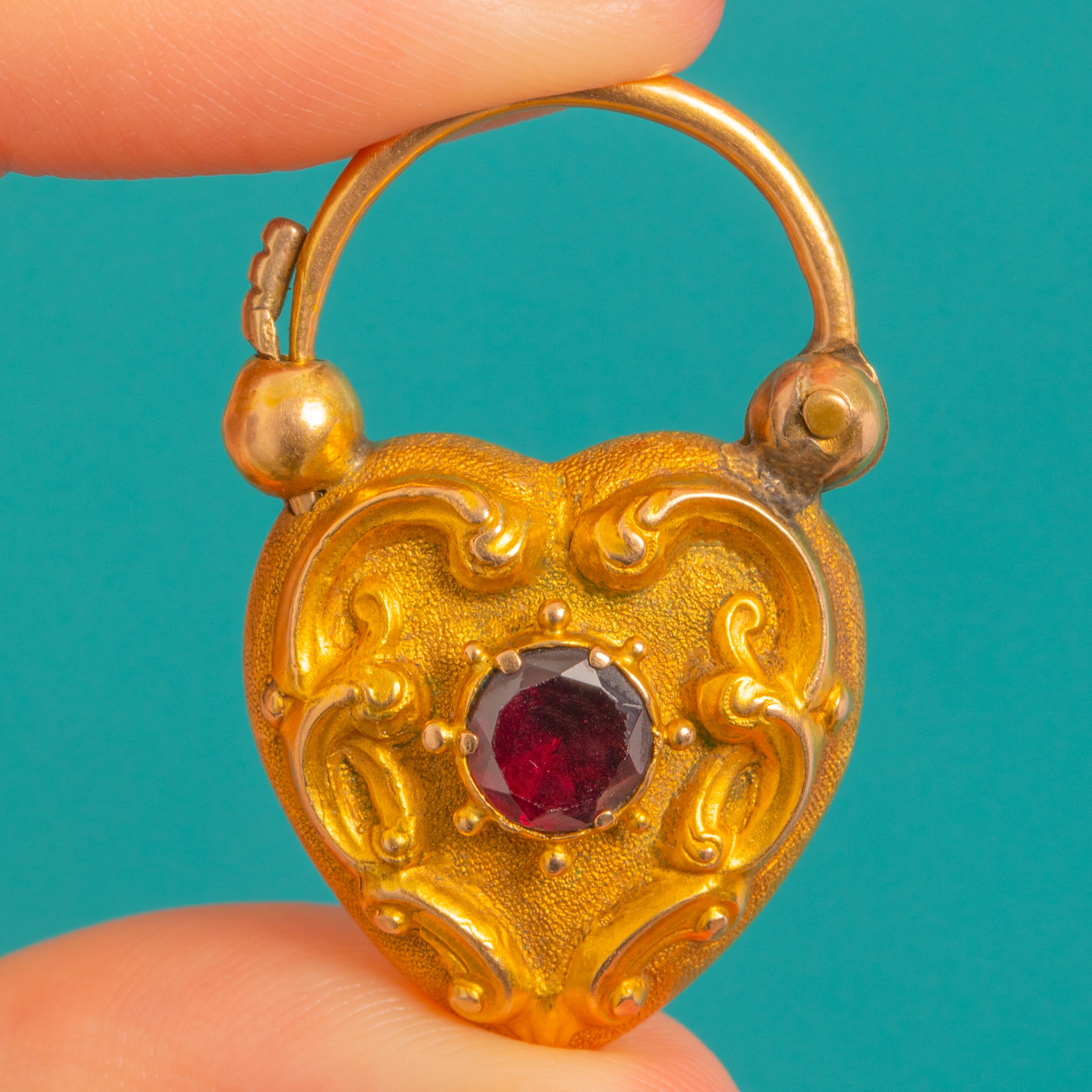 Romance and craftsmanship entwine in this Victorian 18ct Gold heart padlock, richly ornamented with scrolling foliate motifs over a softly textured ground. At the centre sits a round Garnet of deep, wine-red hue that glows against the warm Gold, its bezel framed with delicate beaded accents for a refined, heirloom feel.