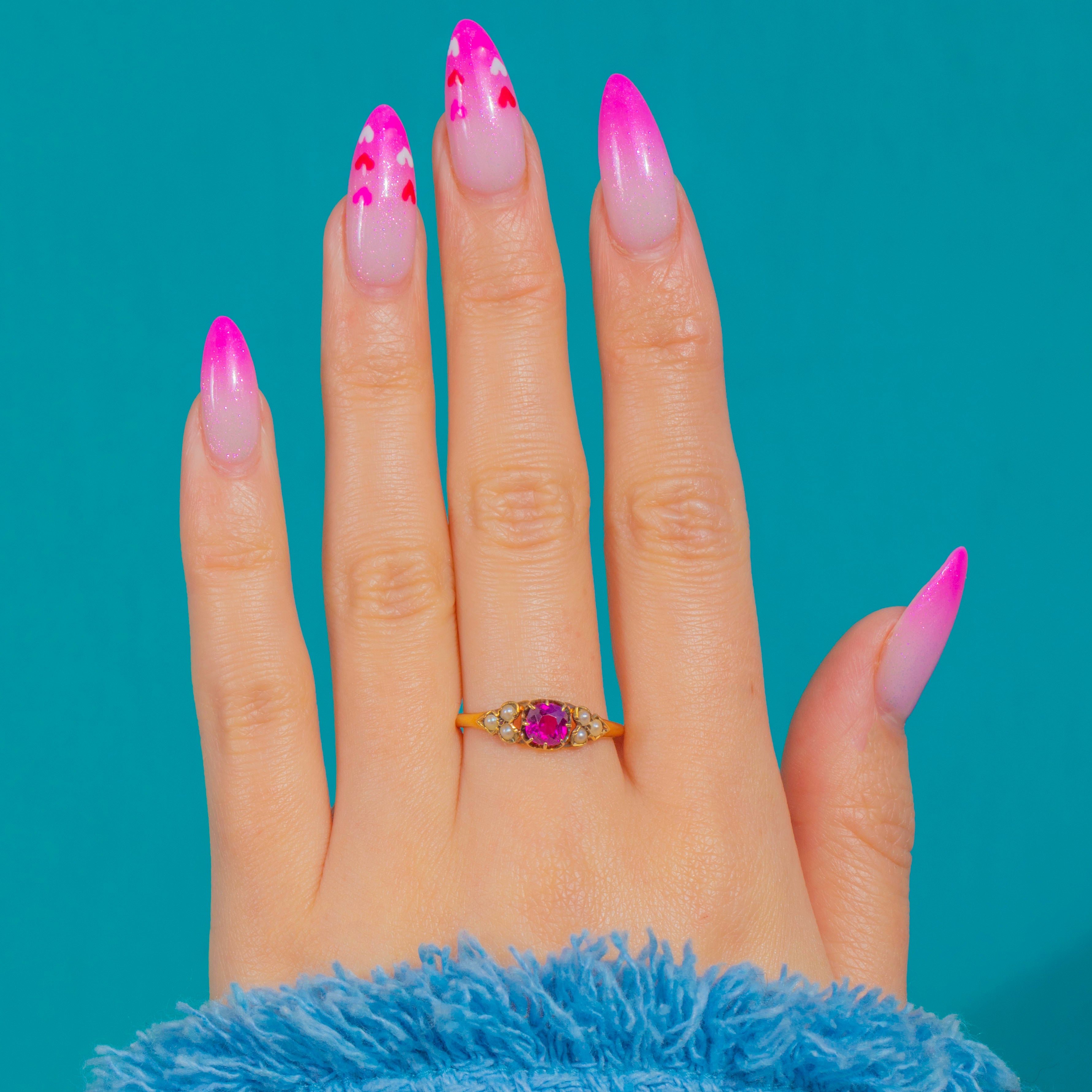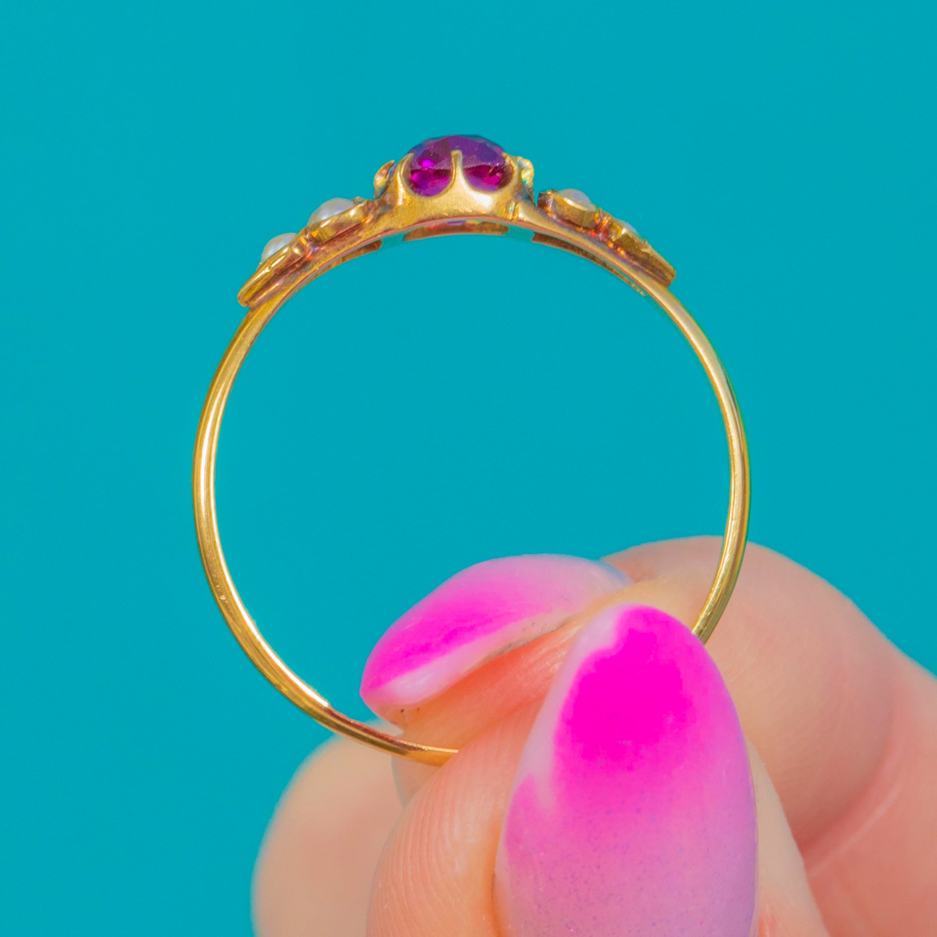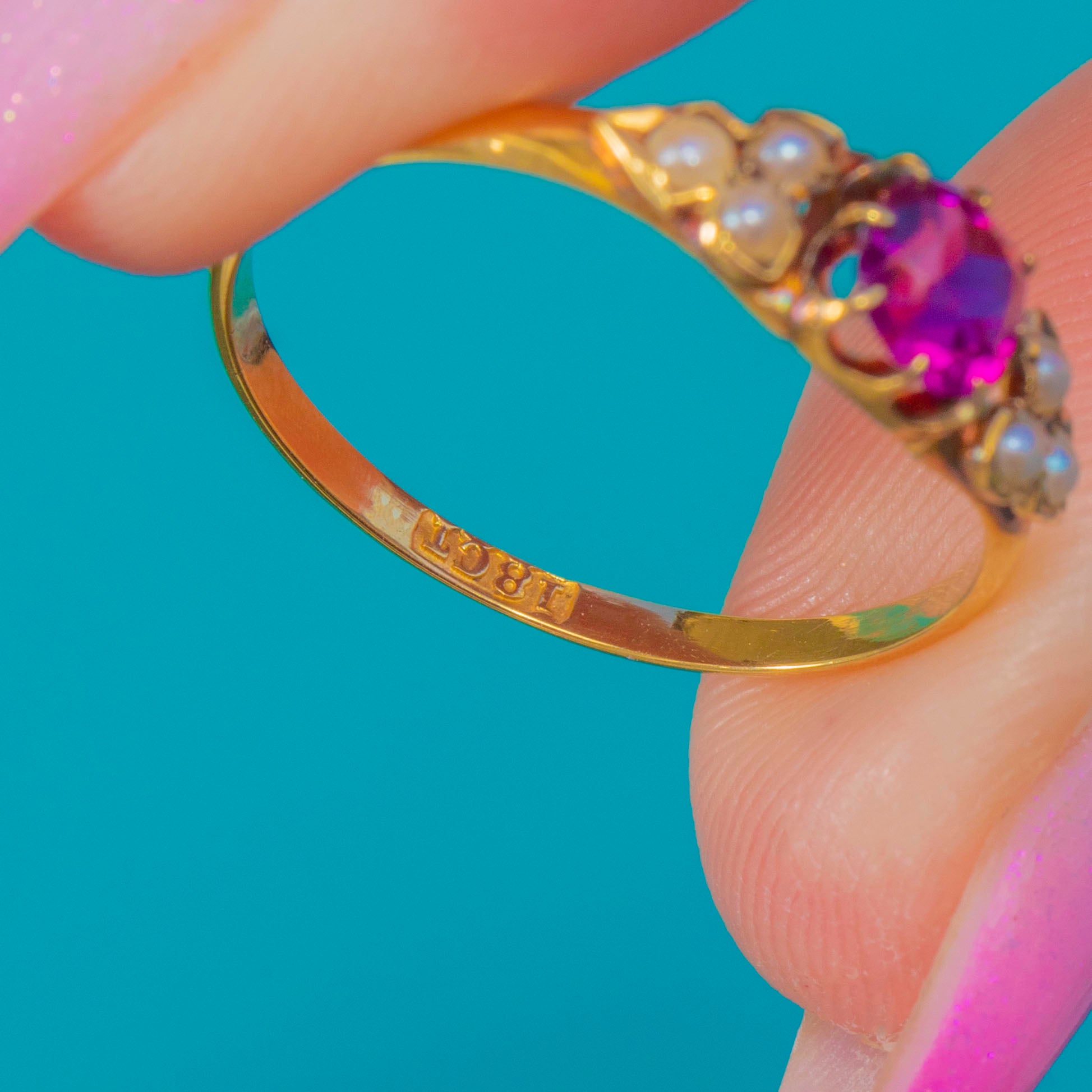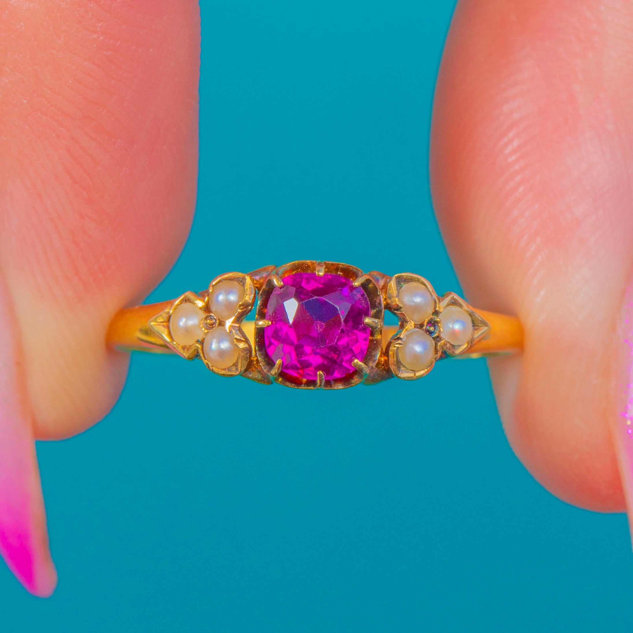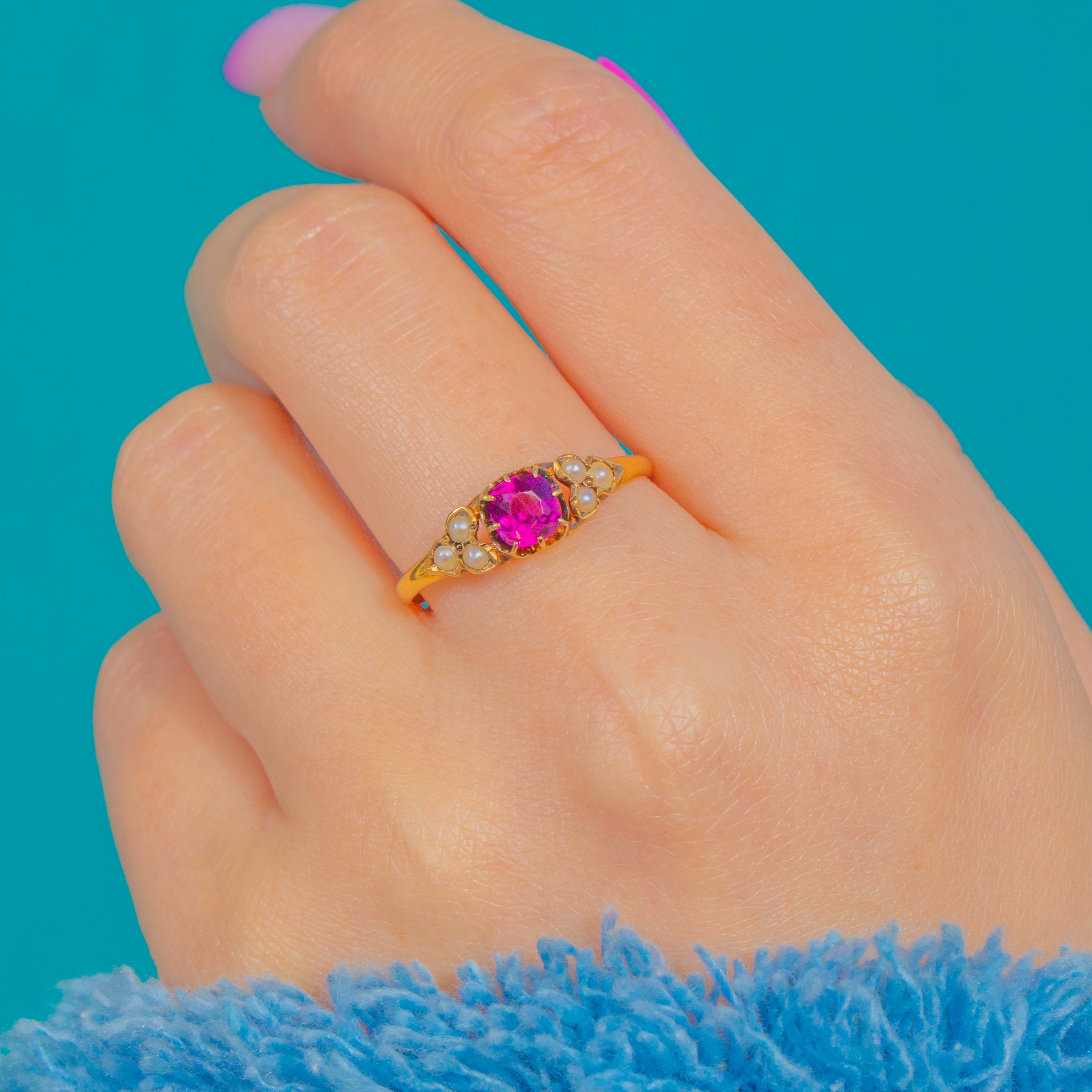 Pretty as a posy, this Victorian 18ct Gold ring centres a bright magenta-pink Garnet framed by trefoil clusters of creamy Seed Pearls to each shoulder. Delicate and romantic, the low setting and slim, tapering shank give a graceful silhouette that sits beautifully on the hand.