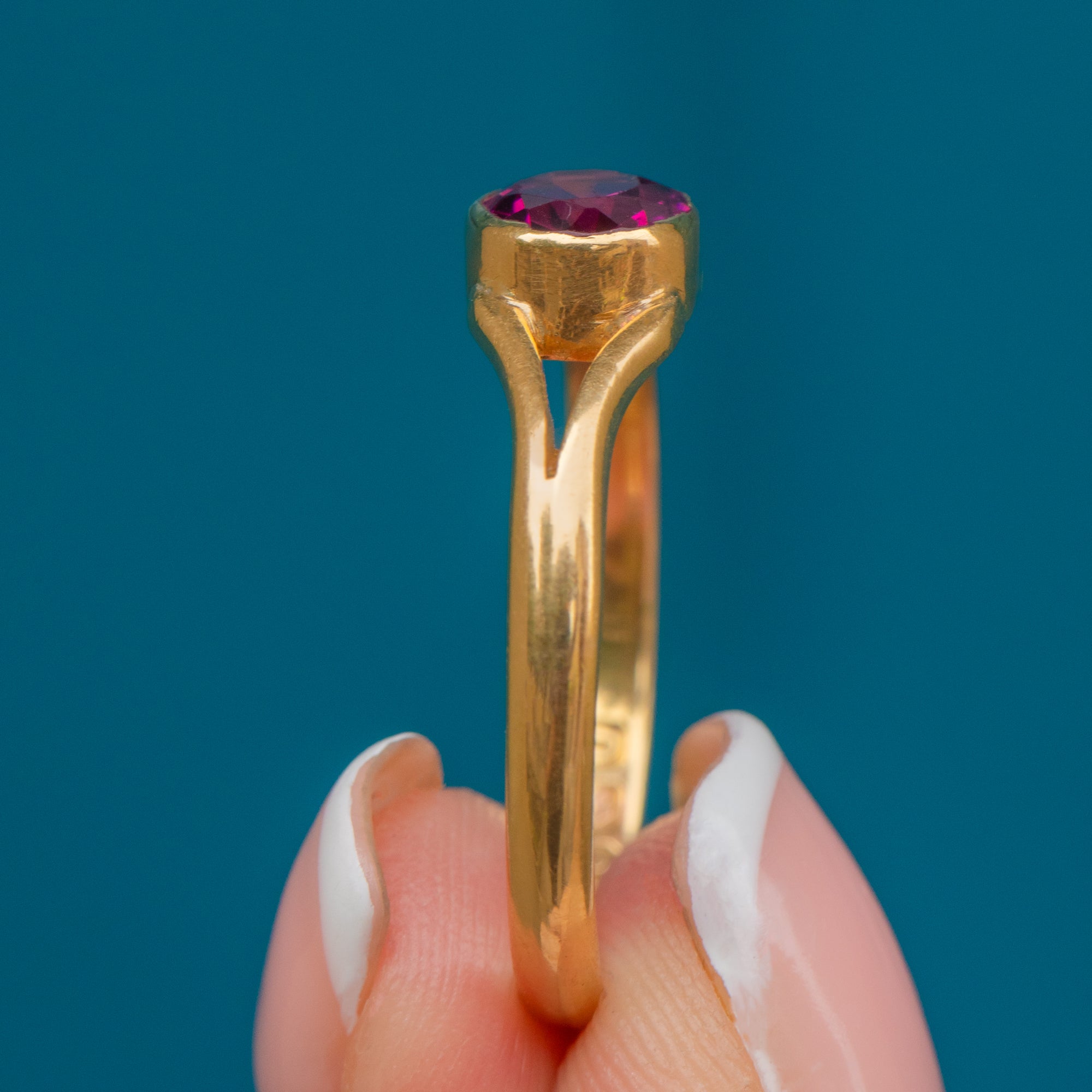 A glorious antique 18ct Gold Garnet solitaire ring, boasting a deliciously juicy Garnet, embraced in a sleek bezel setting. Complemented by a glossy, fully hallmarked English 18ct Gold band, this antique Gold ring is a sumptuous sensation!