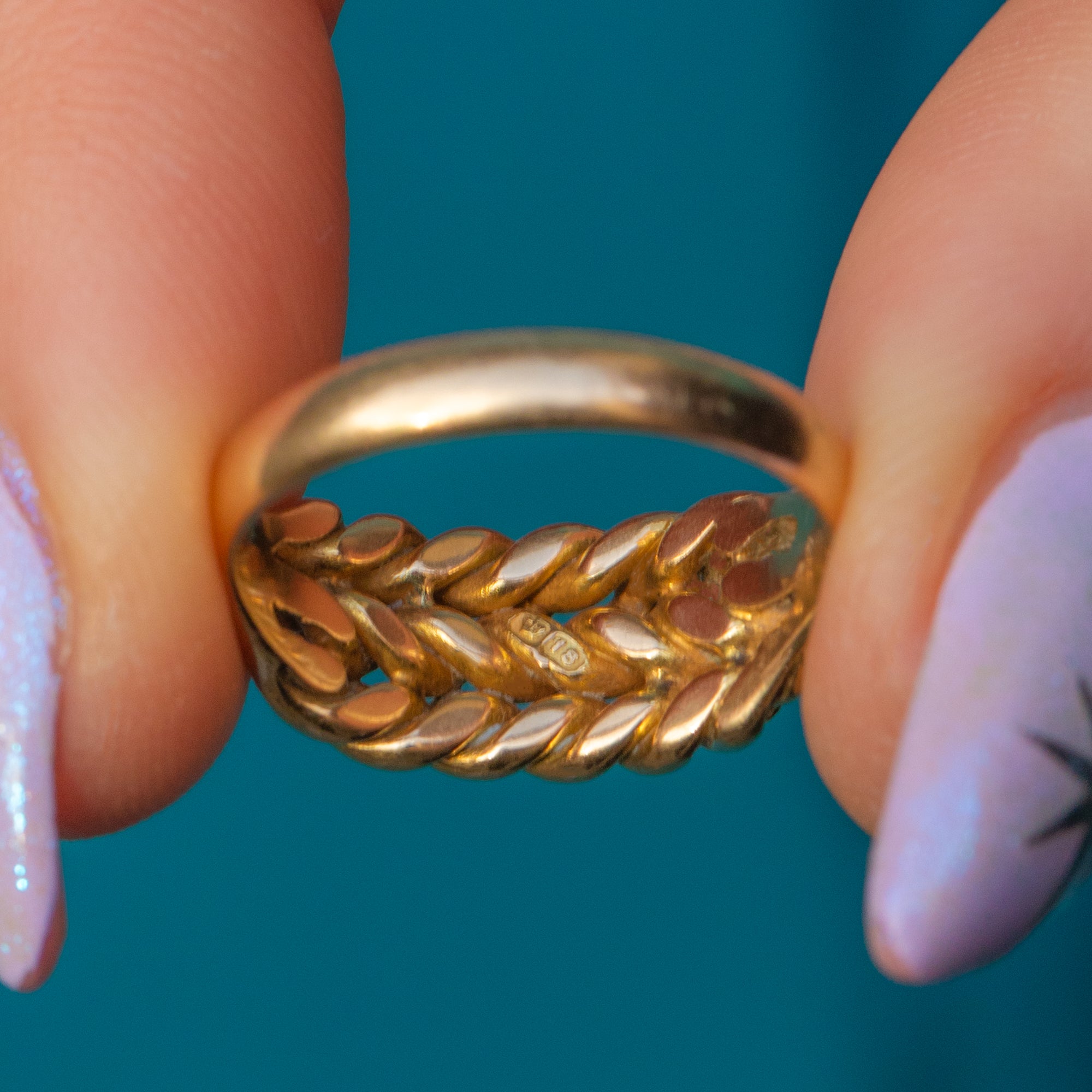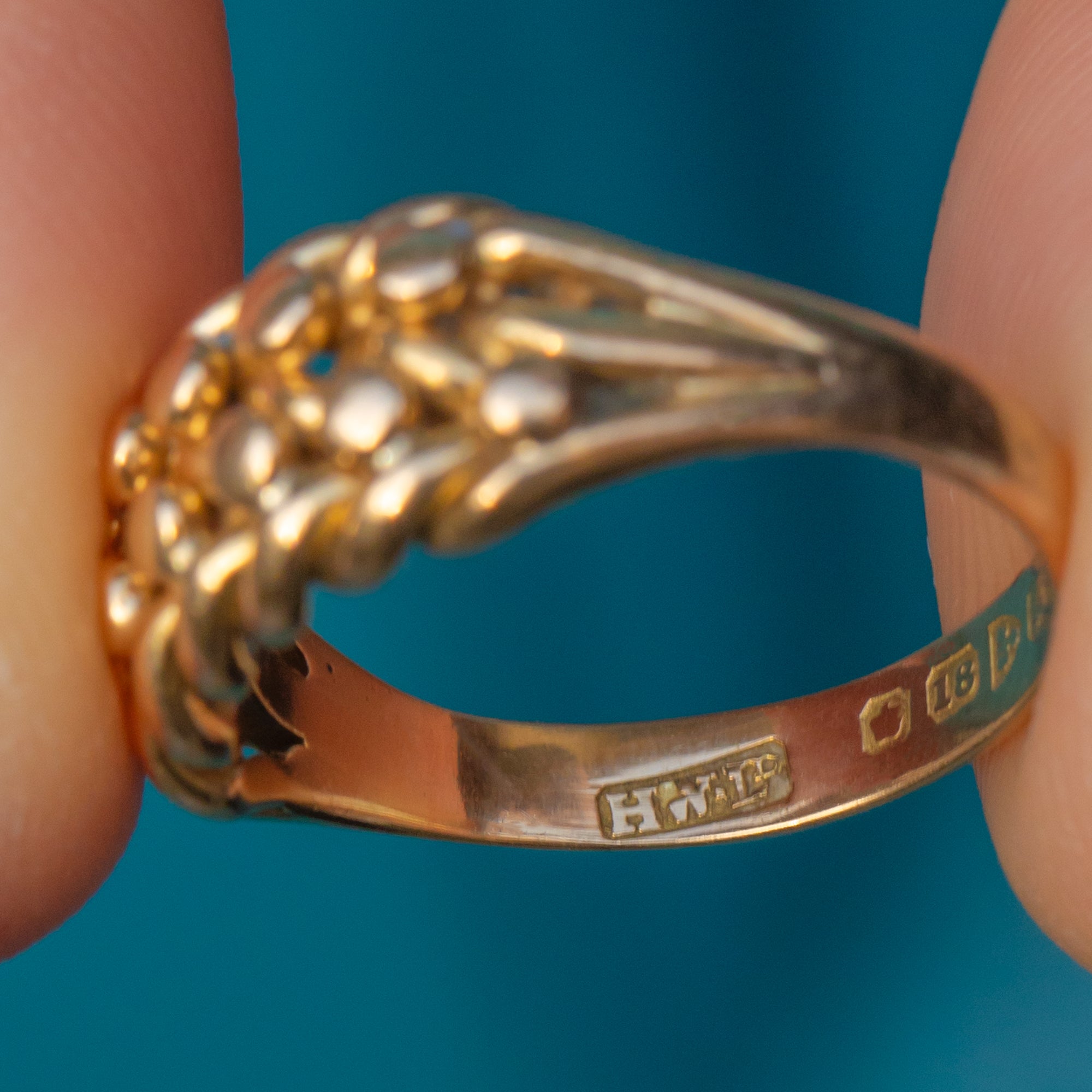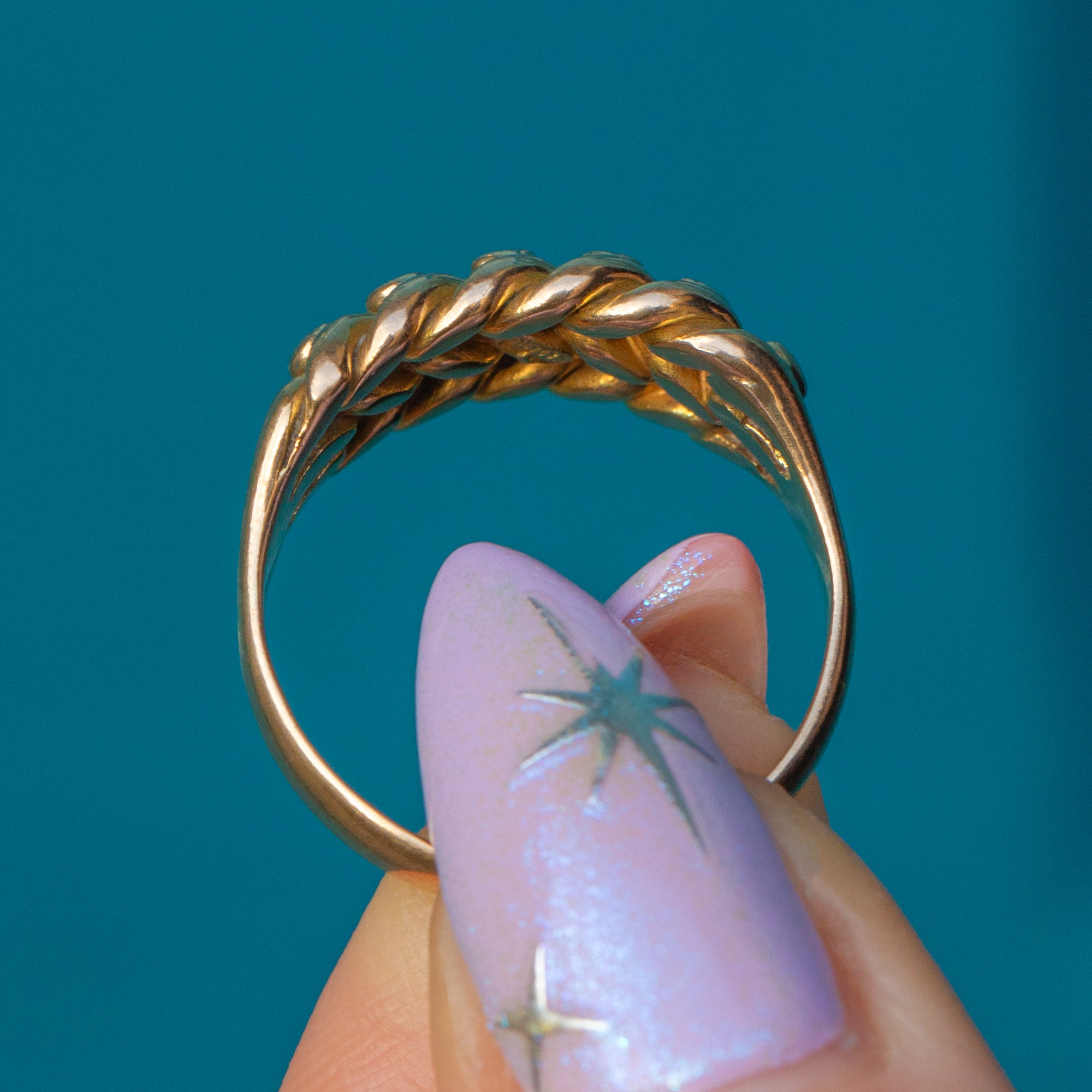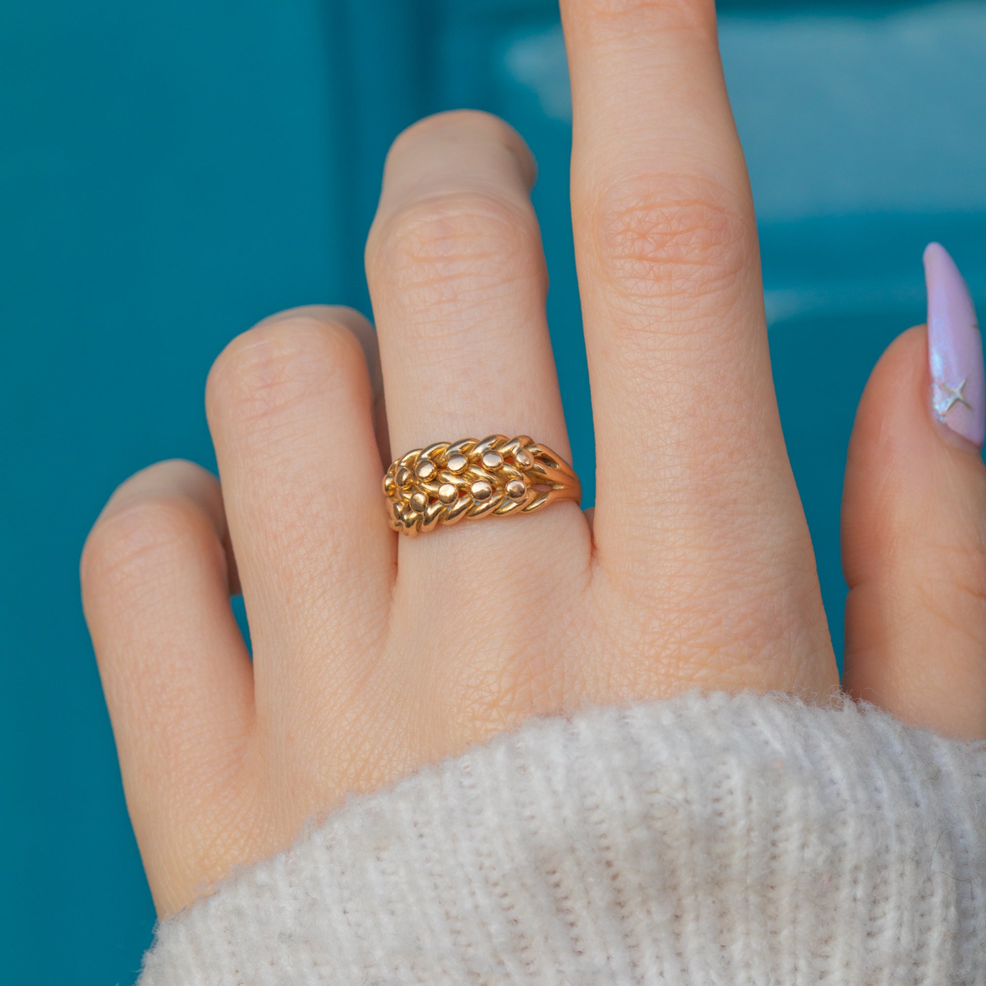 This is an incredible Edwardian 18ct Gold keeper ring! Crafted entirely from richly saturated 18ct Gold formed into intricately knotted rows with ball detailing, she's an eye-catching piece.